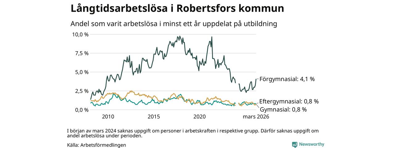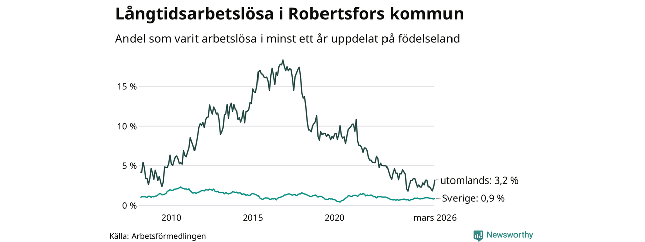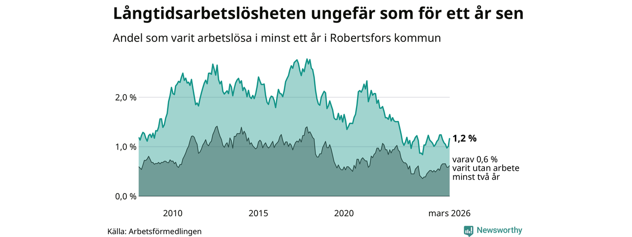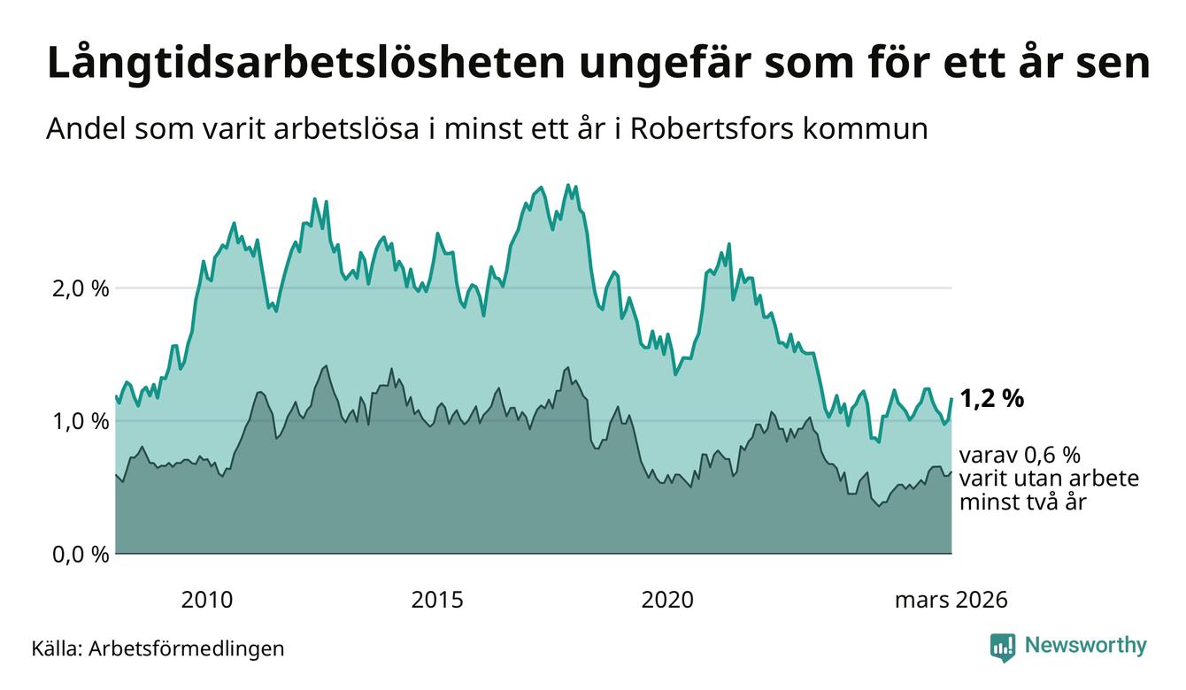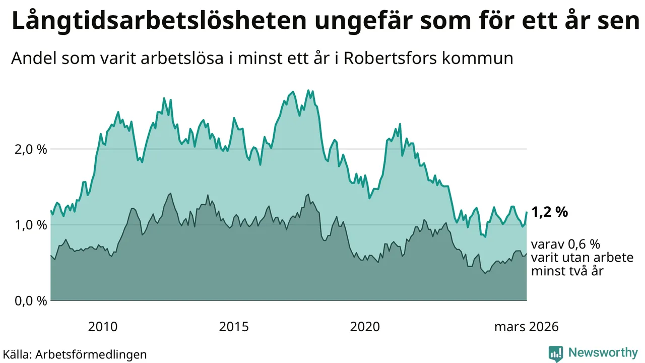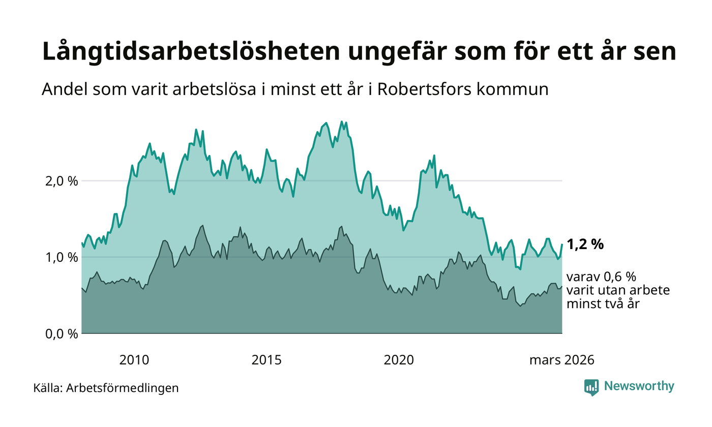I mars hade 36 Robertsforsbor varit arbetslösa i minst ett år, vilket är fem fler än månaden innan. 36 personer motsvarar 1,2 procent av arbetskraften i kommunen – andelen långtidsarbetslösa är ungefär på samma nivå som för ett år sedan. Robertsfors tillhör de kommuner som har lägst andel långtidsarbetslösa i hela landet just nu.