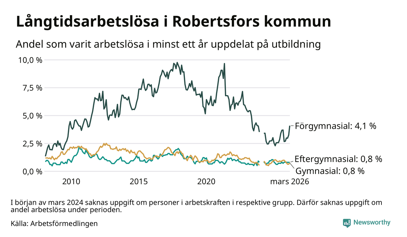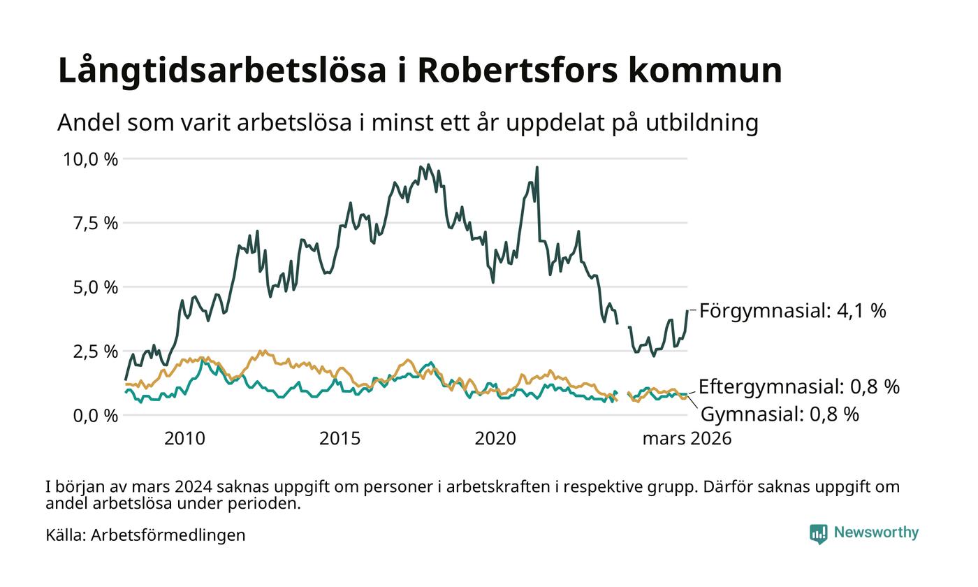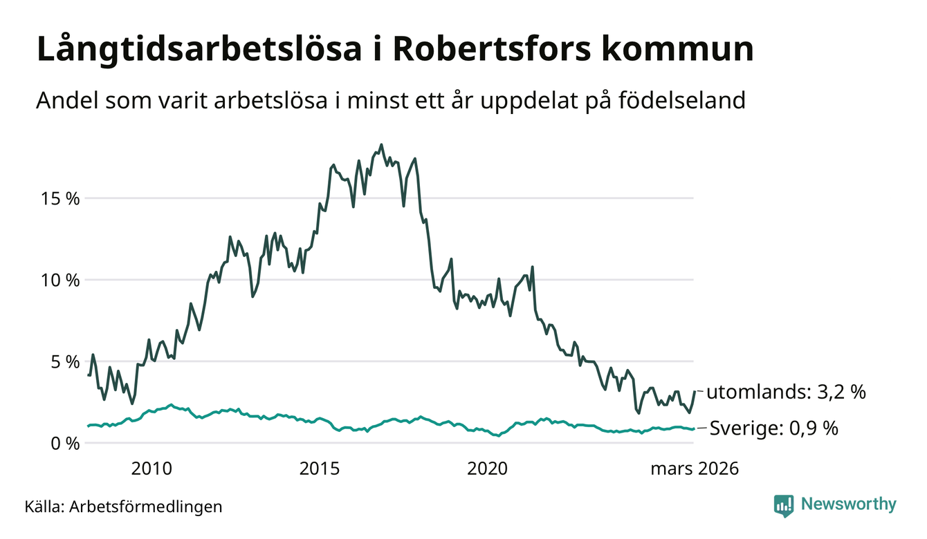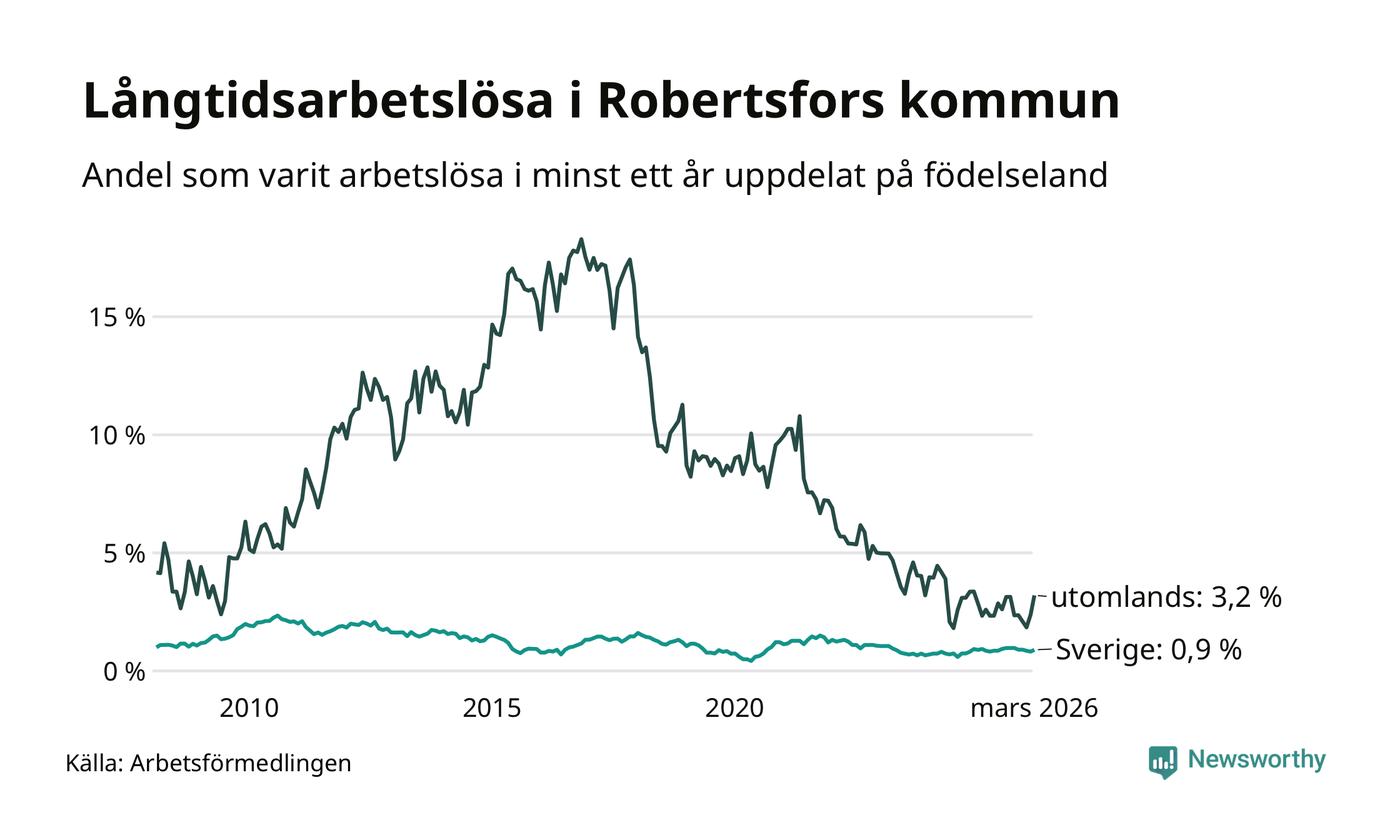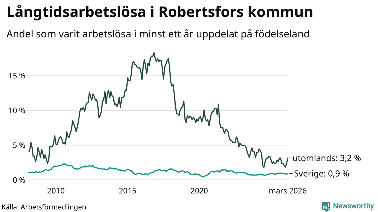 I mars hade 36 Robertsforsbor varit arbetslösa i minst ett år, vilket är fem fler än månaden innan. 36 personer motsvarar 1,2 procent av arbetskraften i kommunen – andelen långtidsarbetslösa är ungefär på samma nivå som för ett år sedan. Robertsfors tillhör de kommuner som har lägst andel långtidsarbetslösa i hela landet just nu.