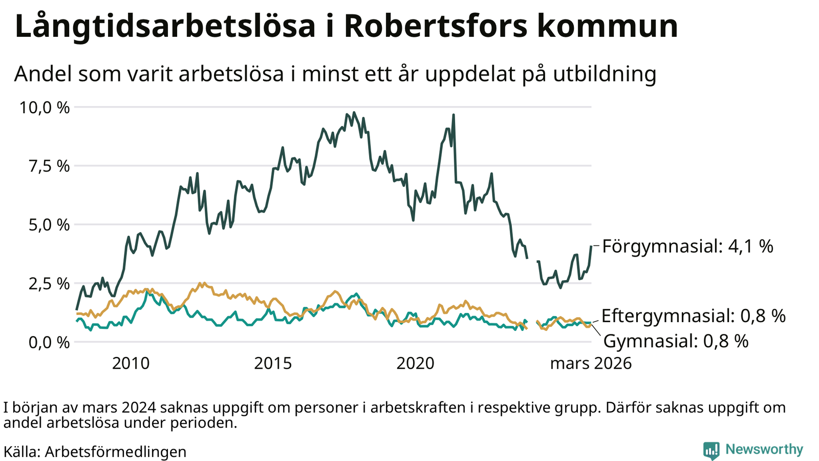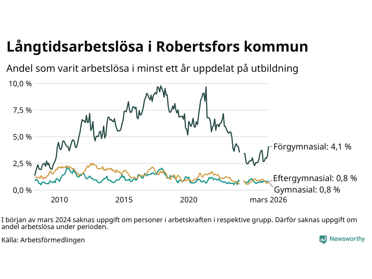 Andelen som varit utan arbete i minst ett år i Robertsfors var ungefär lika stor i mars jämfört med samma månad för ett år sedan. Det visar Arbetsfömedlingens senaste månadsstatistik.