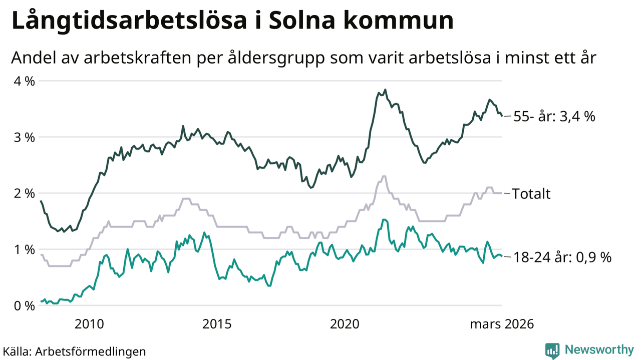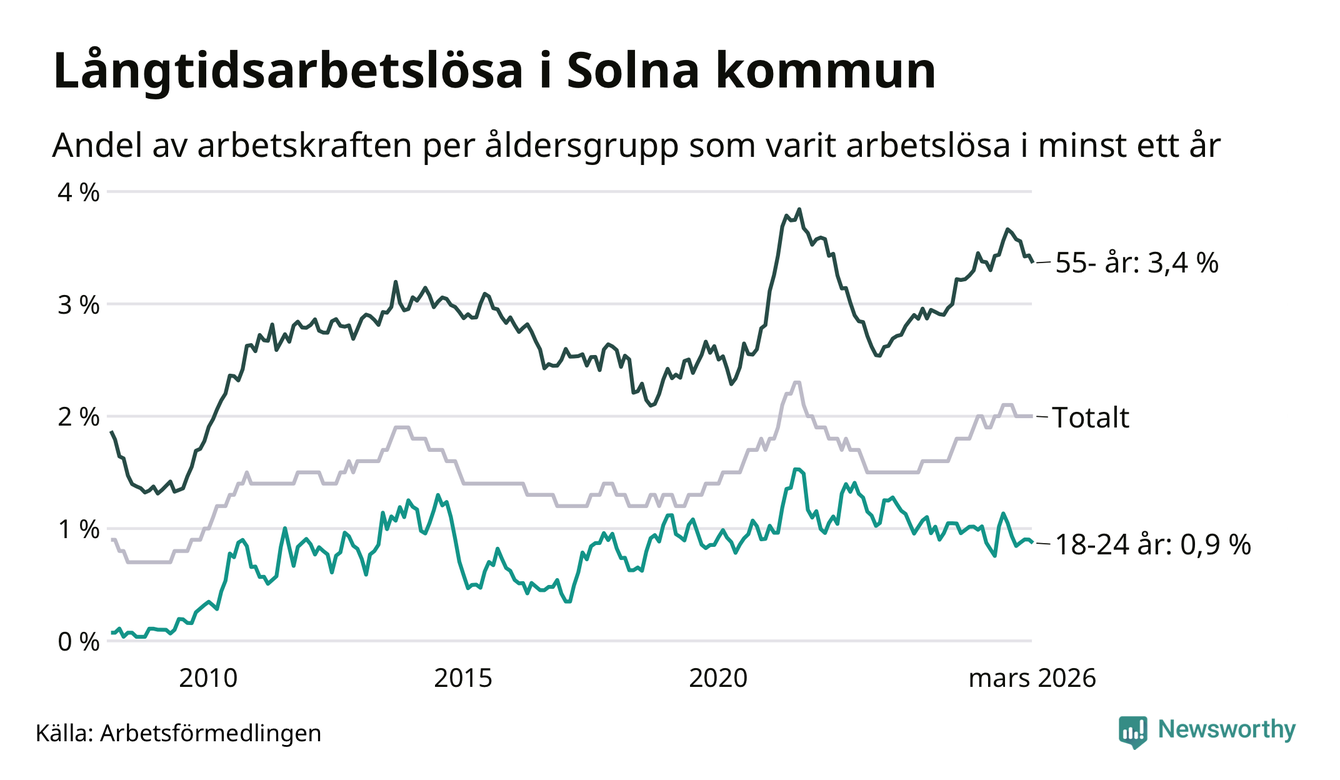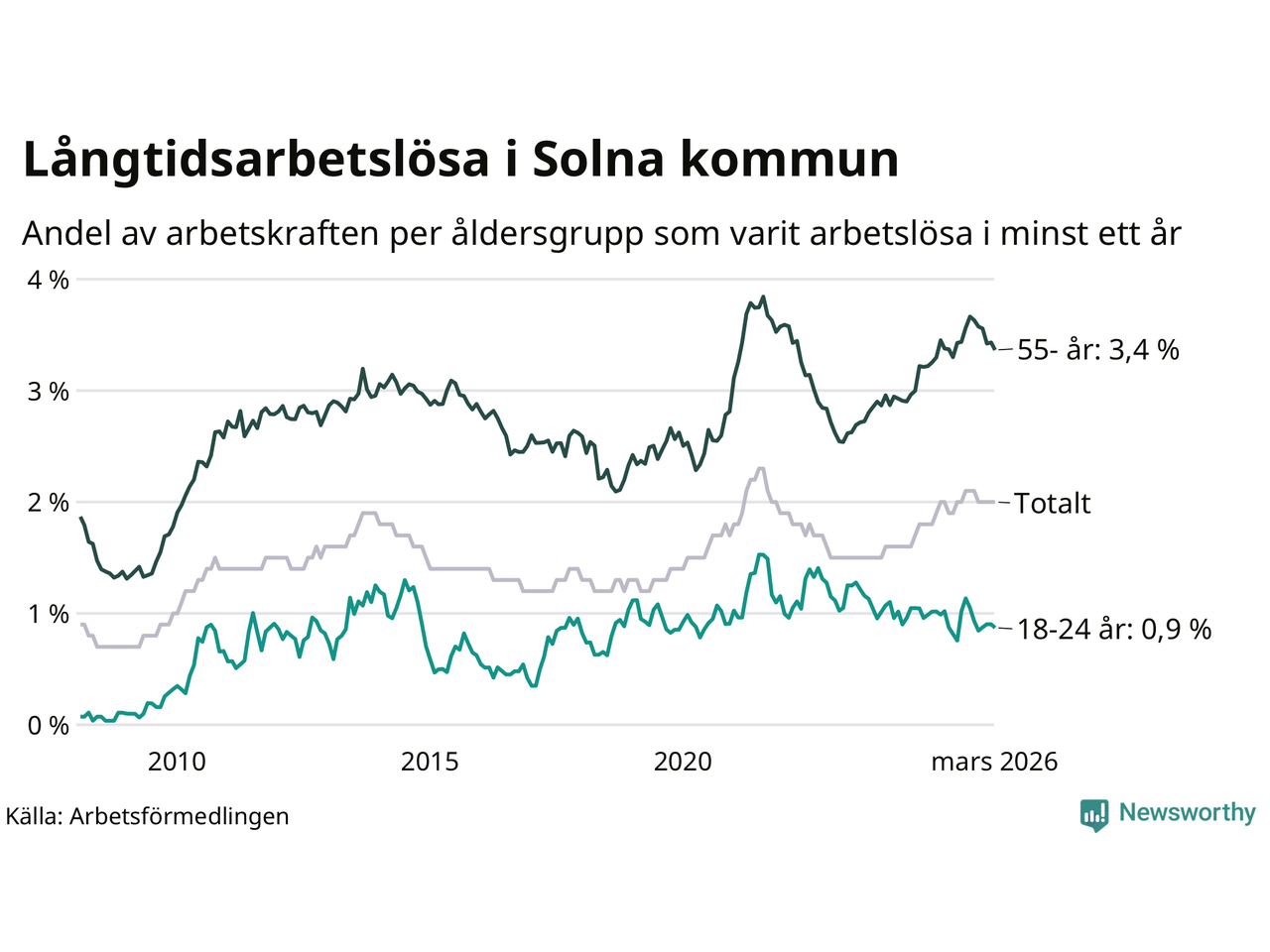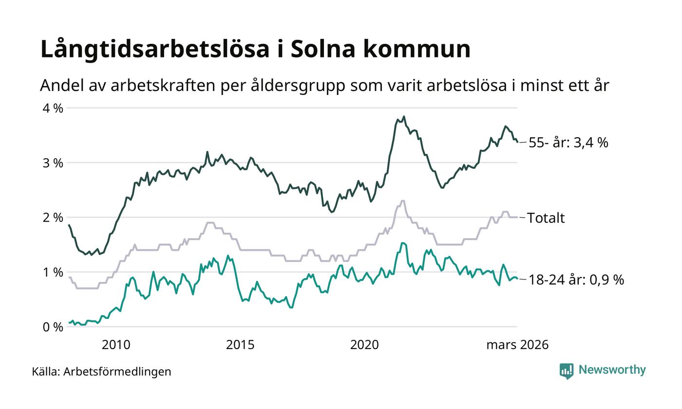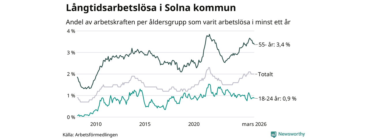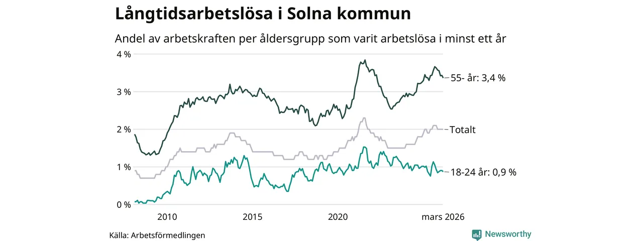 Av de 975 personerna som varit arbetslösa i mer än ett år i Solna kommun är 257 personer mellan 55 och 661 år och 30 är mellan 18 och 24 år. För den äldre gruppen är andelen arbetslösa 3,4 procent medan den i den yngre gruppen är 0,9 procent. Även i riket som helhet är långtidsarbetslösheten högre i gruppen äldre.