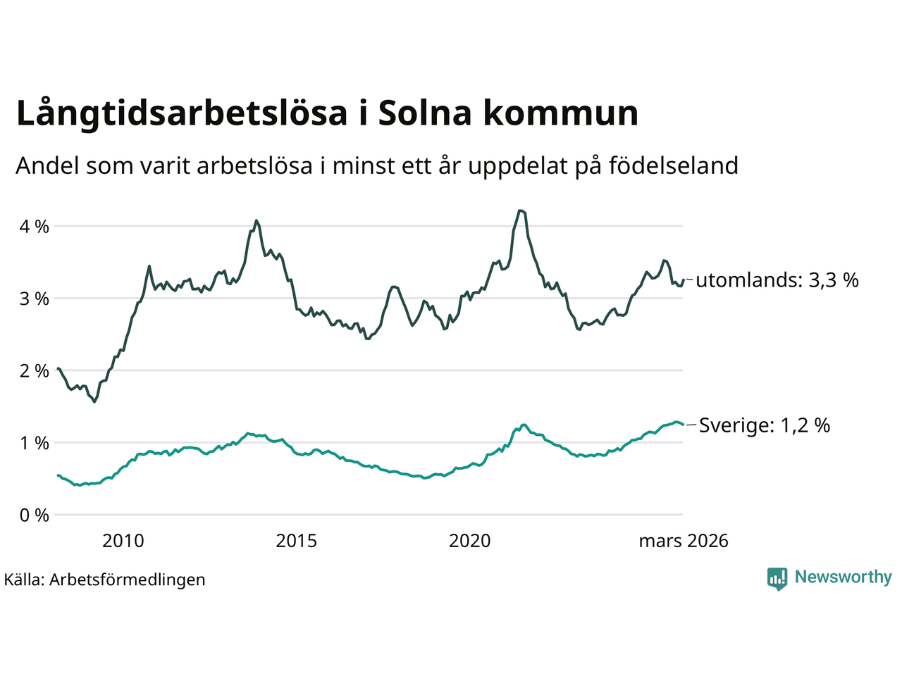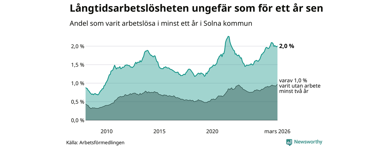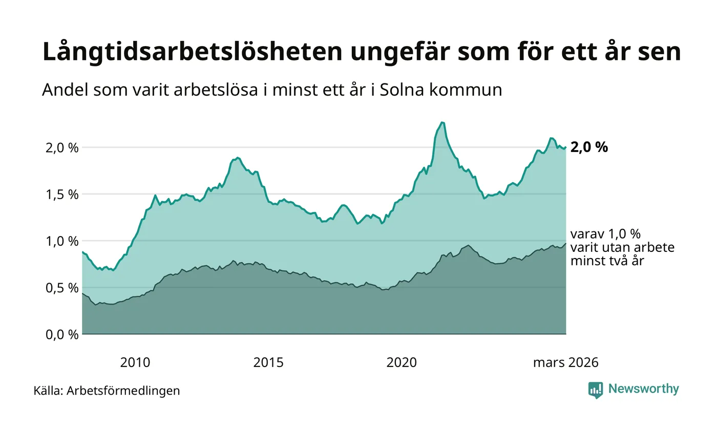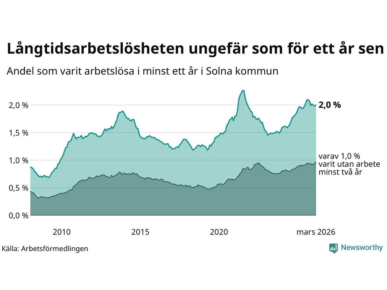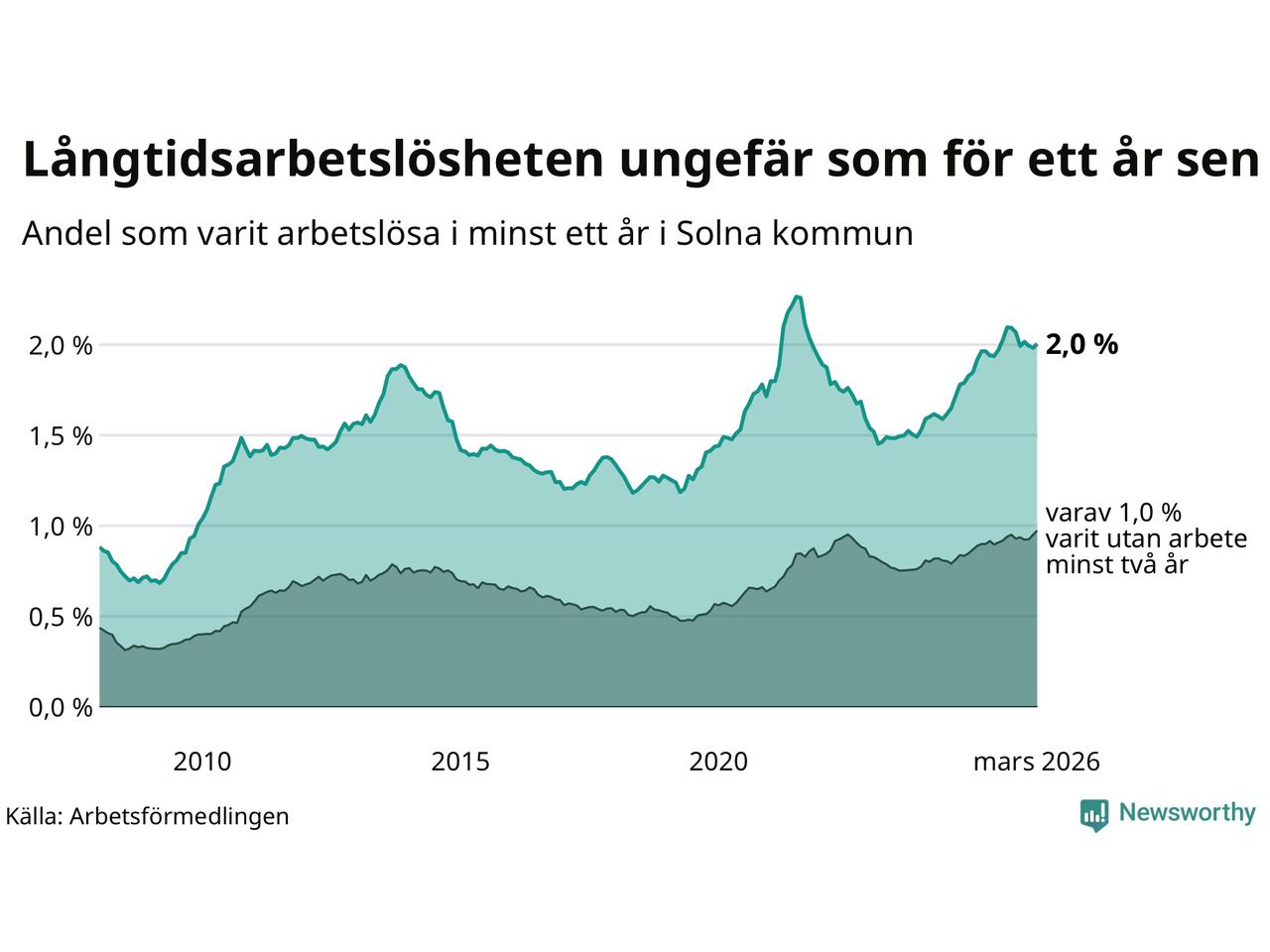 I mars hade 975 Solnabor varit arbetslösa i minst ett år, vilket är tolv fler än månaden innan. 975 personer motsvarar 2,0 procent av arbetskraften i kommunen – andelen långtidsarbetslösa är ungefär på samma nivå som för ett år sedan.
