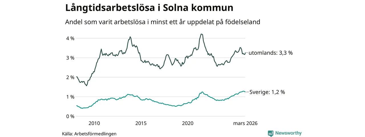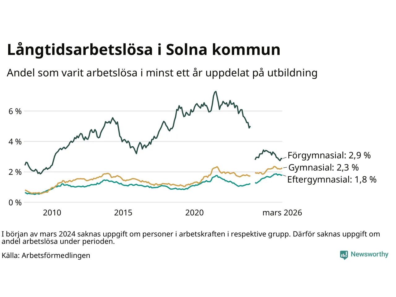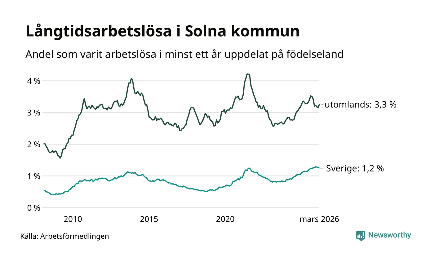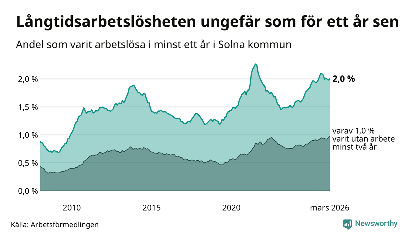 I mars hade 975 Solnabor varit arbetslösa i minst ett år, vilket är tolv fler än månaden innan. 975 personer motsvarar 2,0 procent av arbetskraften i kommunen – andelen långtidsarbetslösa är ungefär på samma nivå som för ett år sedan.