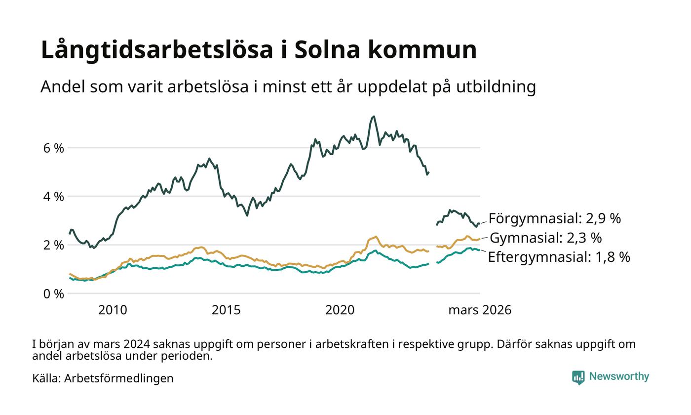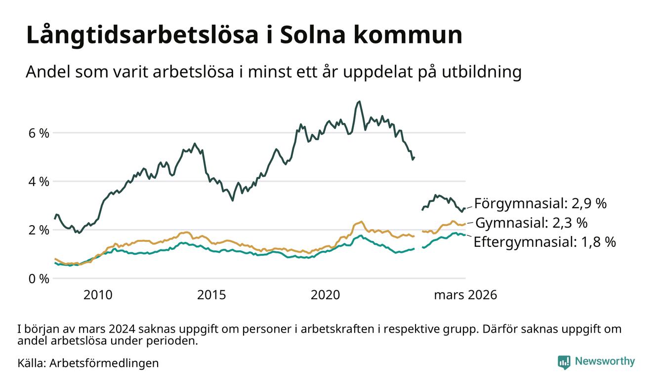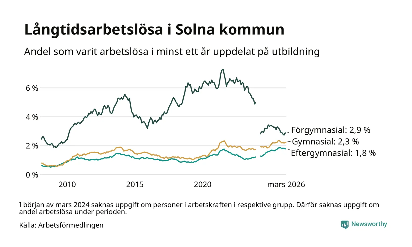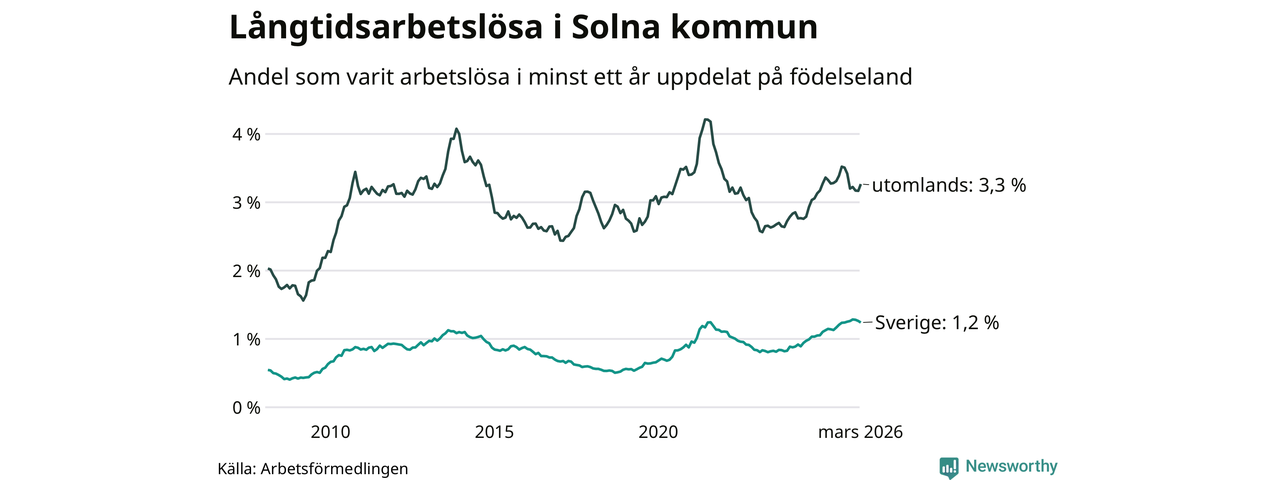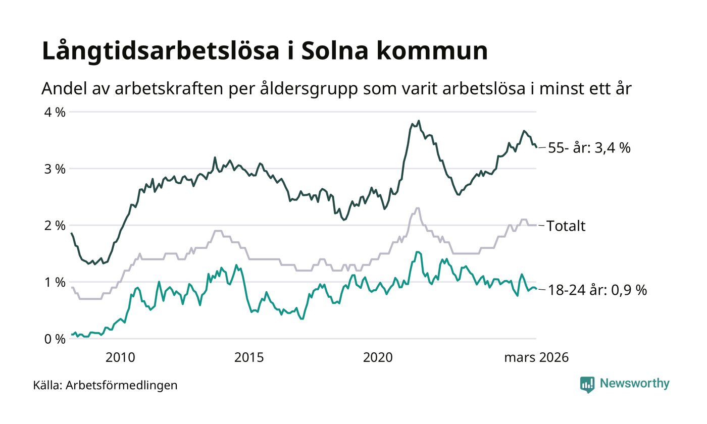 I mars hade 975 Solnabor varit arbetslösa i minst ett år, vilket är tolv fler än månaden innan. 975 personer motsvarar 2,0 procent av arbetskraften i kommunen – andelen långtidsarbetslösa är ungefär på samma nivå som för ett år sedan.