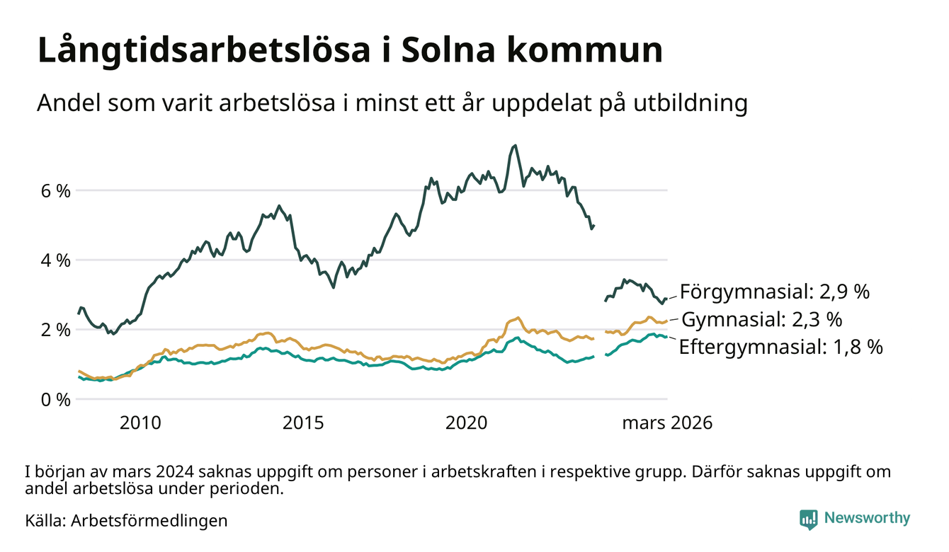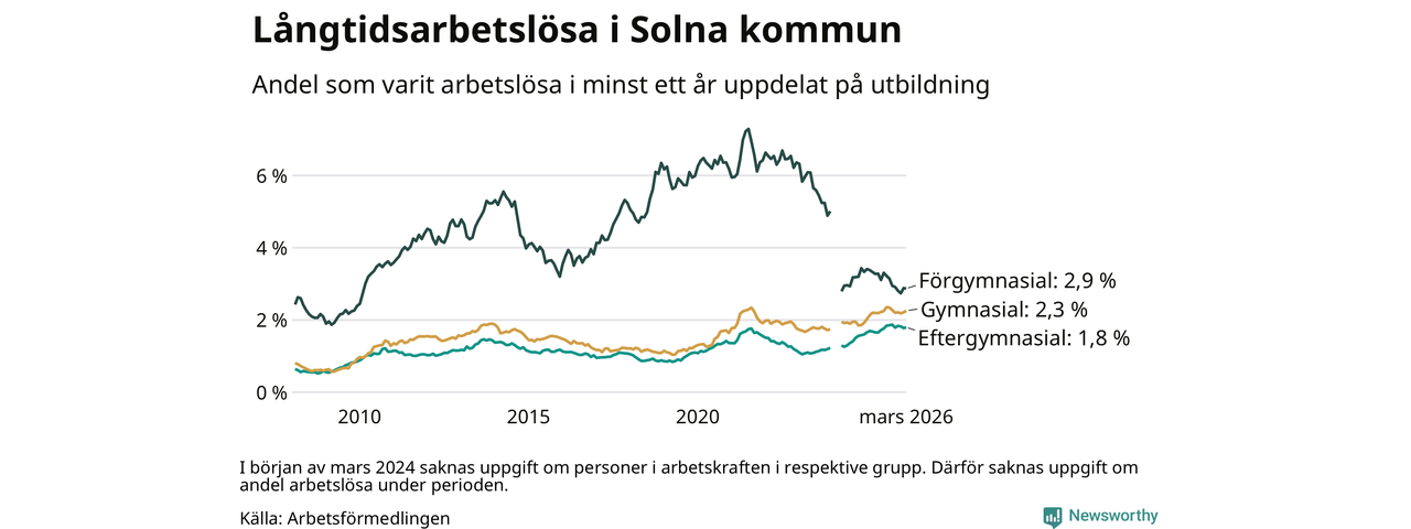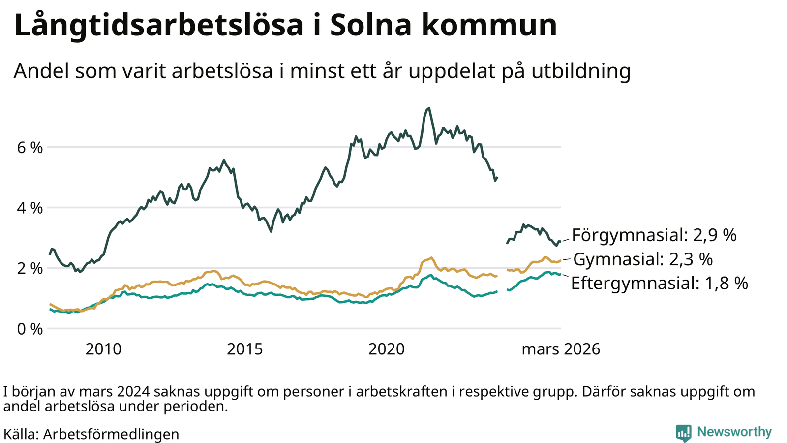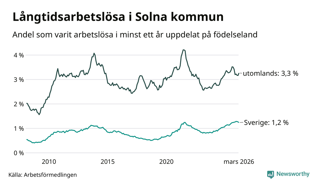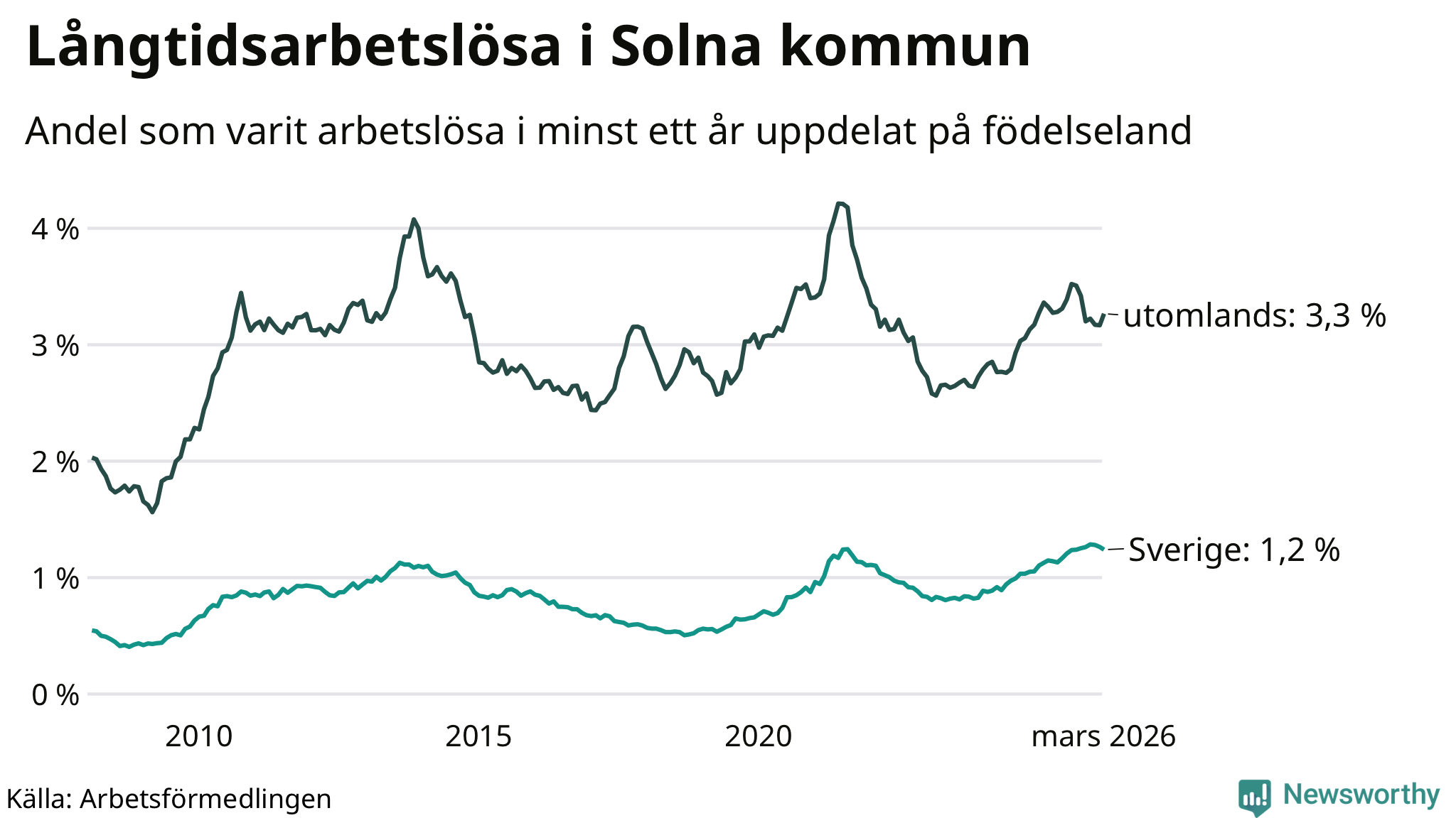 I mars hade 975 Solnabor varit arbetslösa i minst ett år, vilket är tolv fler än månaden innan. 975 personer motsvarar 2,0 procent av arbetskraften i kommunen – andelen långtidsarbetslösa är ungefär på samma nivå som för ett år sedan.