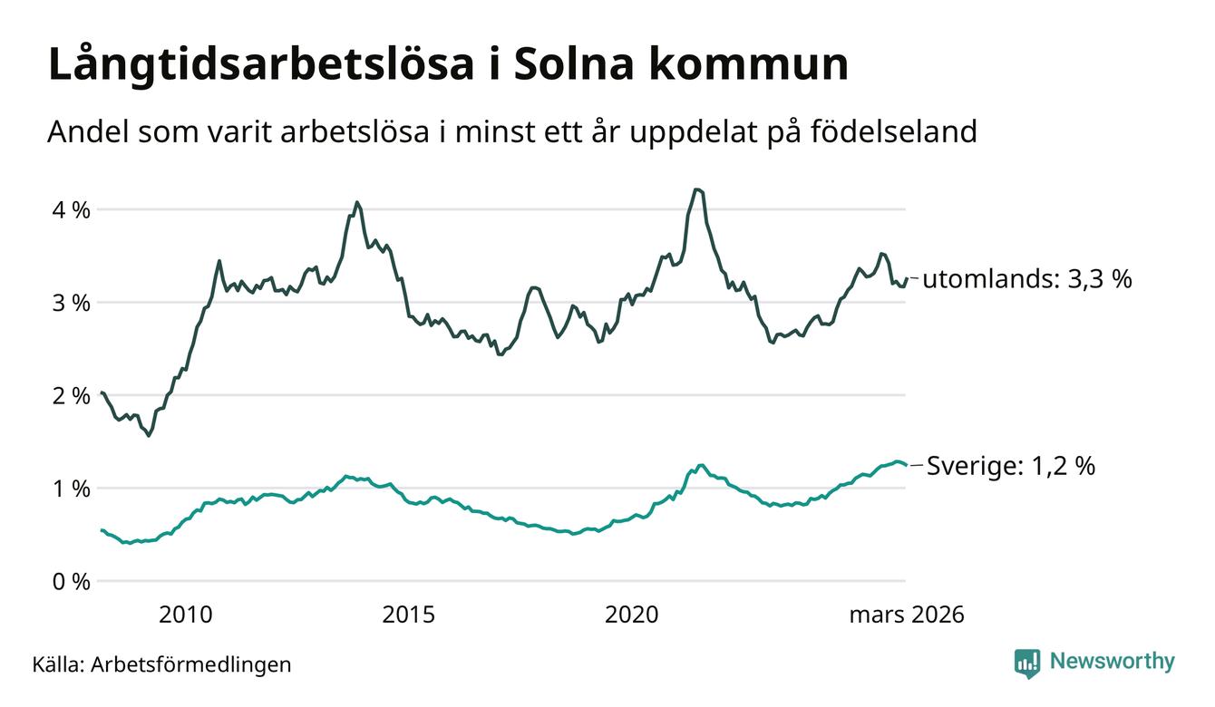 375 av de långtidsarbetslösa i Solna är födda i Sverige, medan 600 är födda utomlands. Det innebär att långtidsarbetslösheten bland Sverigefödda är 1,2 procent, medan den är tre gånger så hög – 3,3 procent – bland födda utomlands. Även i riket som helhet är arbetslösheten högre bland utrikesfödda.