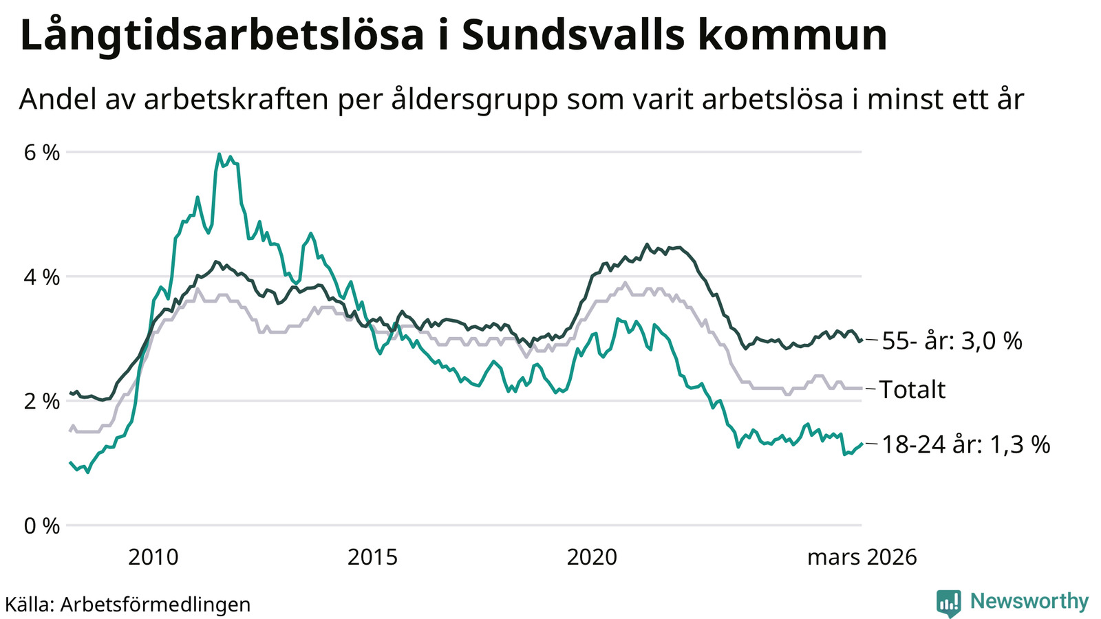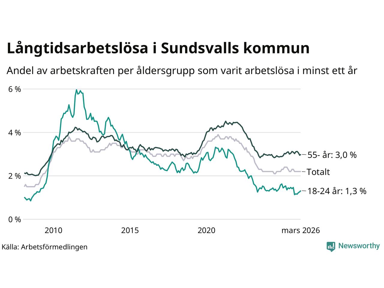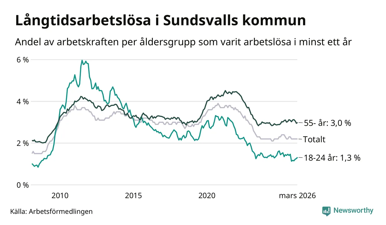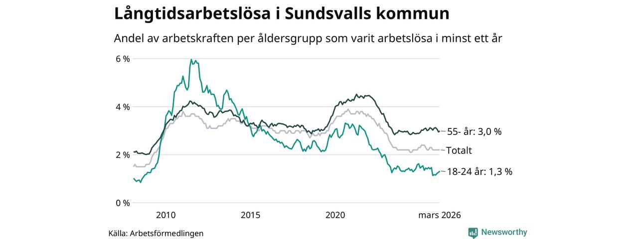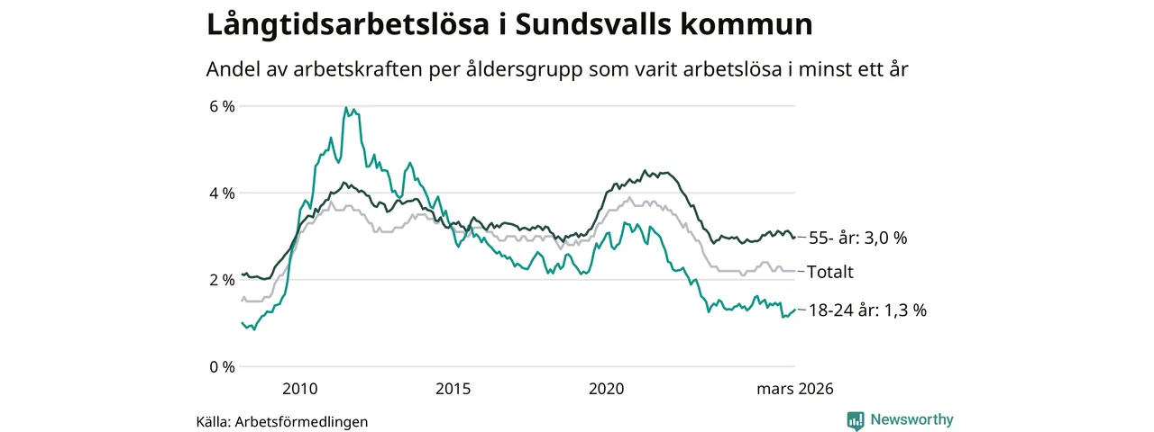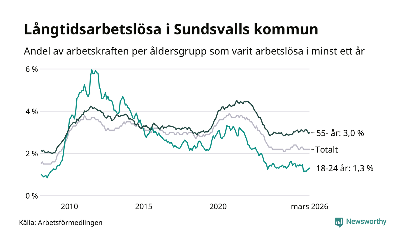 Av de 1 126 personerna som varit arbetslösa i mer än ett år i Sundsvalls kommun är 338 personer mellan 55 och 661 år och 72 är mellan 18 och 24 år. För den äldre gruppen är andelen arbetslösa 3,0 procent medan den i den yngre gruppen är 1,3 procent. Även i riket som helhet är långtidsarbetslösheten högre i gruppen äldre.