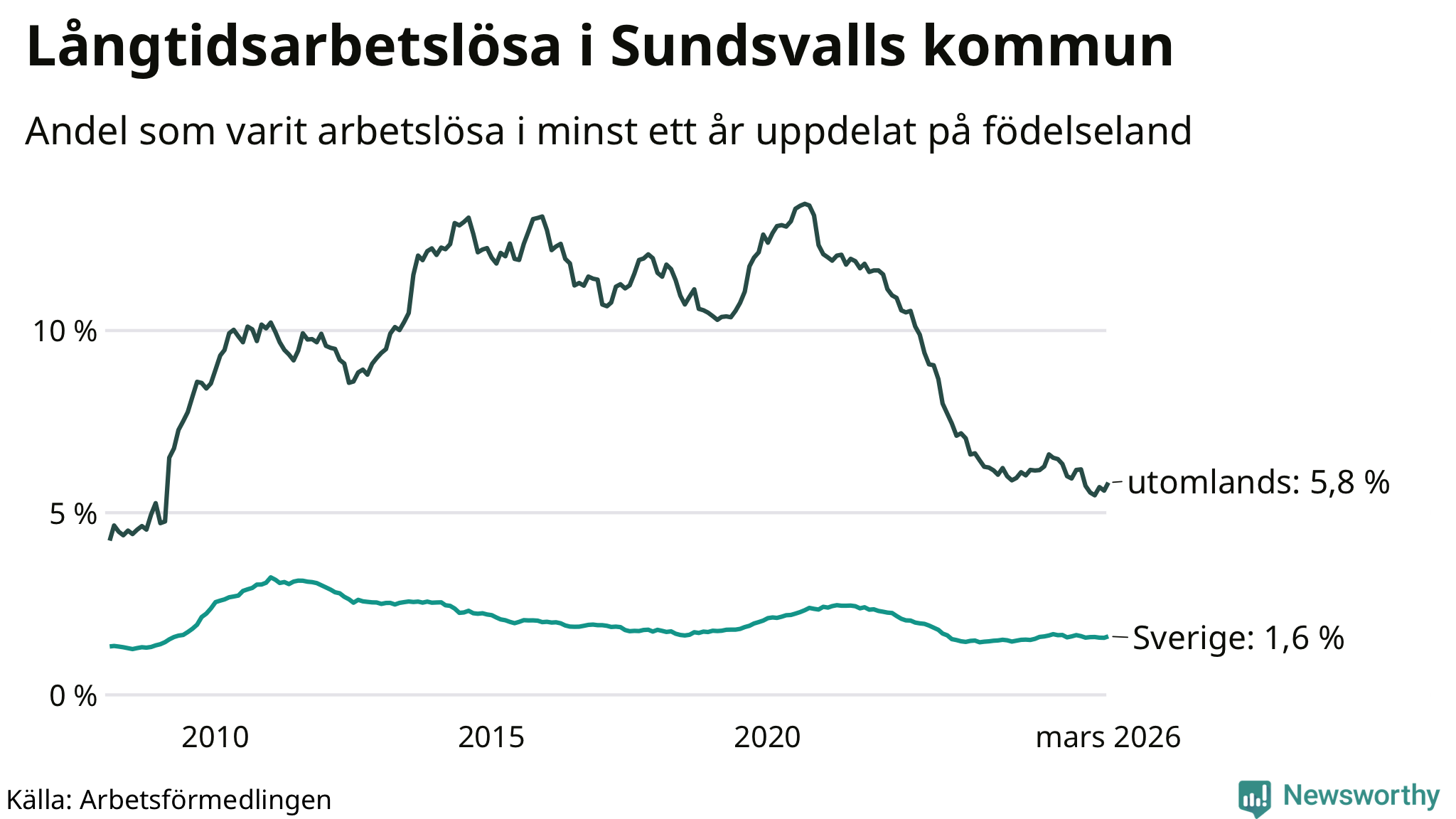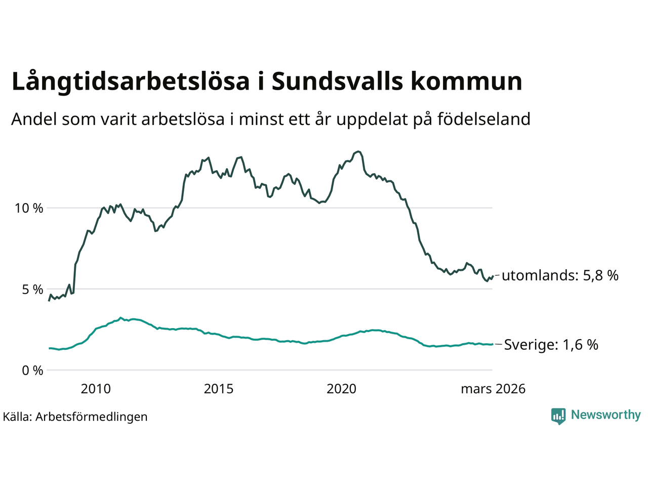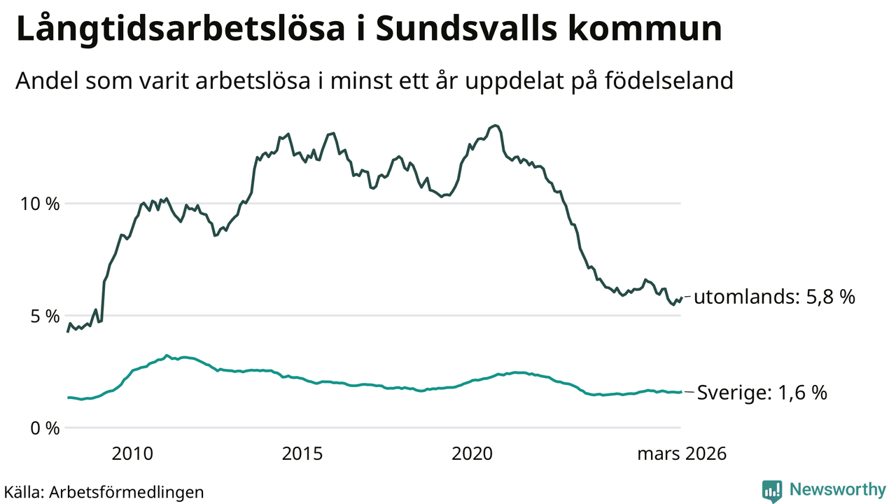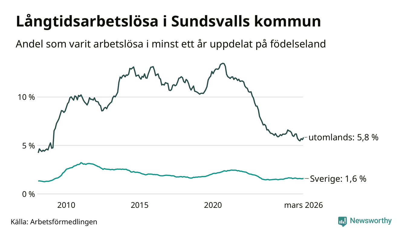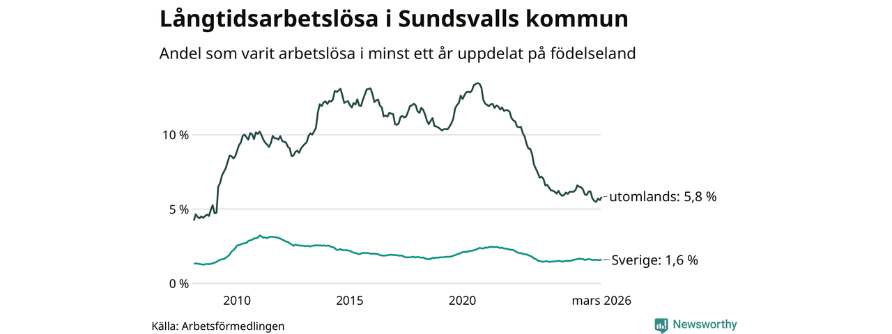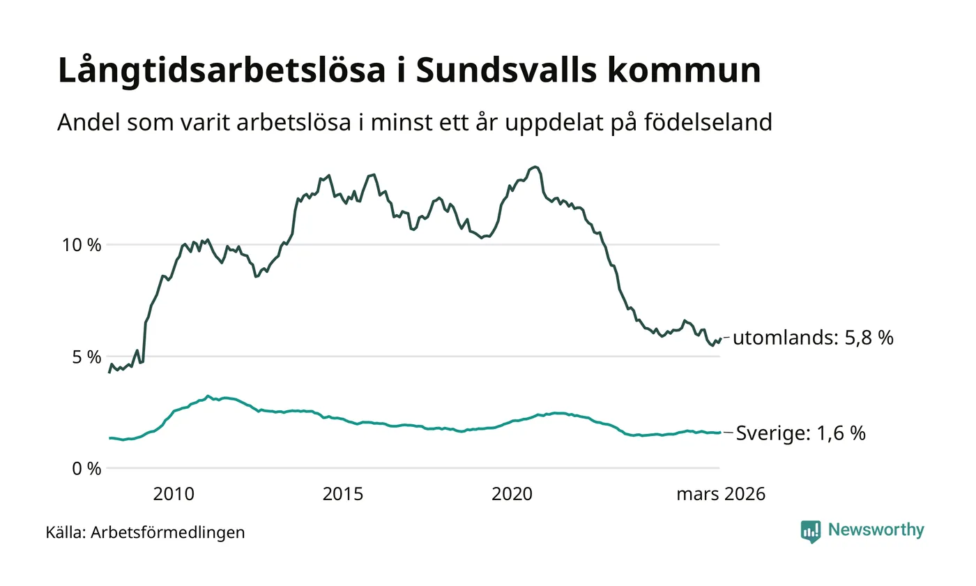 687 av de långtidsarbetslösa i Sundsvall är födda i Sverige, medan 439 är födda utomlands. Det innebär att långtidsarbetslösheten bland Sverigefödda är 1,6 procent, medan den är fyra gånger så hög – 5,8 procent – bland födda utomlands. Även i riket som helhet är arbetslösheten högre bland utrikesfödda.