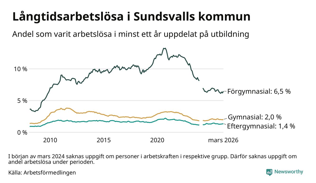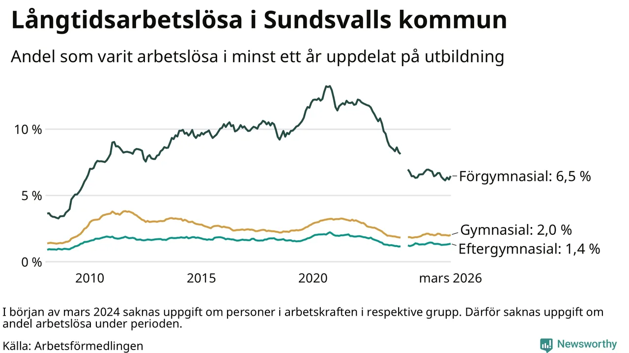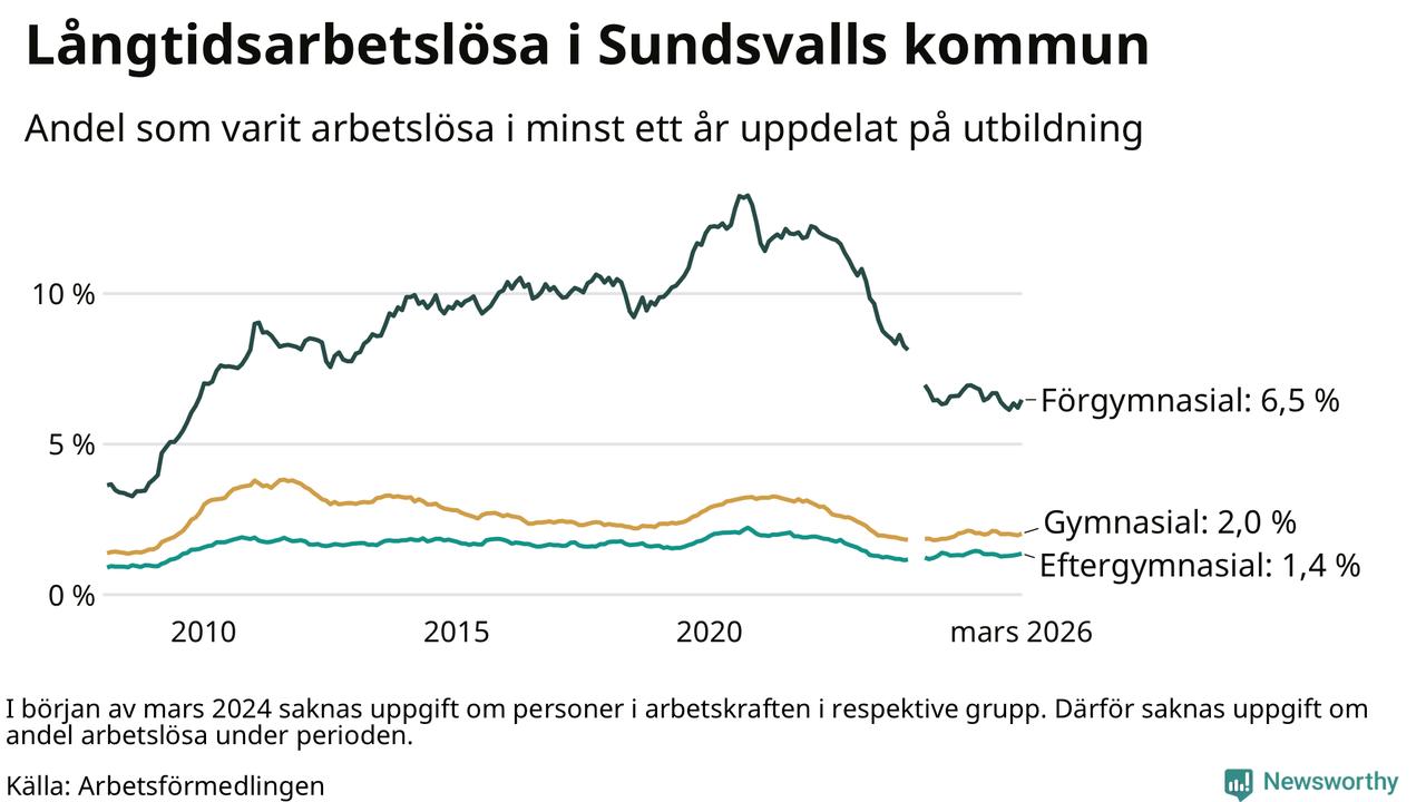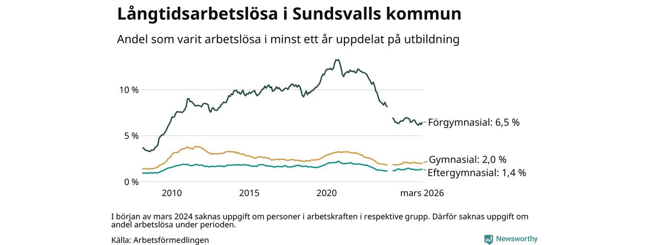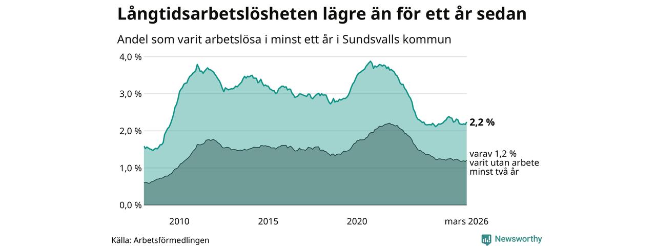 I mars hade 1 126 Sundsvallsbor varit arbetslösa i minst ett år, vilket är 34 fler än månaden innan. 1 126 personer motsvarar 2,2 procent av arbetskraften i kommunen – andelen långtidsarbetslösa är 0,2 procentenheter lägre än samma månad för ett år sedan.