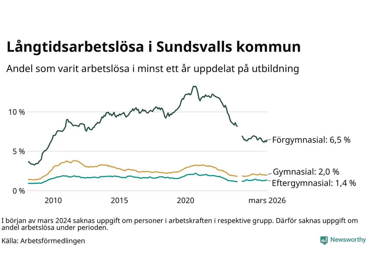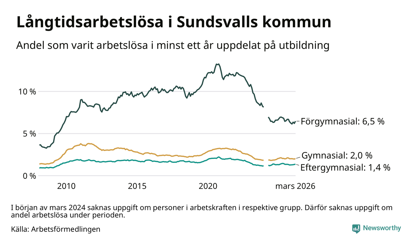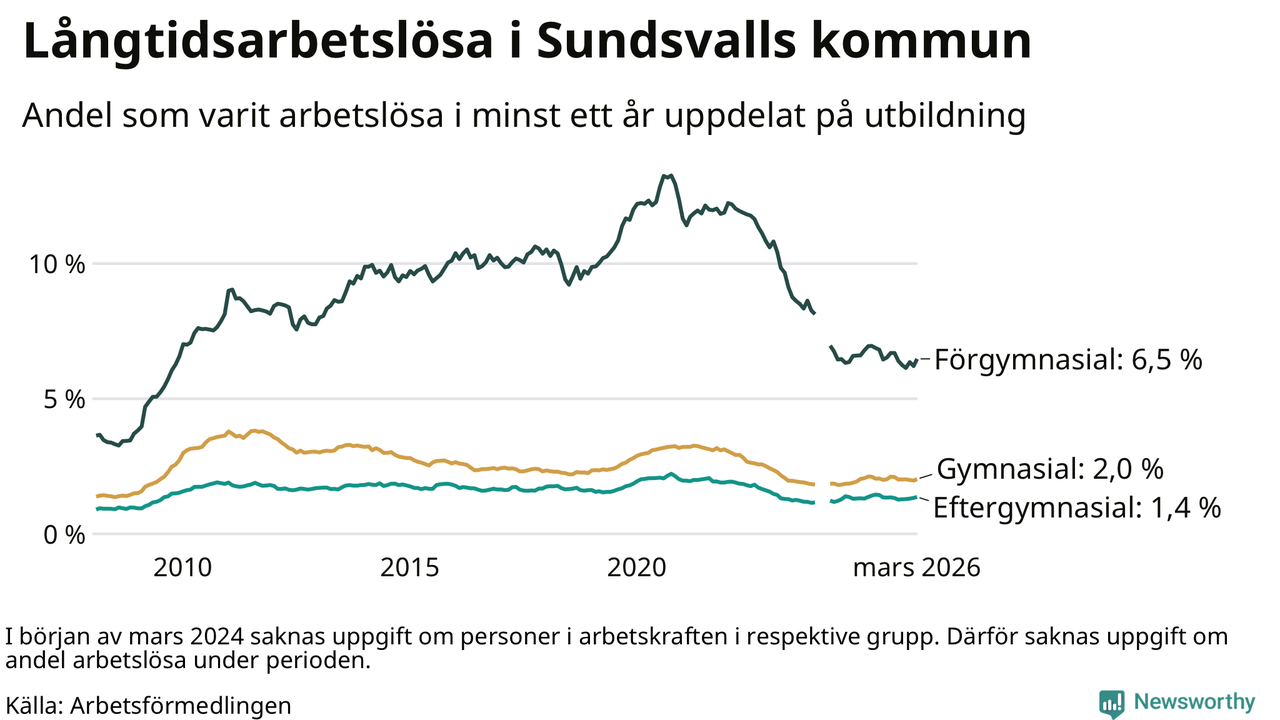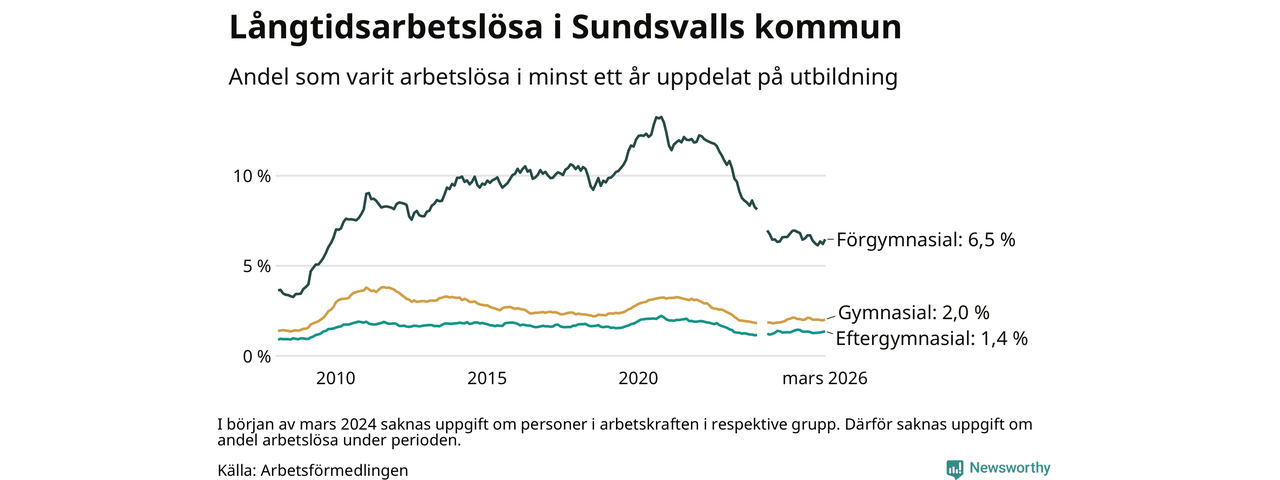 I mars hade 1 126 Sundsvallsbor varit arbetslösa i minst ett år, vilket är 34 fler än månaden innan. 1 126 personer motsvarar 2,2 procent av arbetskraften i kommunen – andelen långtidsarbetslösa är 0,2 procentenheter lägre än samma månad för ett år sedan.