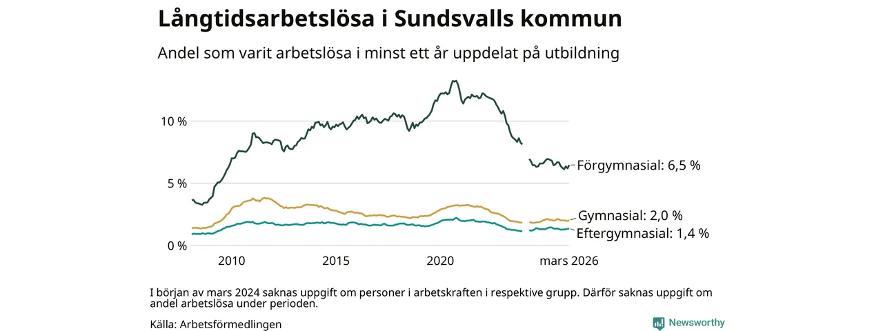 Andelen som varit utan arbete i minst ett år i Sundsvall i mars var lägre än för ett år sedan. Men jämfört med i februari har antalet långtidsarbetslösa ökat.