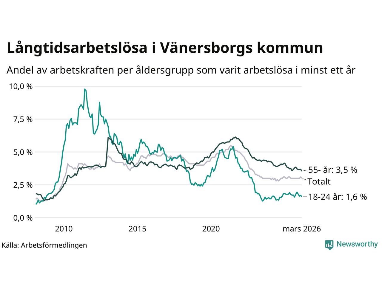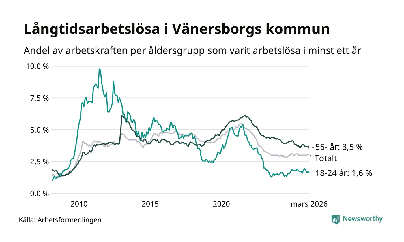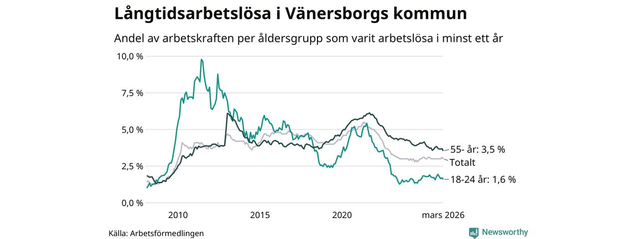 Av de 572 personerna som varit arbetslösa i mer än ett år i Vänersborgs kommun är 164 personer mellan 55 och 661 år och 31 är mellan 18 och 24 år. För den äldre gruppen är andelen arbetslösa 3,5 procent medan den i den yngre gruppen är 1,6 procent. Även i riket som helhet är långtidsarbetslösheten högre i gruppen äldre.