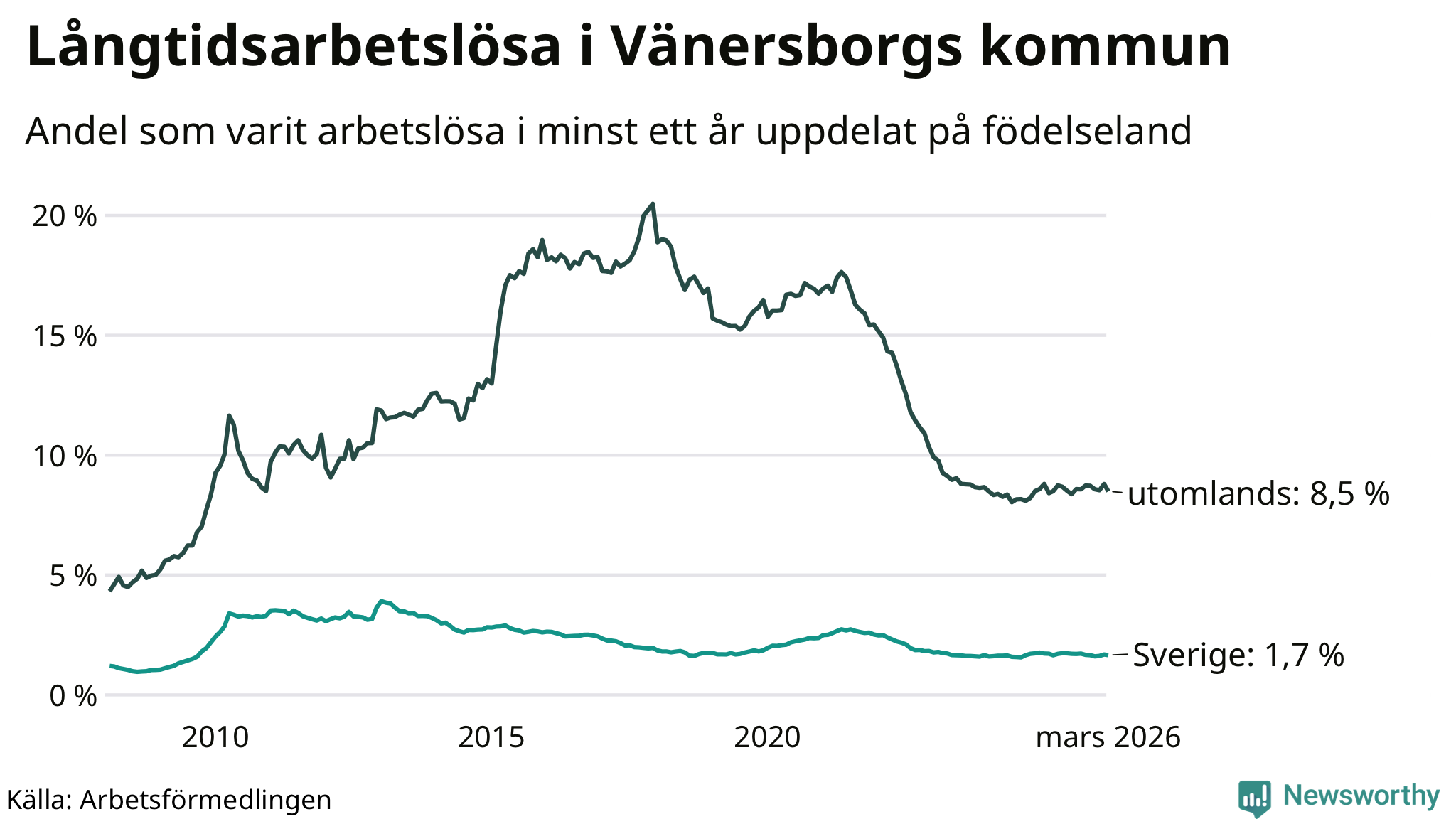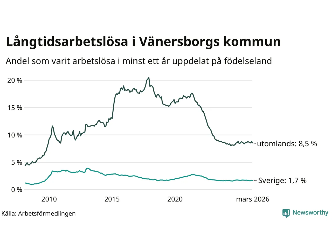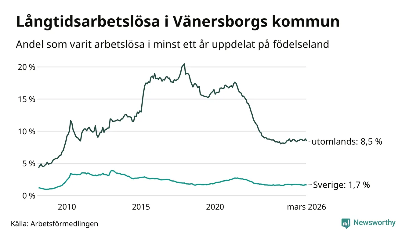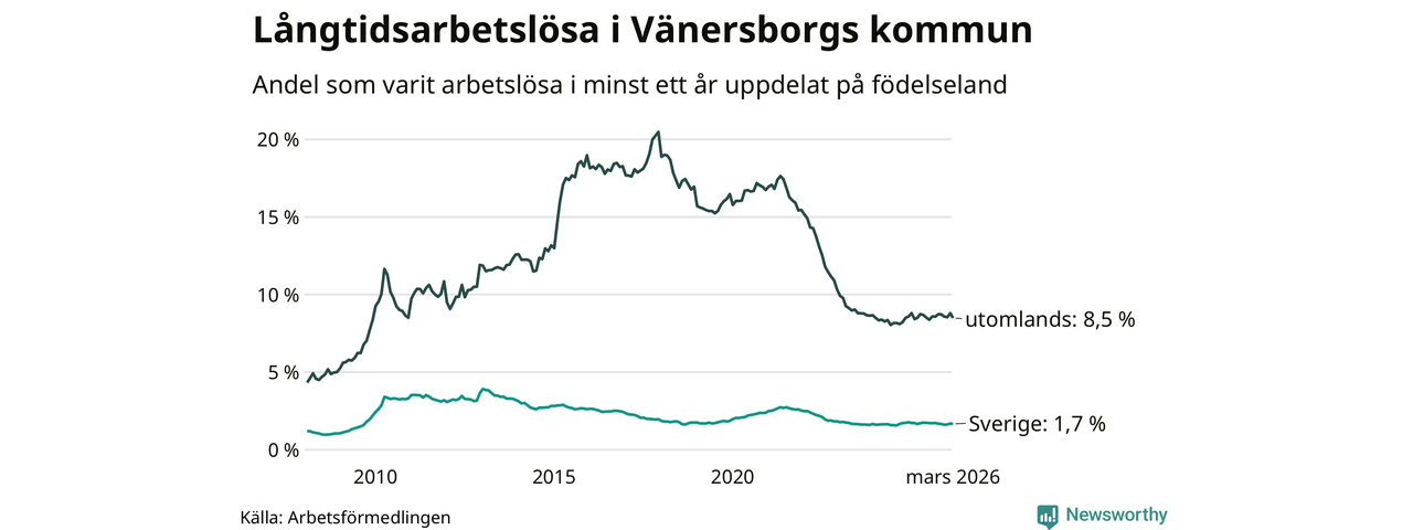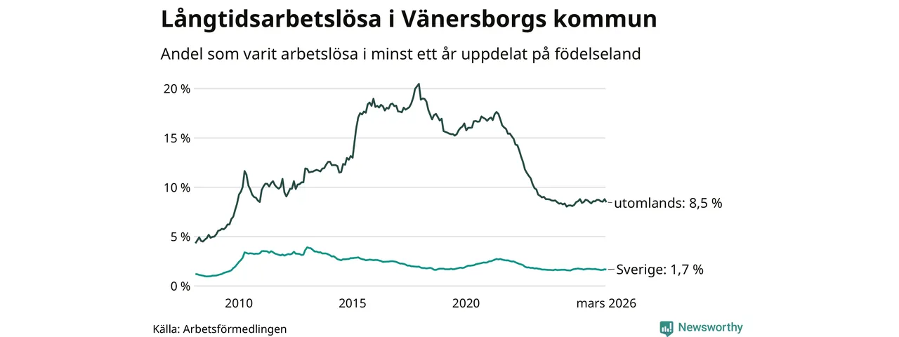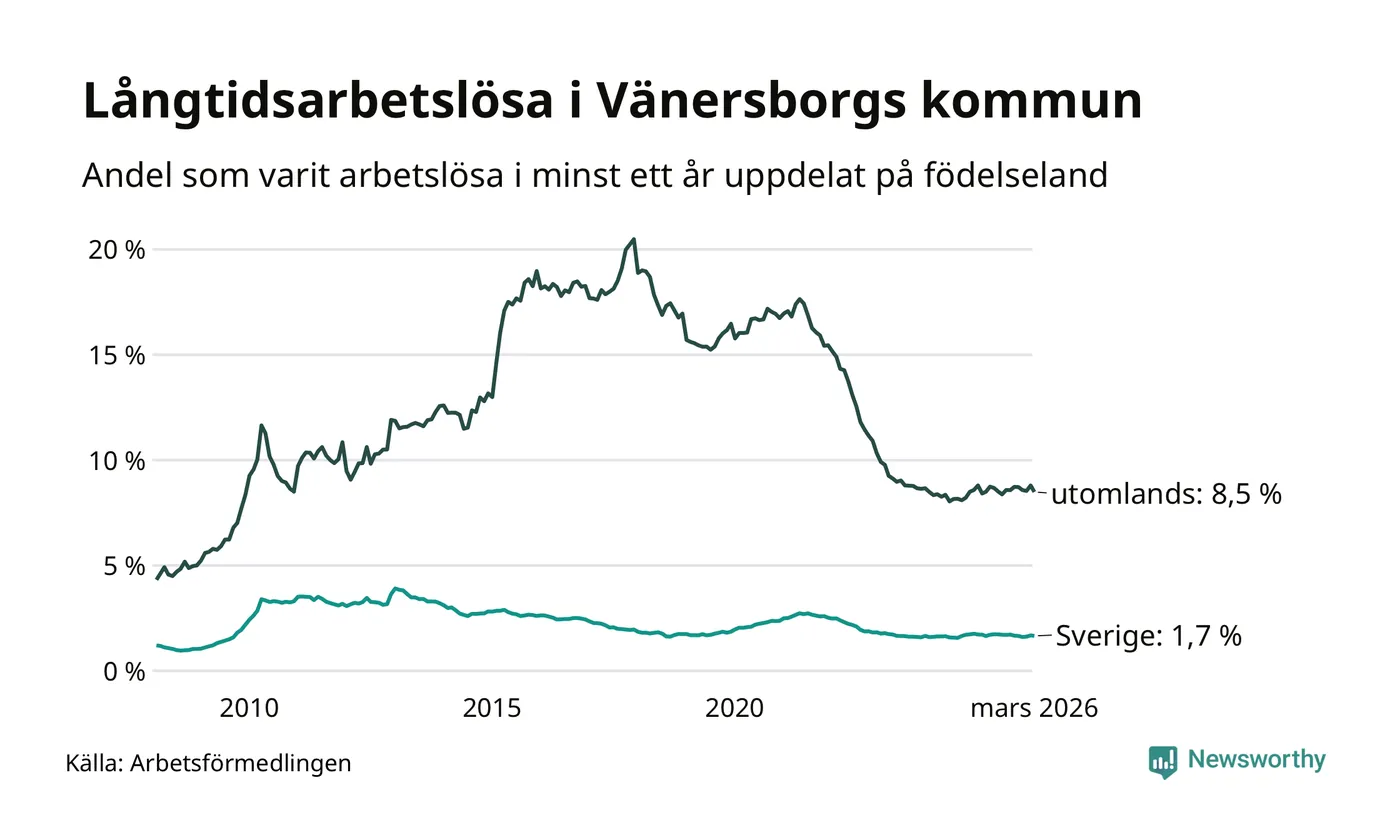 256 av de långtidsarbetslösa i Vänersborg är födda i Sverige, medan 316 är födda utomlands. Det innebär att långtidsarbetslösheten bland Sverigefödda är 1,7 procent, medan den är fem gånger så hög – 8,5 procent – bland födda utomlands. Även i riket som helhet är arbetslösheten högre bland utrikesfödda.