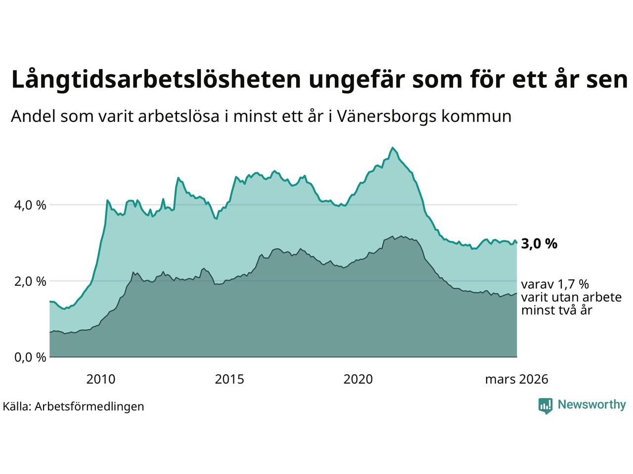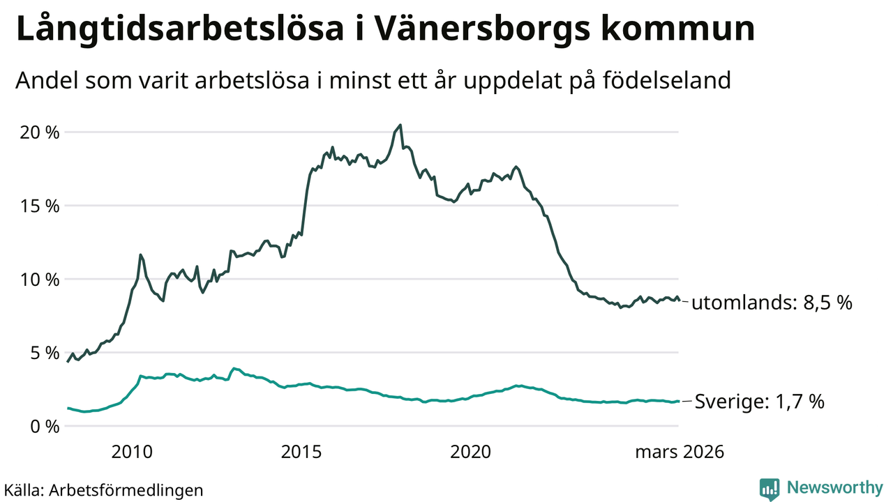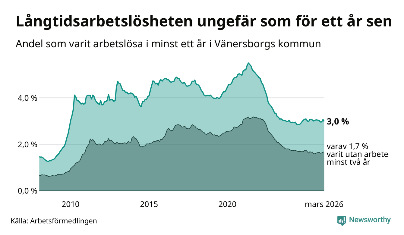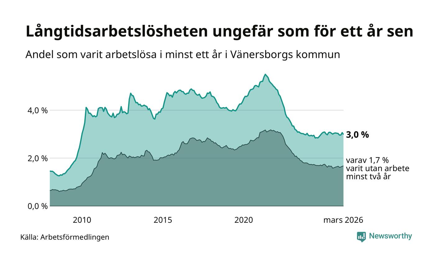 I mars hade 572 Vänersborgsbor varit arbetslösa i minst ett år, vilket är 15 färre än månaden innan. 572 personer motsvarar 3,0 procent av arbetskraften i kommunen – andelen långtidsarbetslösa är ungefär på samma nivå som för ett år sedan.