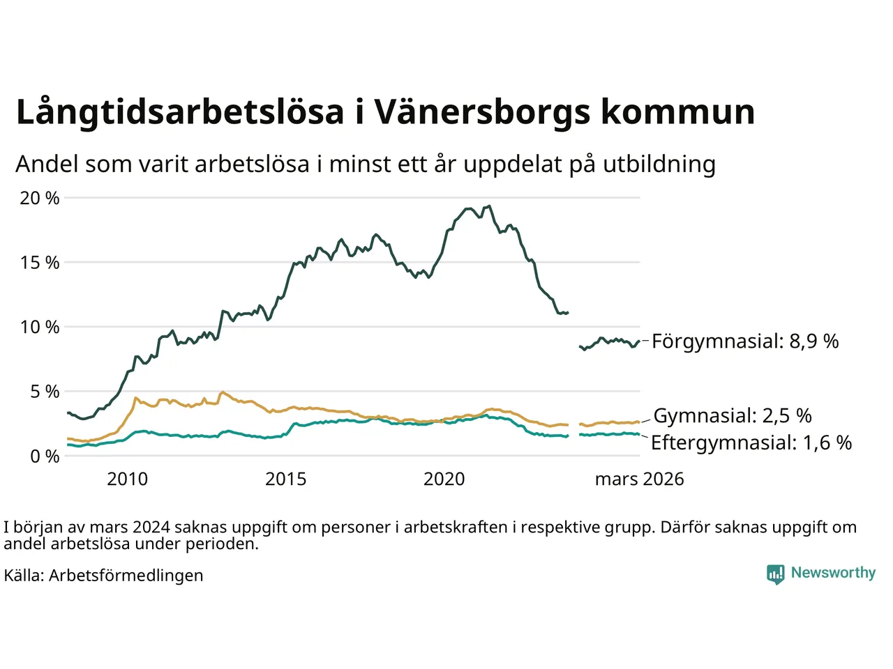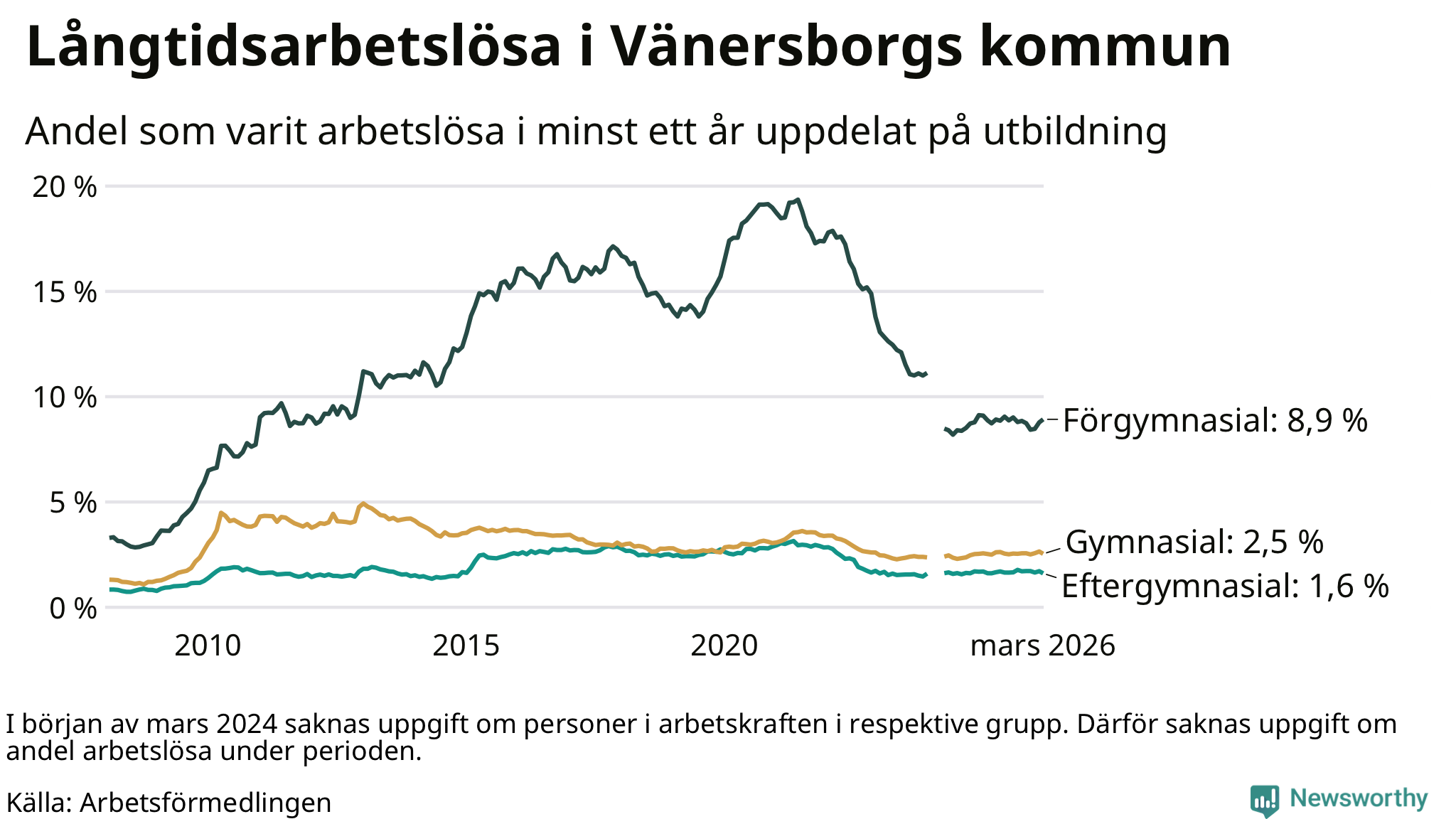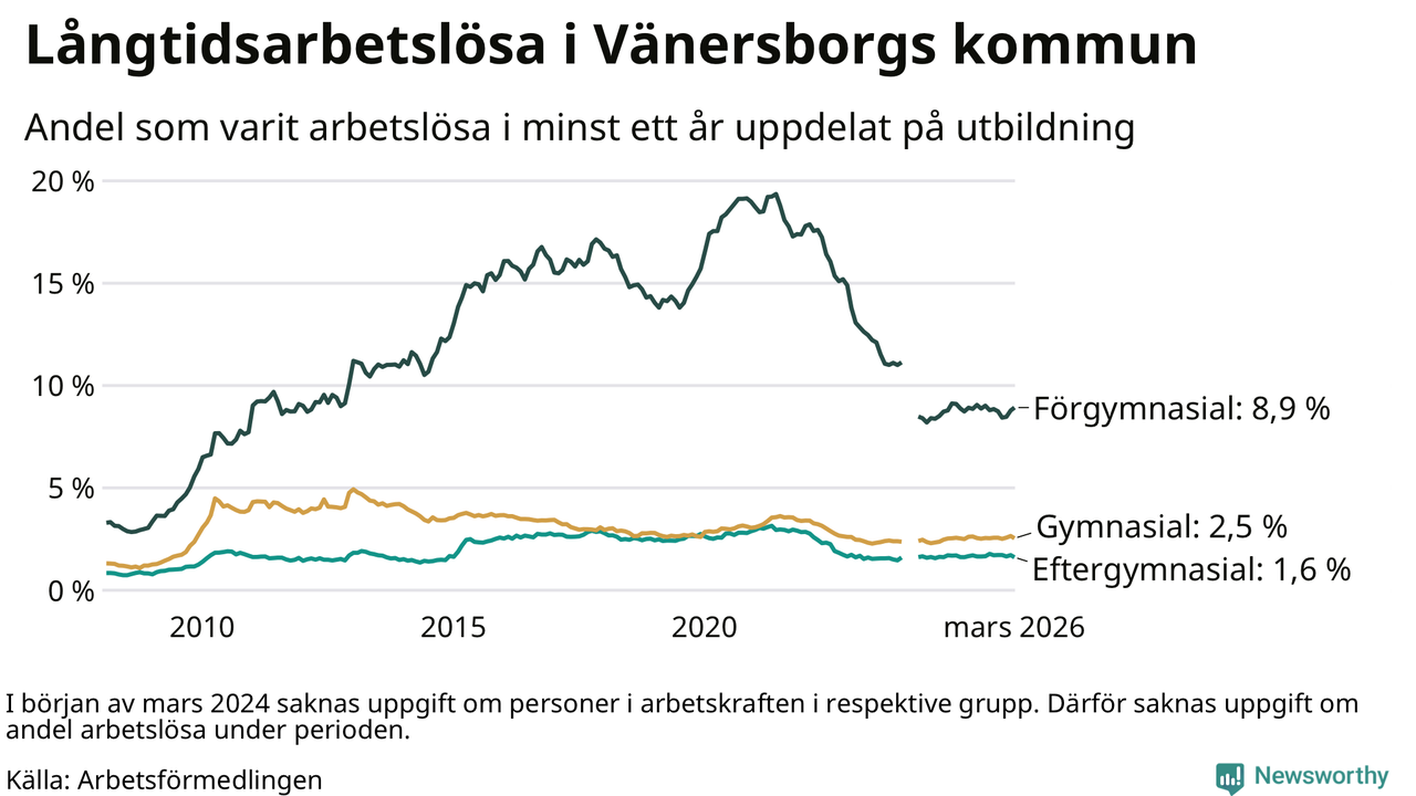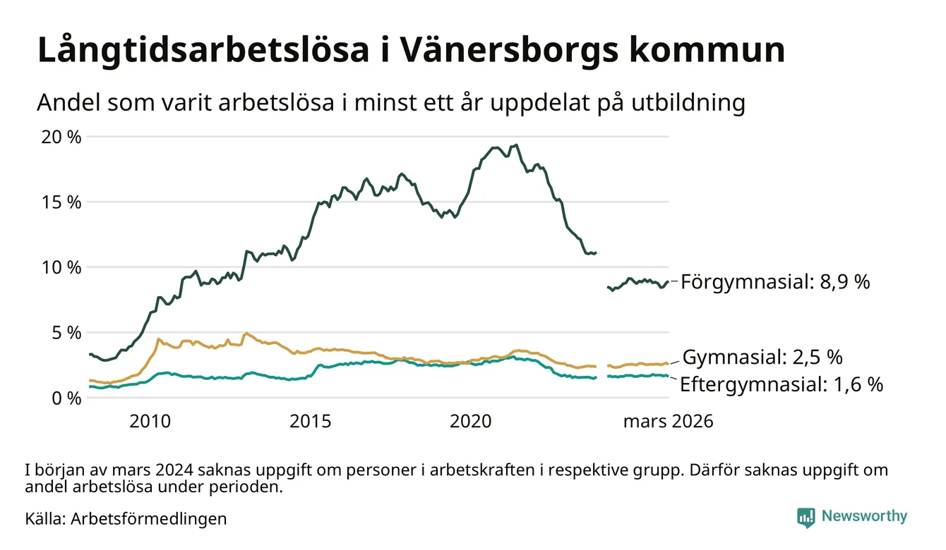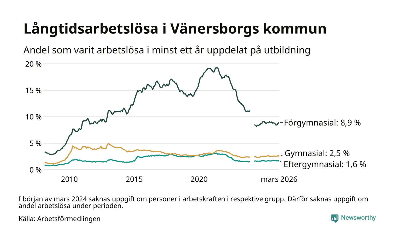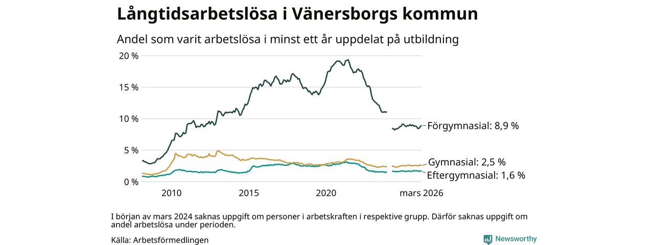 Andelen som varit utan arbete i minst ett år i Vänersborg var ungefär lika stor i mars jämfört med samma månad för ett år sedan. Det visar Arbetsfömedlingens senaste månadsstatistik.