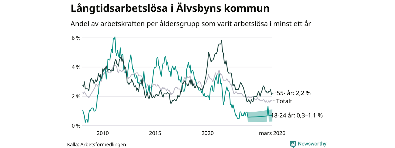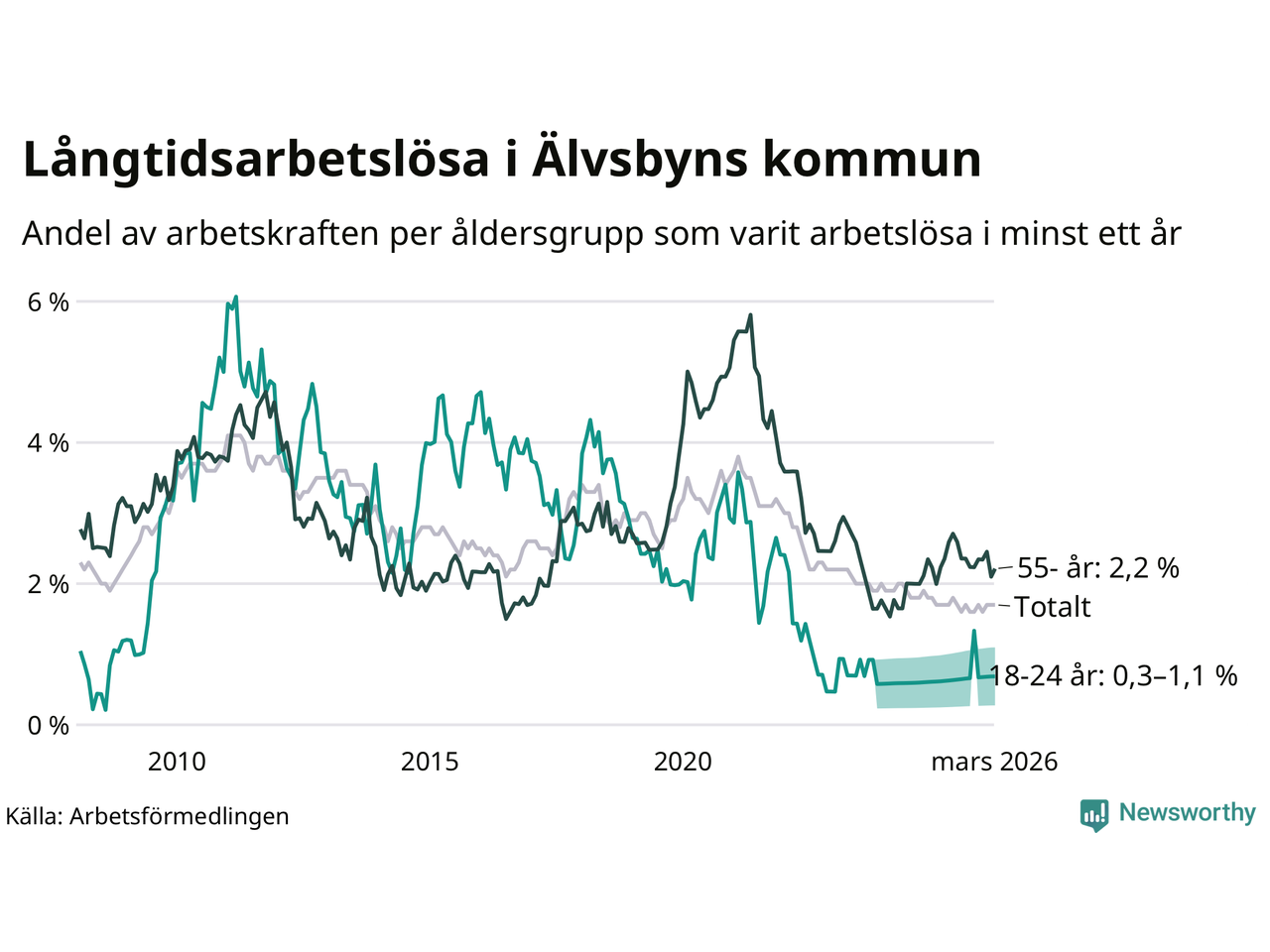 Av de 62 personerna som varit arbetslösa i mer än ett år i Älvsbyns kommun är 19 personer mellan 55 och 661 år och mellan en och fyra är mellan 18 och 24 år. För den äldre gruppen är andelen arbetslösa 2,2 procent medan den i den yngre gruppen är mellan 0,3 och 1,1 procent. Även i riket som helhet är långtidsarbetslösheten högre i gruppen äldre.