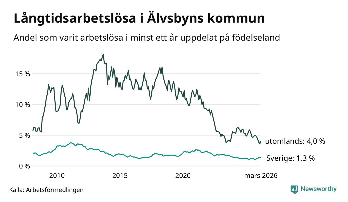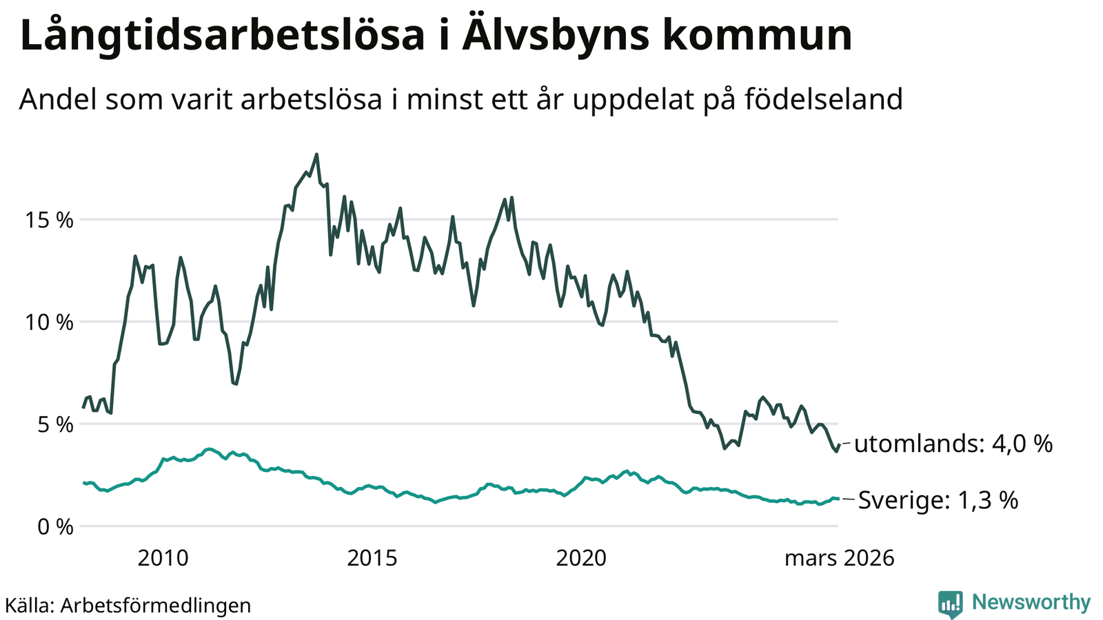 42 av de långtidsarbetslösa i Älvsbyn är födda i Sverige, medan 20 är födda utomlands. Det innebär att långtidsarbetslösheten bland Sverigefödda är 1,3 procent, medan den är tre gånger så hög – 4,0 procent – bland födda utomlands. Även i riket som helhet är arbetslösheten högre bland utrikesfödda.