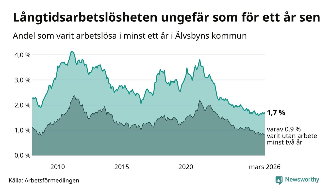 I mars hade 62 Älvsbybor varit arbetslösa i minst ett år, vilket är två fler än månaden innan. 62 personer motsvarar 1,7 procent av arbetskraften i kommunen – andelen långtidsarbetslösa är ungefär på samma nivå som för ett år sedan.