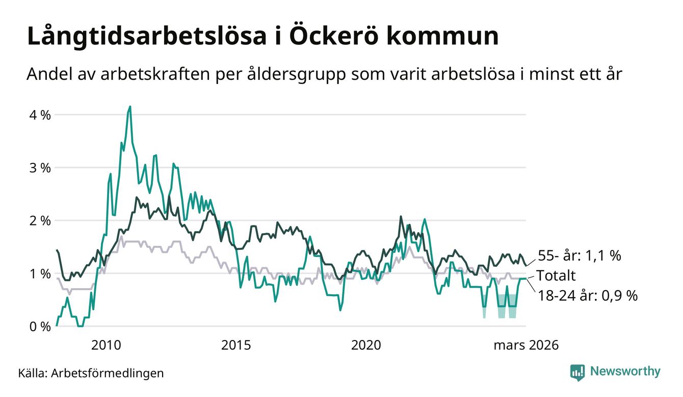 Av de 56 personerna som varit arbetslösa i mer än ett år i Öckerö kommun är 20 personer mellan 55 och 661 år och sex är mellan 18 och 24 år. För den äldre gruppen är andelen arbetslösa 1,1 procent medan den i den yngre gruppen är 0,9 procent. Även i riket som helhet är långtidsarbetslösheten högre i gruppen äldre.