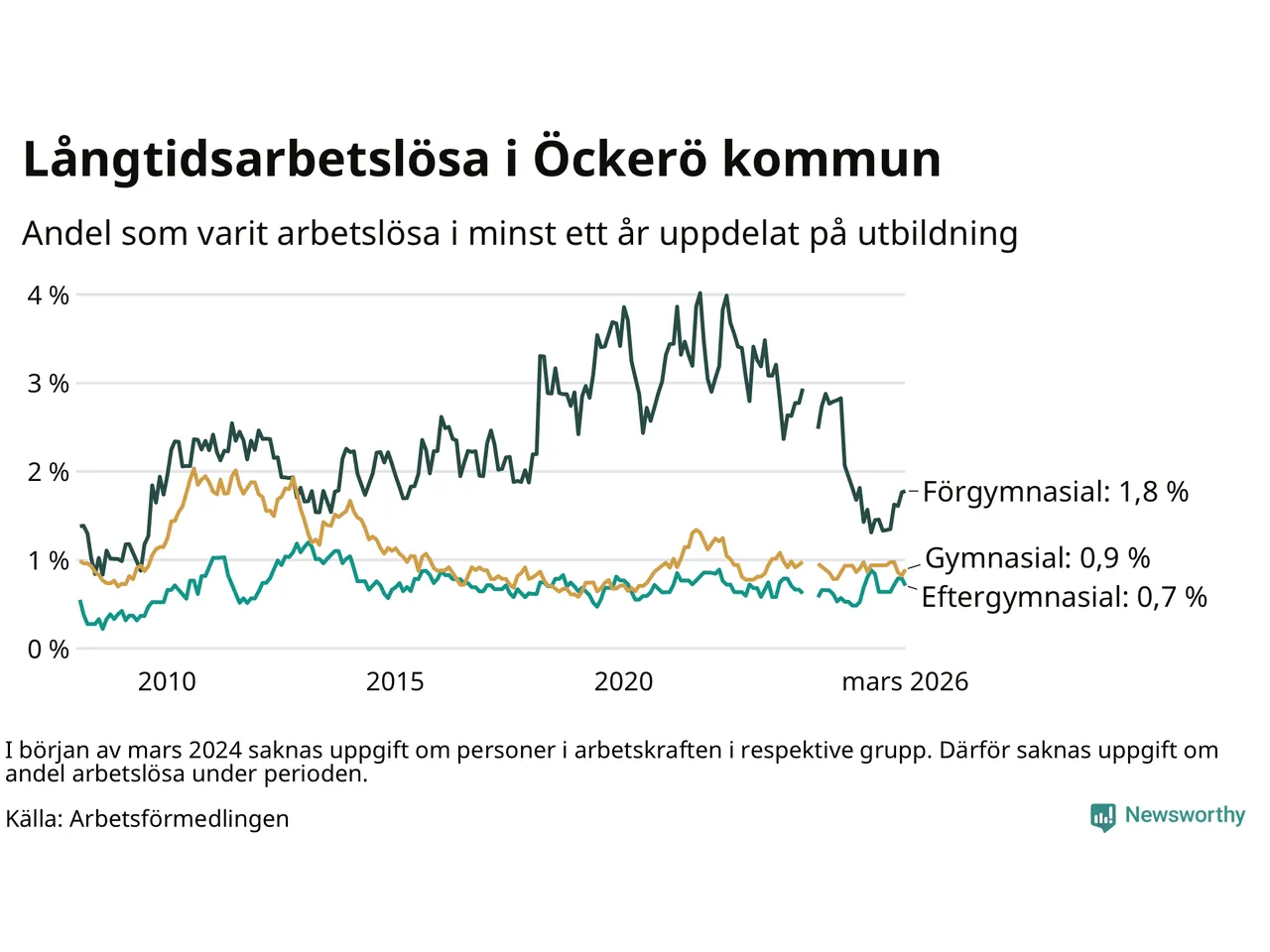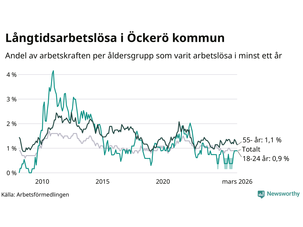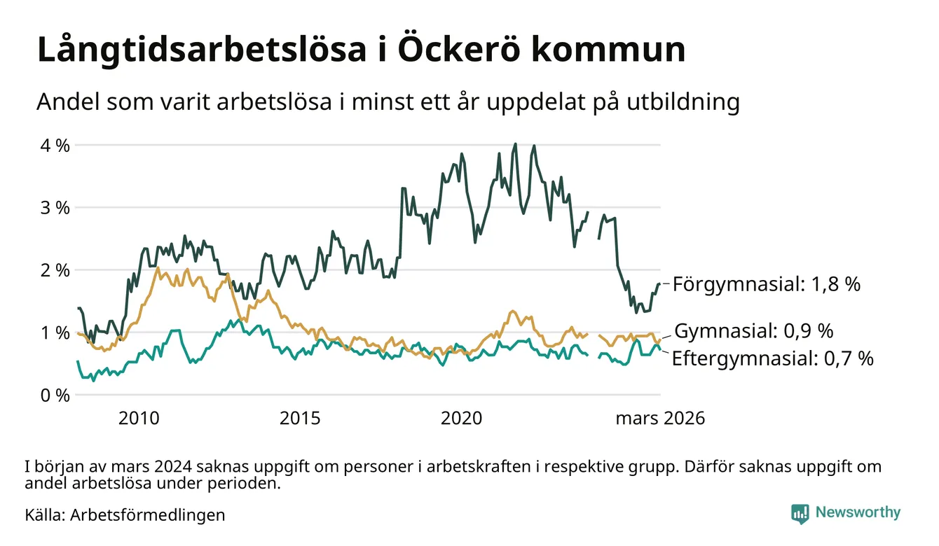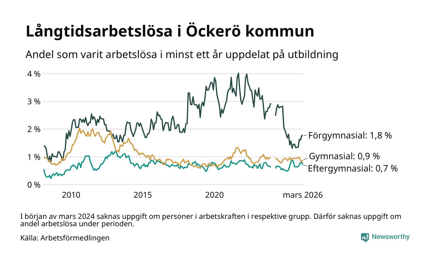 | Andel arbetslösa i minst två år | 0,4 % | 1,3 % | 1,6 % |