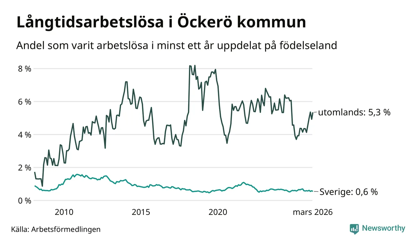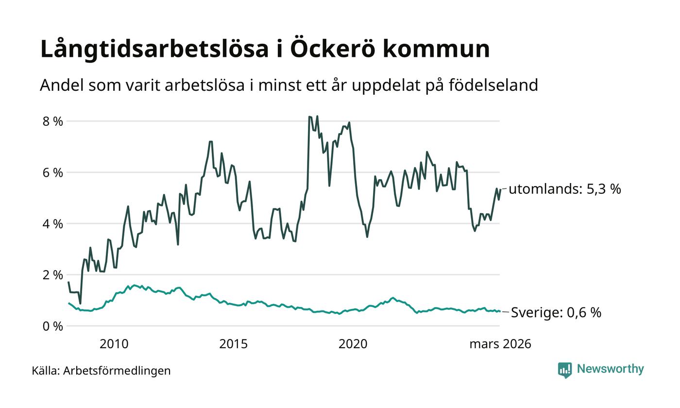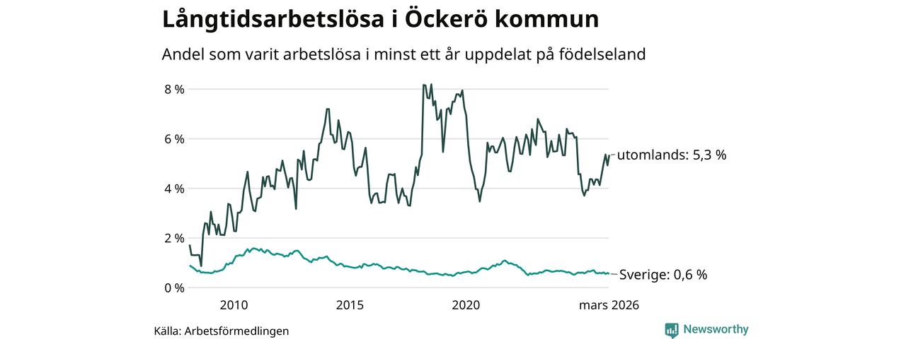 31 av de långtidsarbetslösa på Öckerö är födda i Sverige, medan 25 är födda utomlands. Det innebär att långtidsarbetslösheten bland Sverigefödda är 0,6 procent, medan den är nio gånger så hög – 5,3 procent – bland födda utomlands. Även i riket som helhet är arbetslösheten högre bland utrikesfödda.
