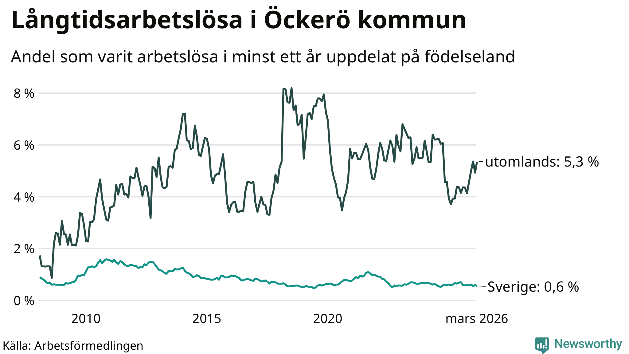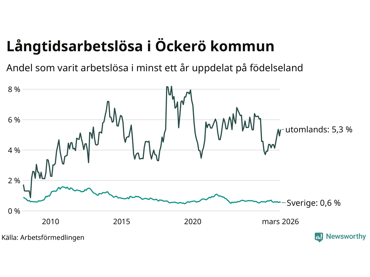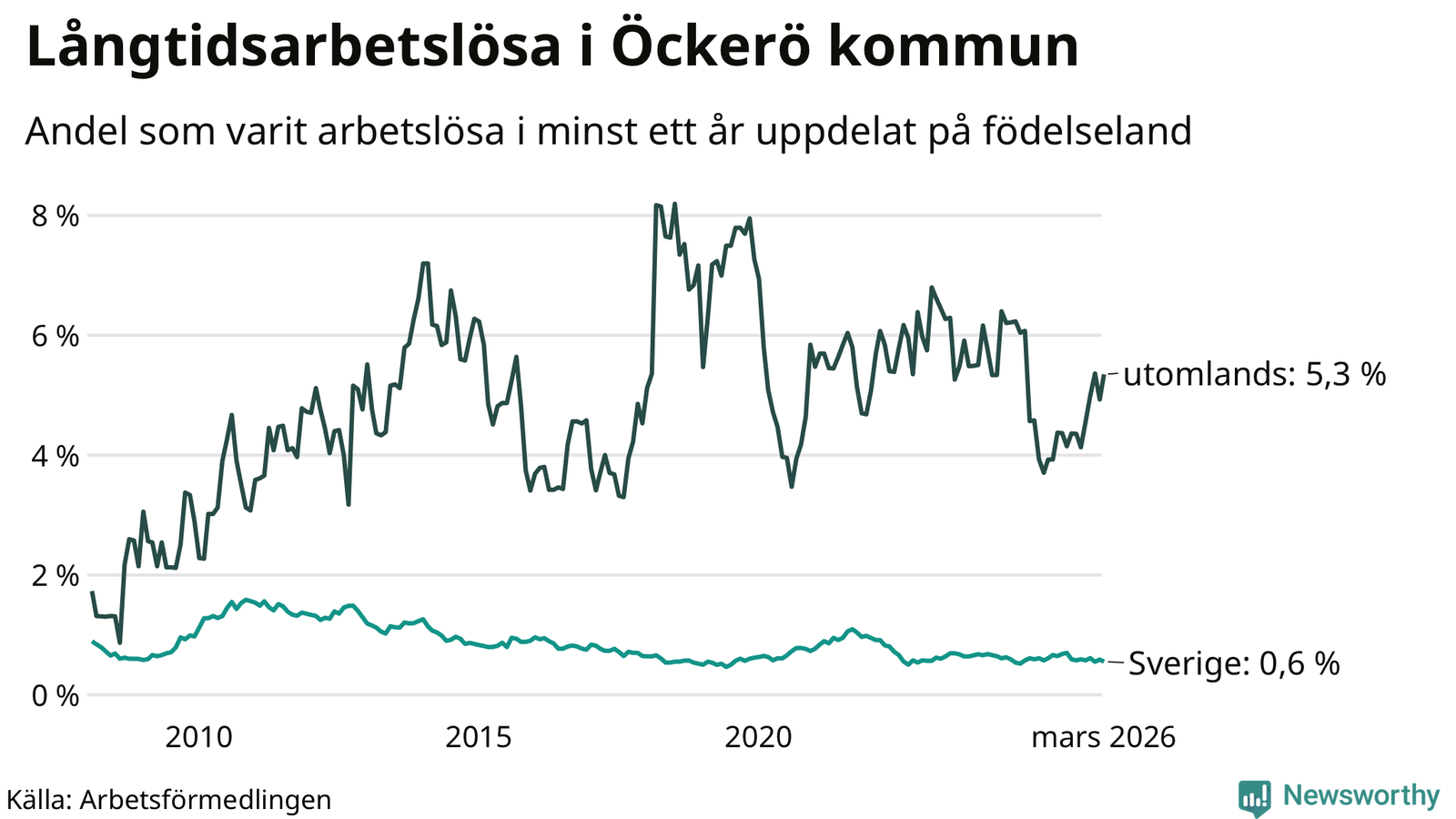 31 av de långtidsarbetslösa på Öckerö är födda i Sverige, medan 25 är födda utomlands. Det innebär att långtidsarbetslösheten bland Sverigefödda är 0,6 procent, medan den är nio gånger så hög – 5,3 procent – bland födda utomlands. Även i riket som helhet är arbetslösheten högre bland utrikesfödda.