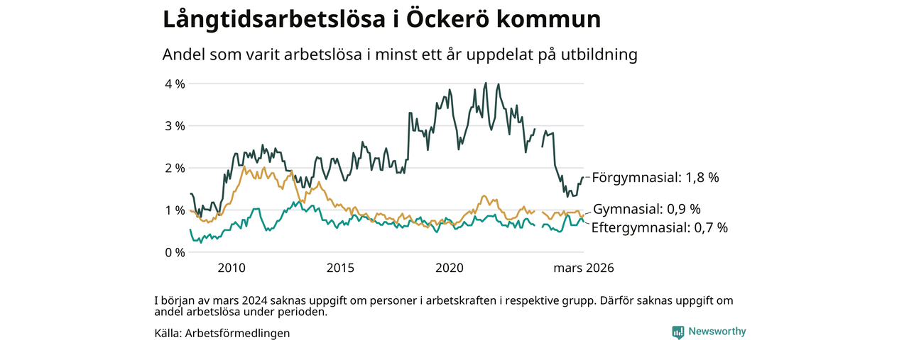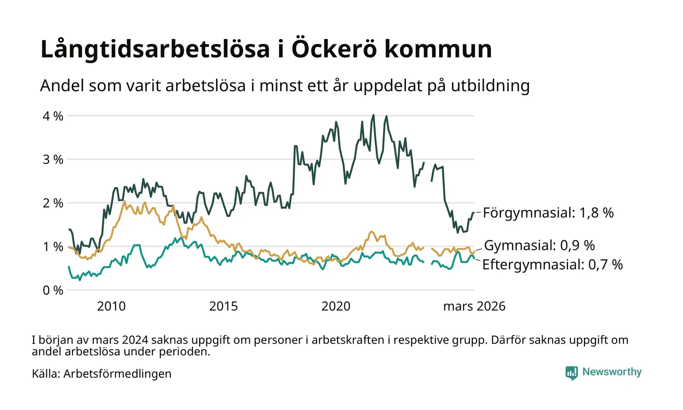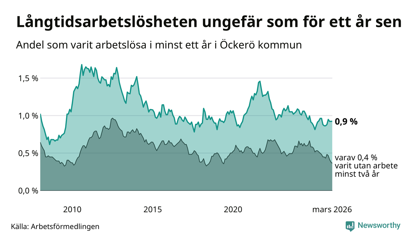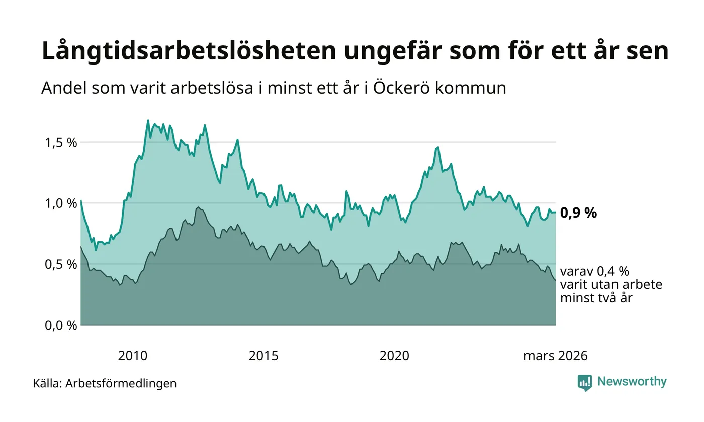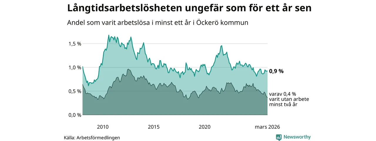 Andelen som varit utan arbete i minst ett år på Öckerö var ungefär lika stor i mars jämfört med samma månad för ett år sedan. Det visar Arbetsfömedlingens senaste månadsstatistik.