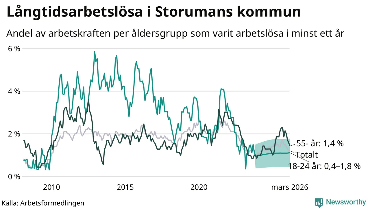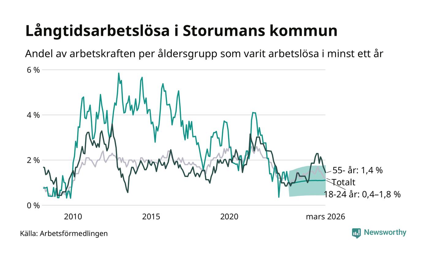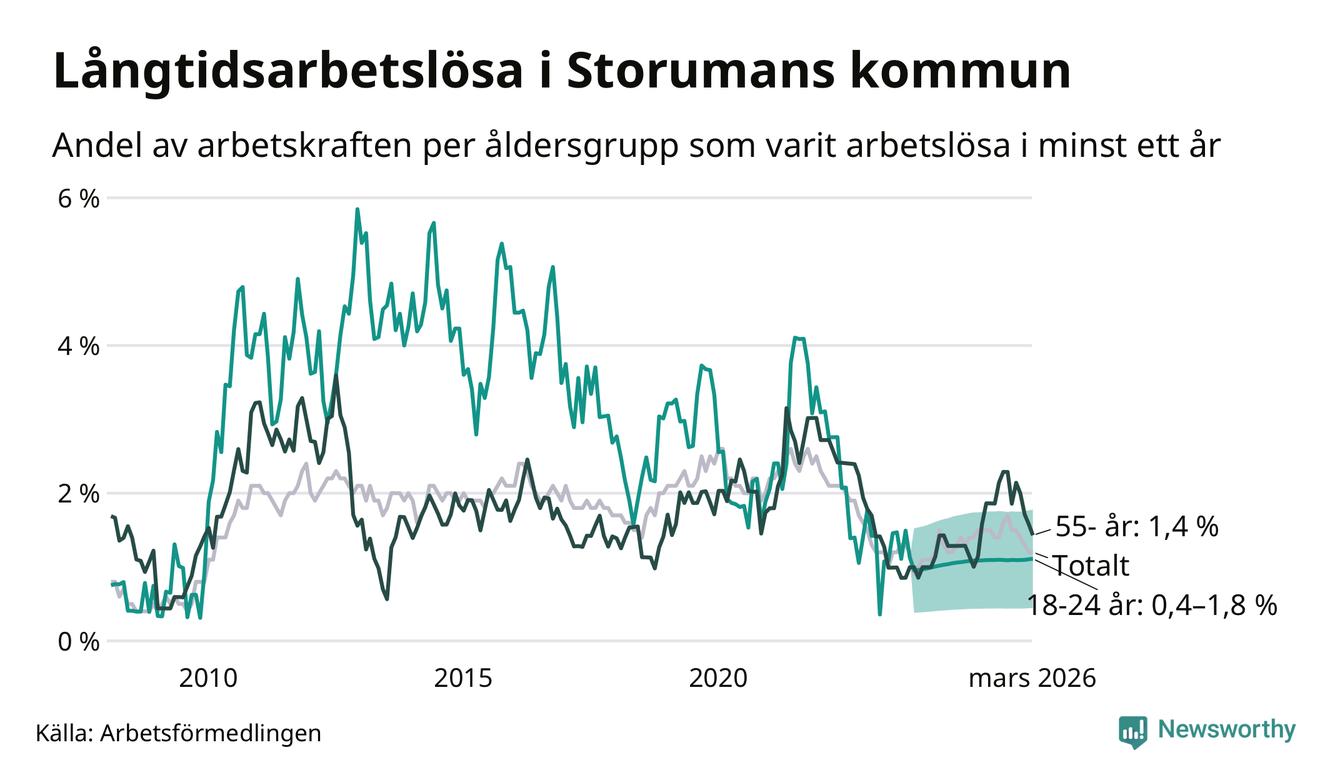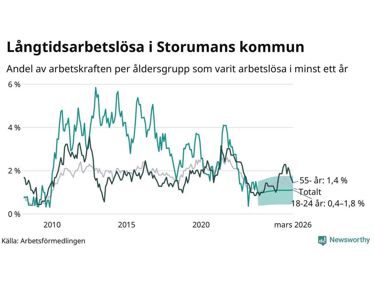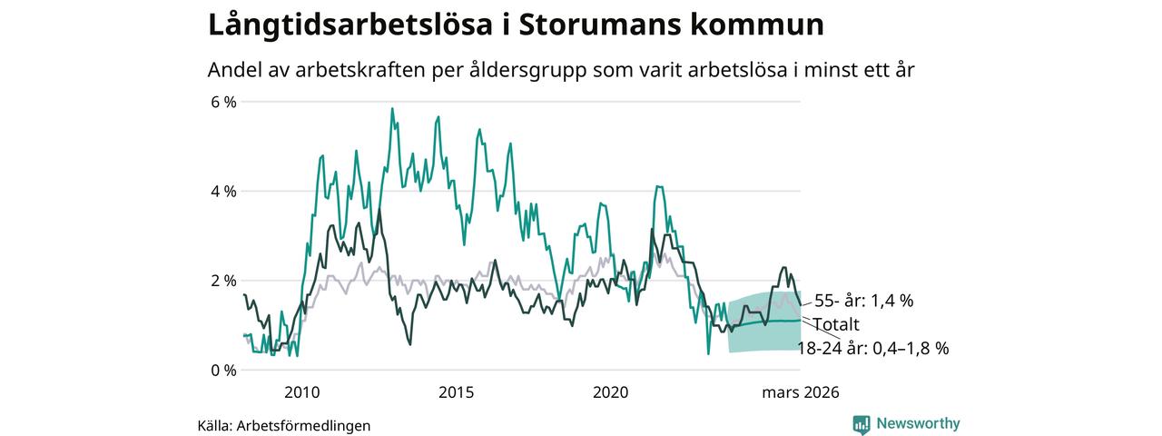 Av de 30 personerna som varit arbetslösa i mer än ett år i Storumans kommun är tio personer mellan 55 och 661 år och mellan en och fyra är mellan 18 och 24 år. För den äldre gruppen är andelen arbetslösa 1,4 procent medan den i den yngre gruppen är mellan 0,4 och 1,8 procent. Även i riket som helhet är långtidsarbetslösheten högre i gruppen äldre.