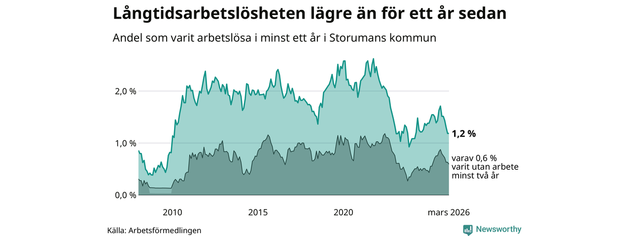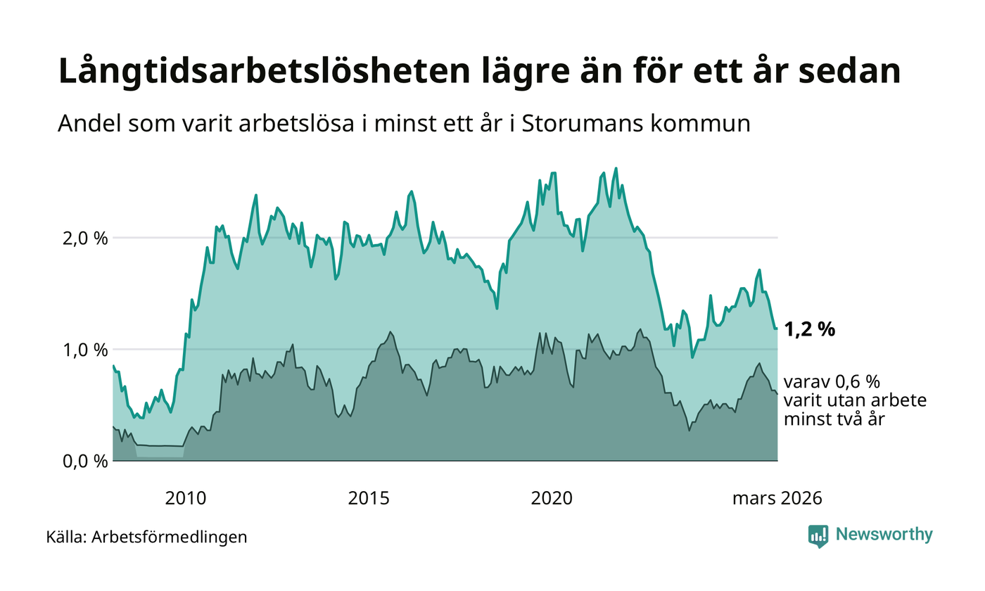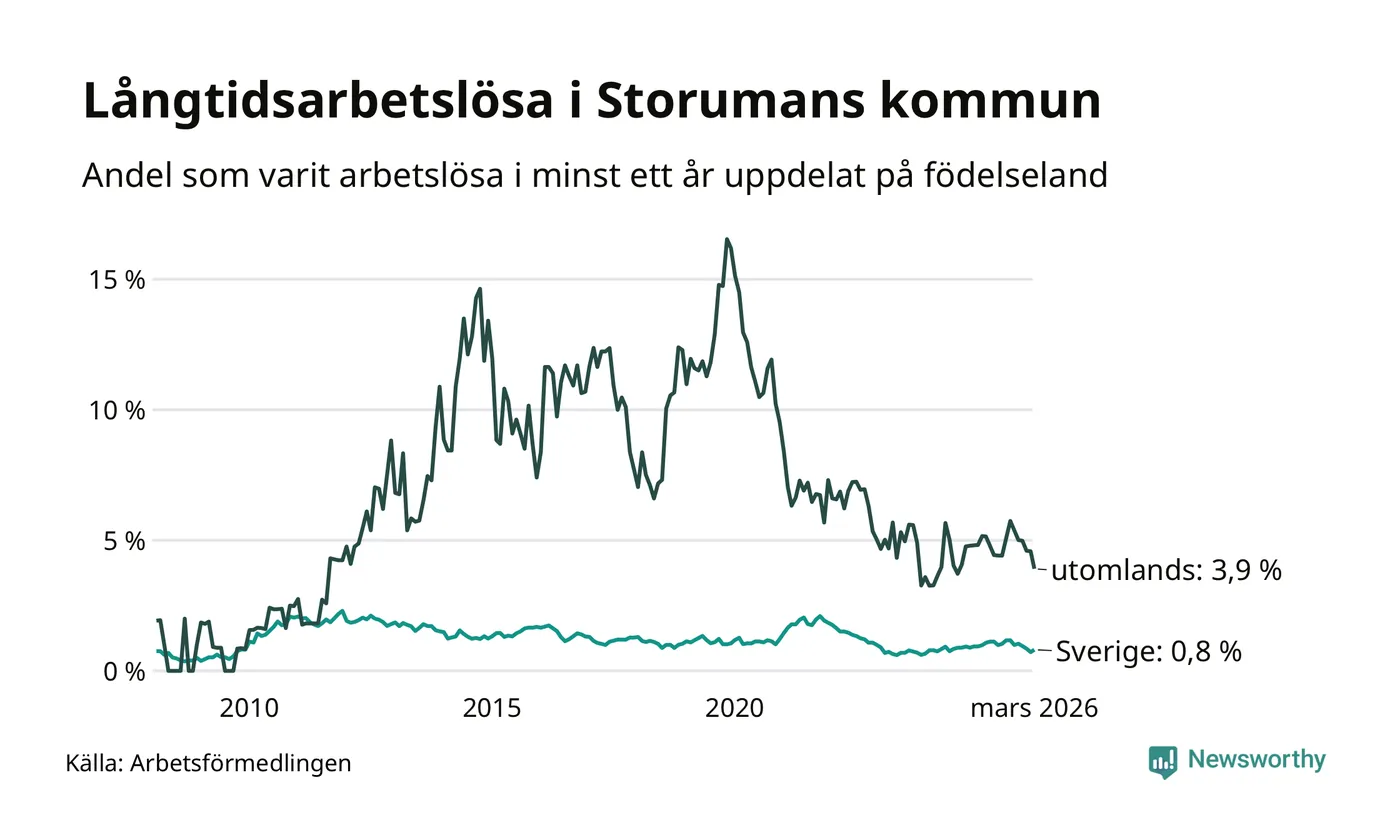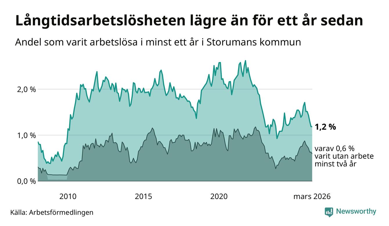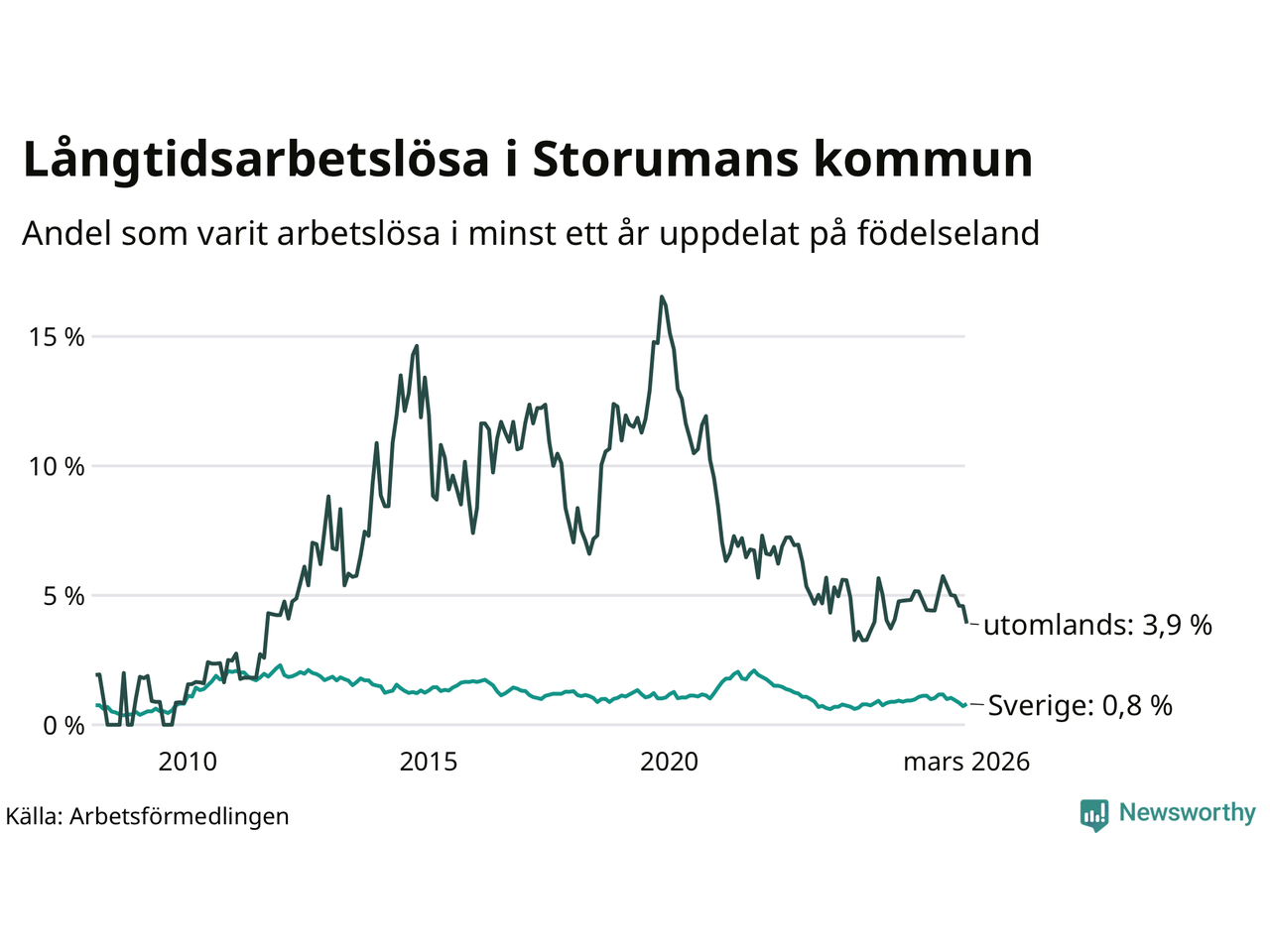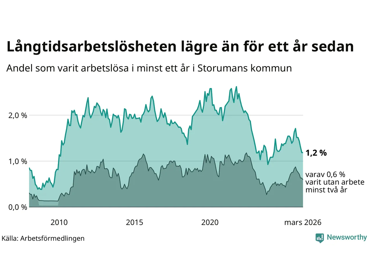 I mars hade 30 Storumanbor varit arbetslösa i minst ett år, vilket är lika många som månaden innan. Det är den sjätte månaden i rad med minskande eller oförändrat antal långtidsarbetslösa. 30 personer motsvarar 1,2 procent av arbetskraften i kommunen – andelen långtidsarbetslösa är 0,3 procentenheter lägre än samma månad för ett år sedan. Storuman tillhör de kommuner som har lägst andel långtidsarbetslösa i hela landet just nu.