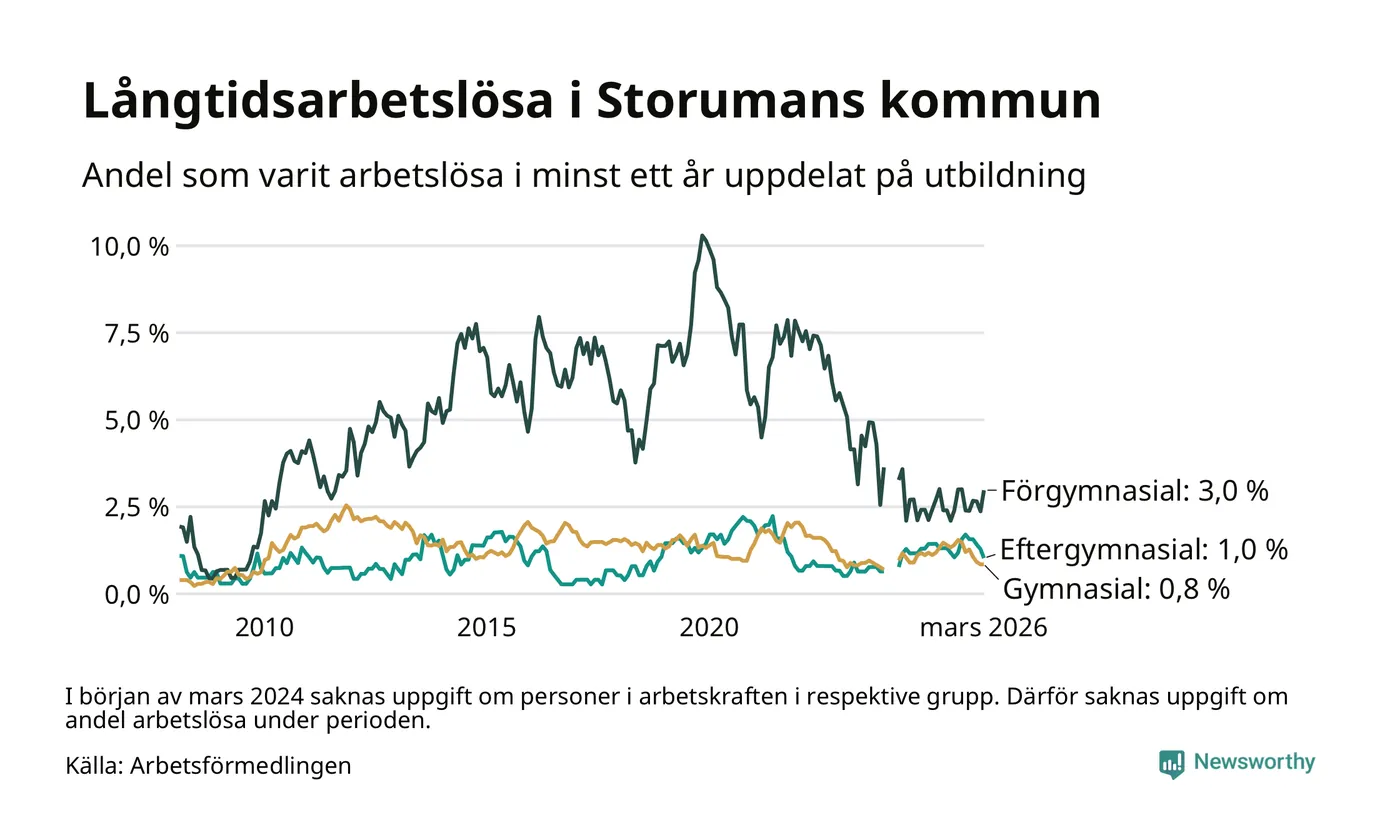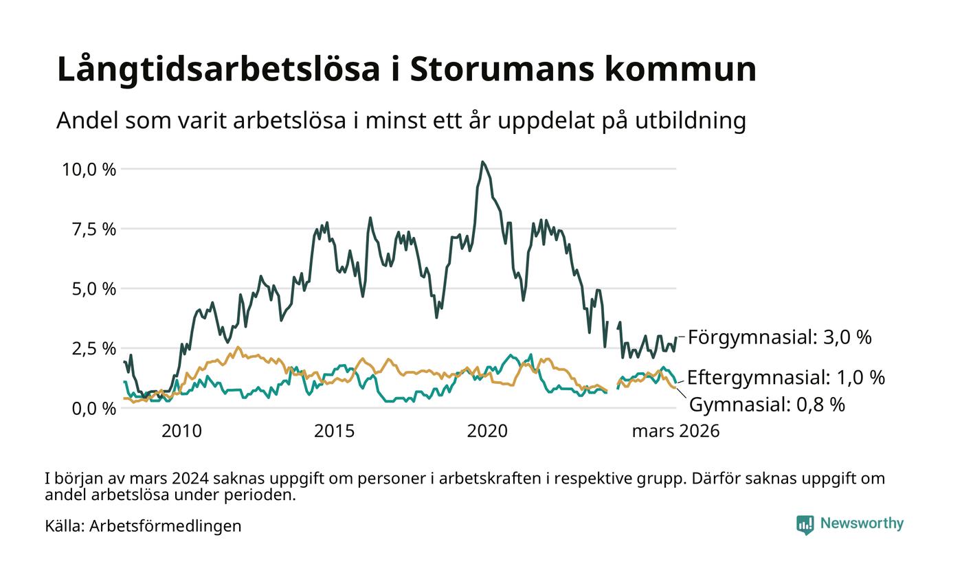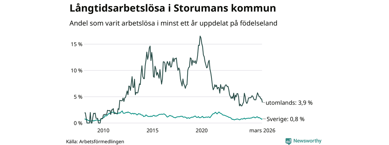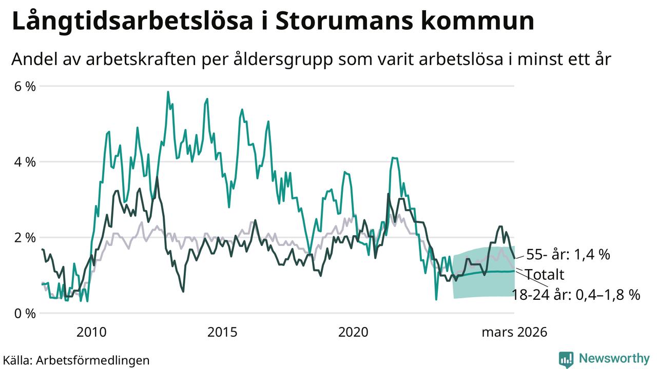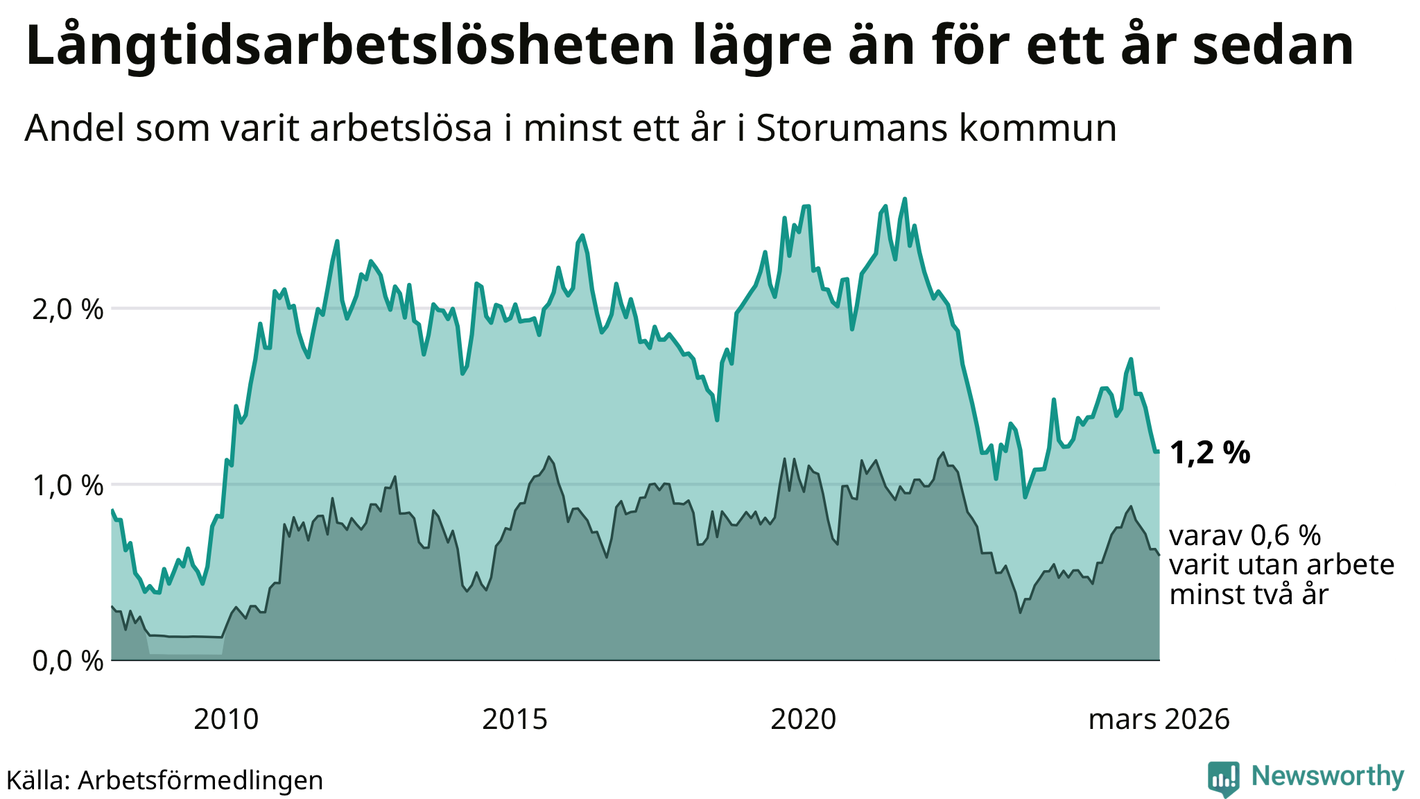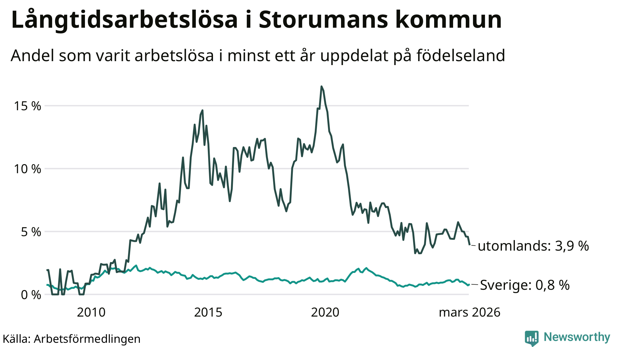 I mars hade 30 Storumanbor varit arbetslösa i minst ett år, vilket är lika många som månaden innan. Det är den sjätte månaden i rad med minskande eller oförändrat antal långtidsarbetslösa. 30 personer motsvarar 1,2 procent av arbetskraften i kommunen – andelen långtidsarbetslösa är 0,3 procentenheter lägre än samma månad för ett år sedan. Storuman tillhör de kommuner som har lägst andel långtidsarbetslösa i hela landet just nu.