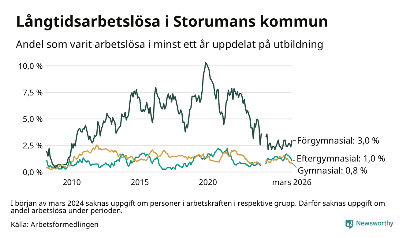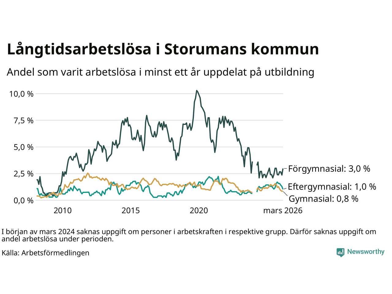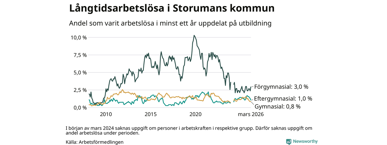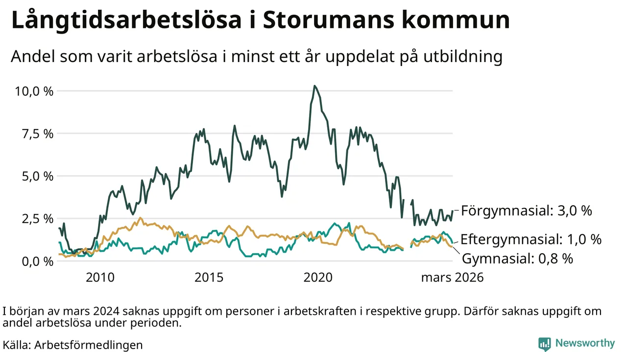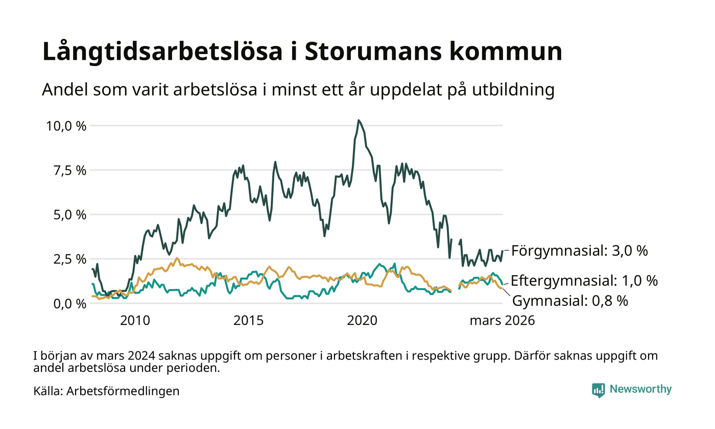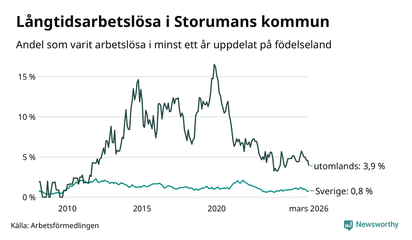 I mars hade 30 Storumanbor varit arbetslösa i minst ett år, vilket är lika många som månaden innan. Det är den sjätte månaden i rad med minskande eller oförändrat antal långtidsarbetslösa. 30 personer motsvarar 1,2 procent av arbetskraften i kommunen – andelen långtidsarbetslösa är 0,3 procentenheter lägre än samma månad för ett år sedan. Storuman tillhör de kommuner som har lägst andel långtidsarbetslösa i hela landet just nu.