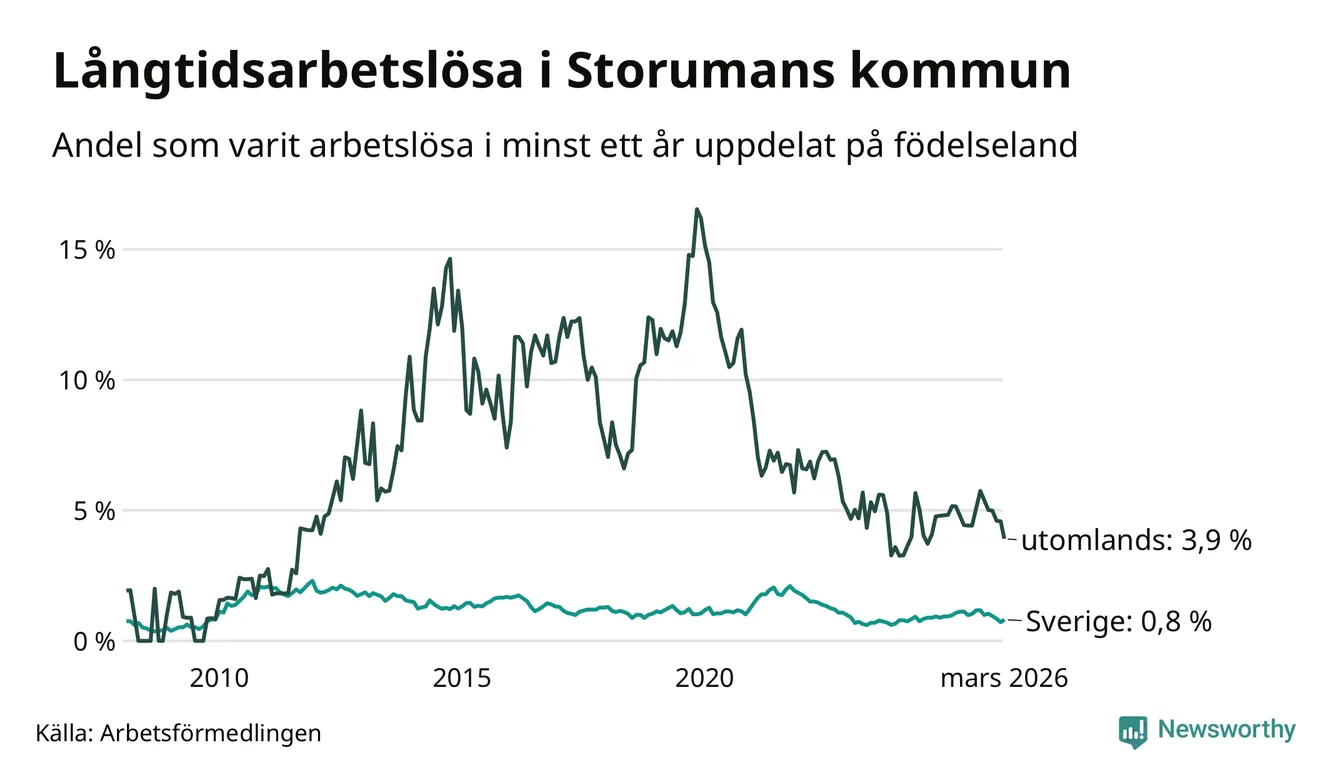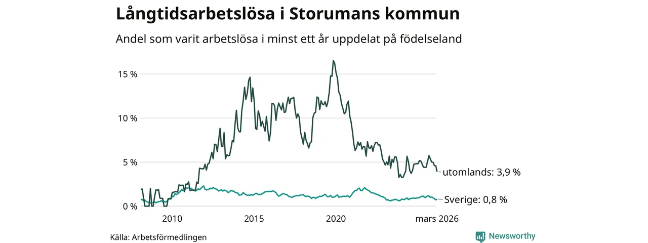 18 av de långtidsarbetslösa i Storuman är födda i Sverige, medan tolv är födda utomlands. Det innebär att långtidsarbetslösheten bland Sverigefödda är 0,8 procent, medan den är fem gånger så hög – 3,9 procent – bland födda utomlands. Även i riket som helhet är arbetslösheten högre bland utrikesfödda.