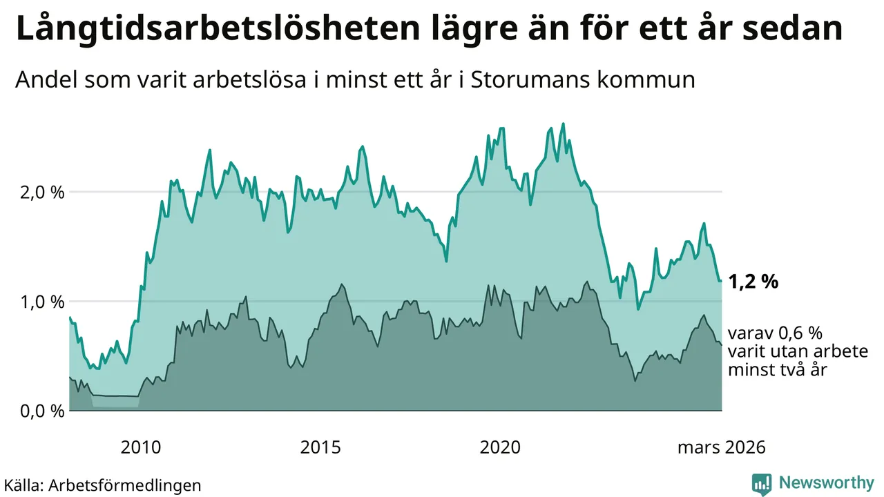Andelen som varit utan arbete i minst ett år i Storuman var lägre i mars jämfört med samma månad för ett år sedan. Det visar Arbetsfömedlingens senaste månadsstatistik.
