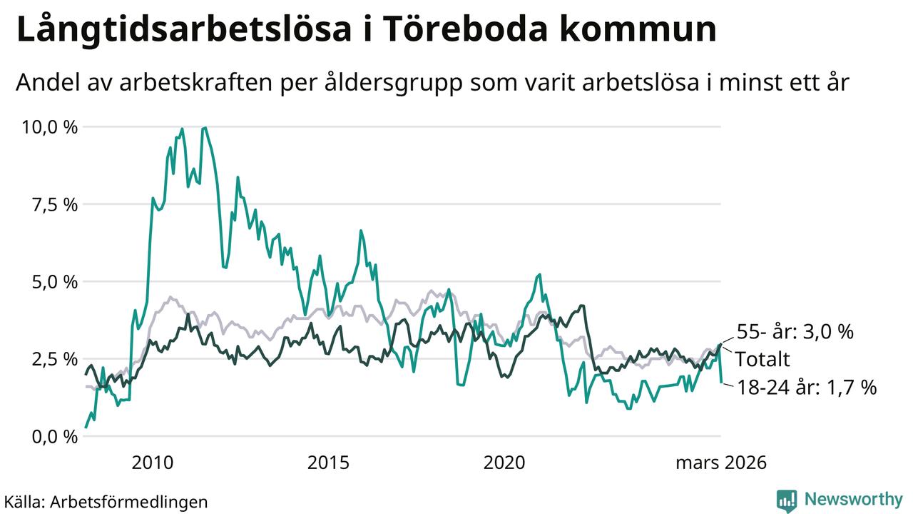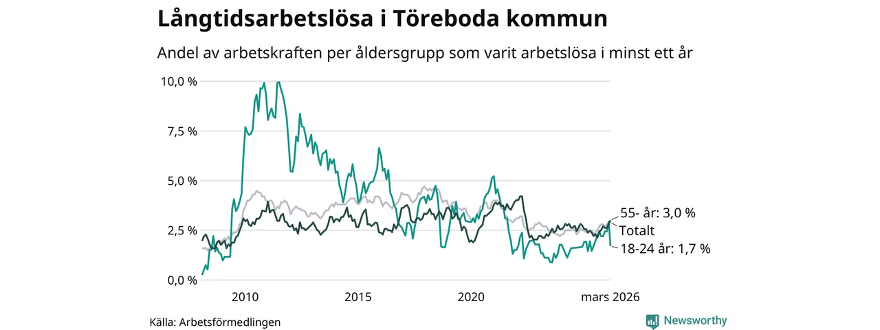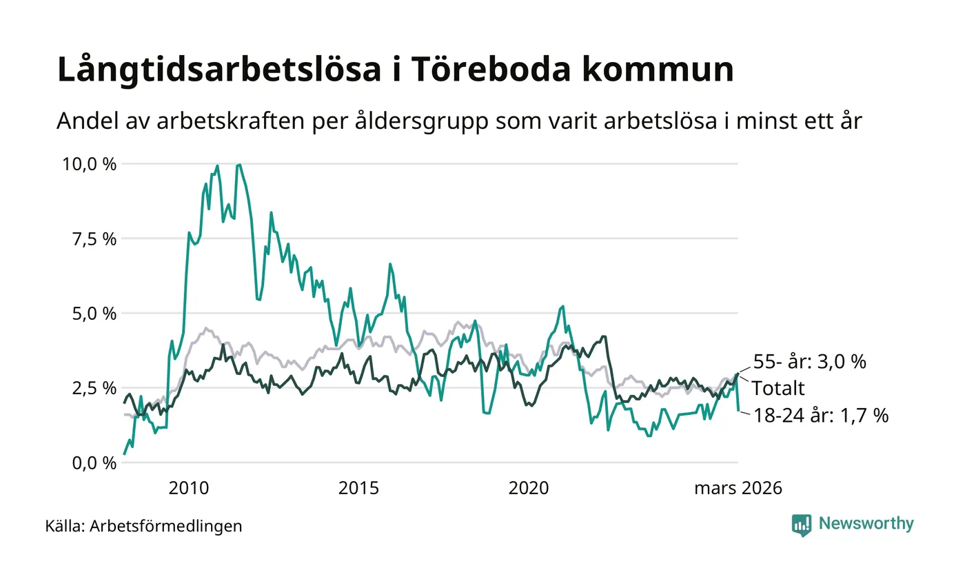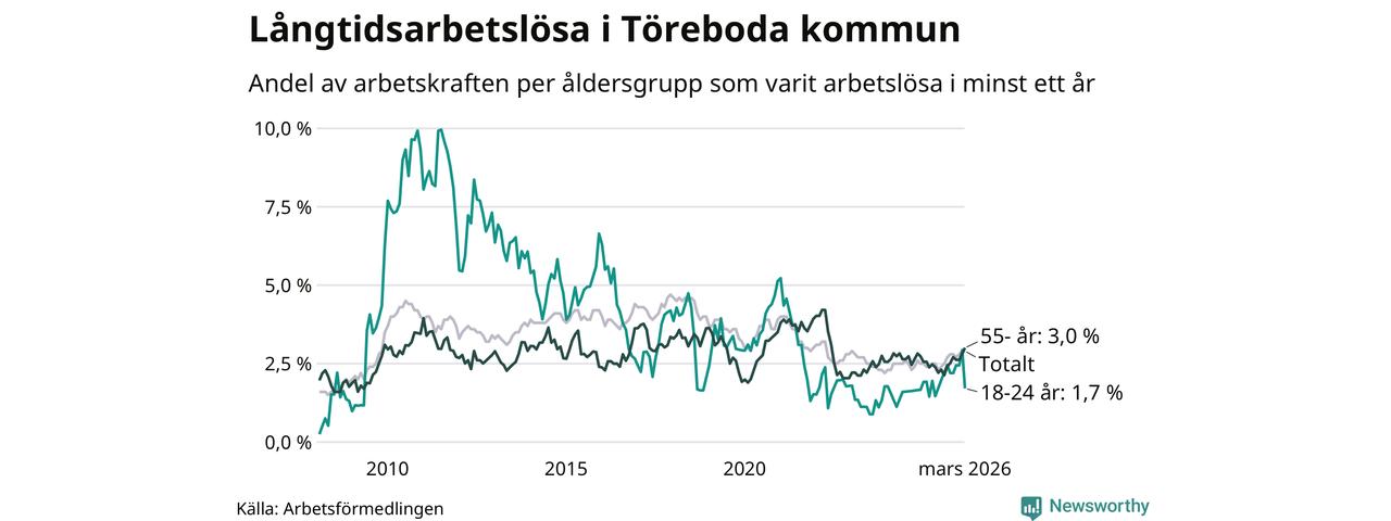 Av de 117 personerna som varit arbetslösa i mer än ett år i Töreboda kommun är 32 personer mellan 55 och 661 år och sju är mellan 18 och 24 år. För den äldre gruppen är andelen arbetslösa 3,0 procent medan den i den yngre gruppen är 1,7 procent. Även i riket som helhet är långtidsarbetslösheten högre i gruppen äldre.