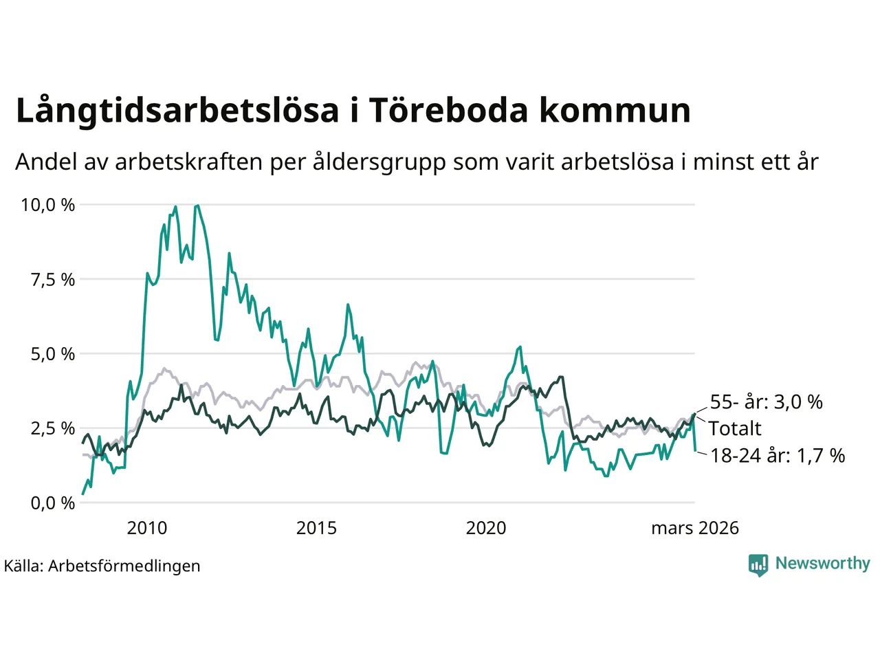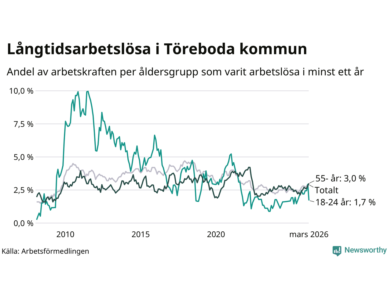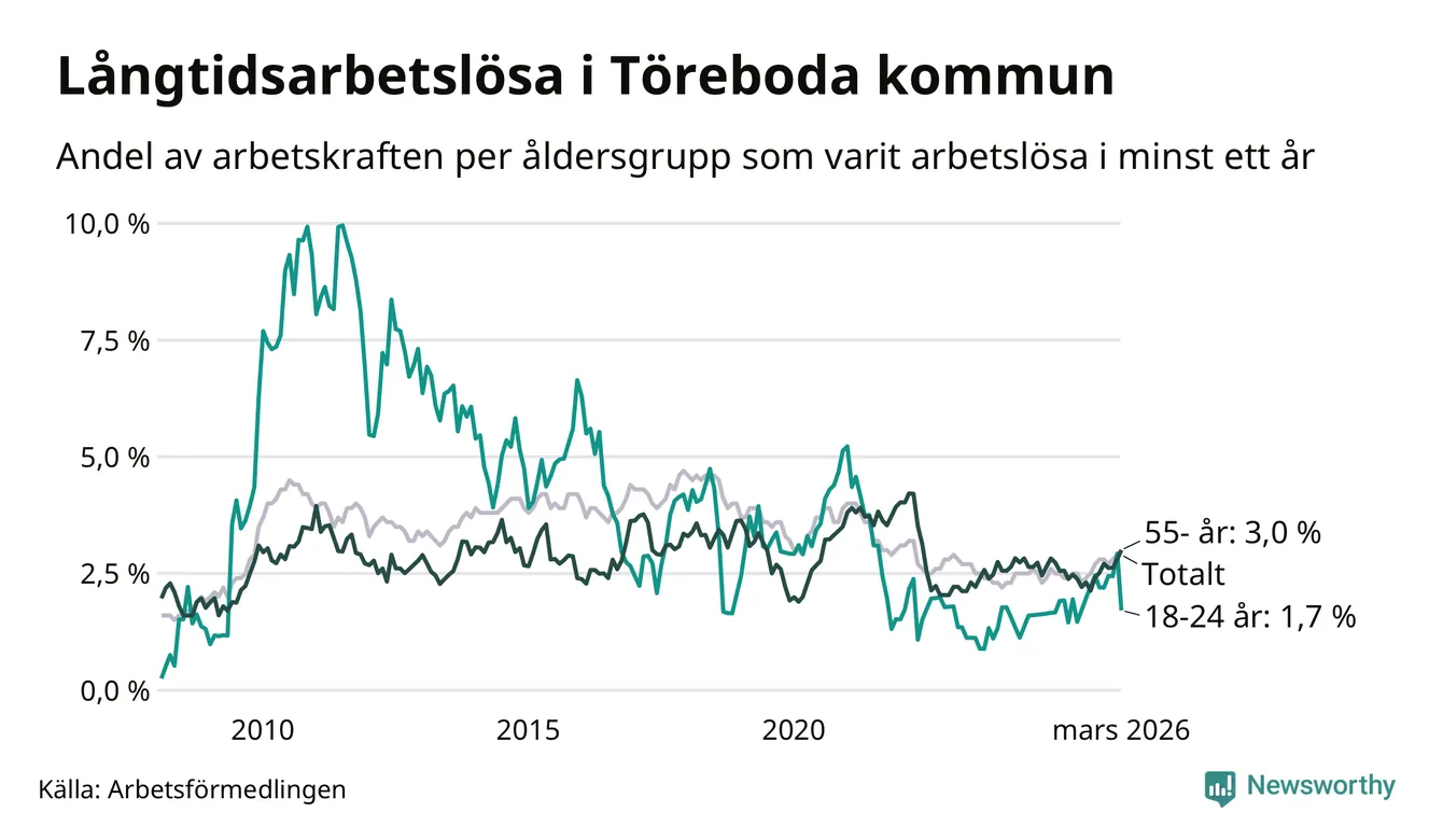 Av de 117 personerna som varit arbetslösa i mer än ett år i Töreboda kommun är 32 personer mellan 55 och 661 år och sju är mellan 18 och 24 år. För den äldre gruppen är andelen arbetslösa 3,0 procent medan den i den yngre gruppen är 1,7 procent. Även i riket som helhet är långtidsarbetslösheten högre i gruppen äldre.