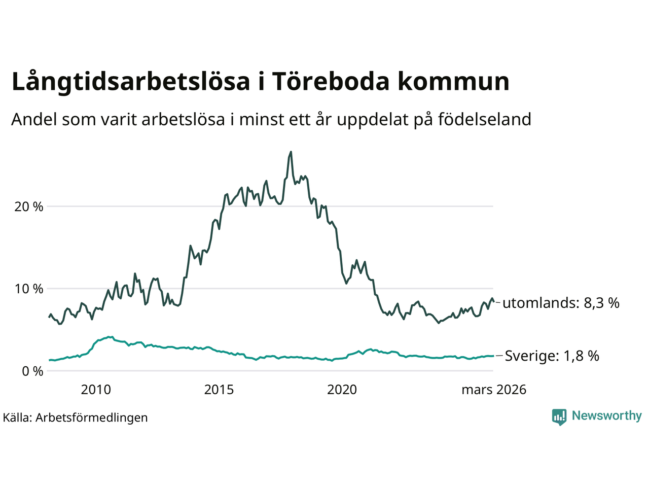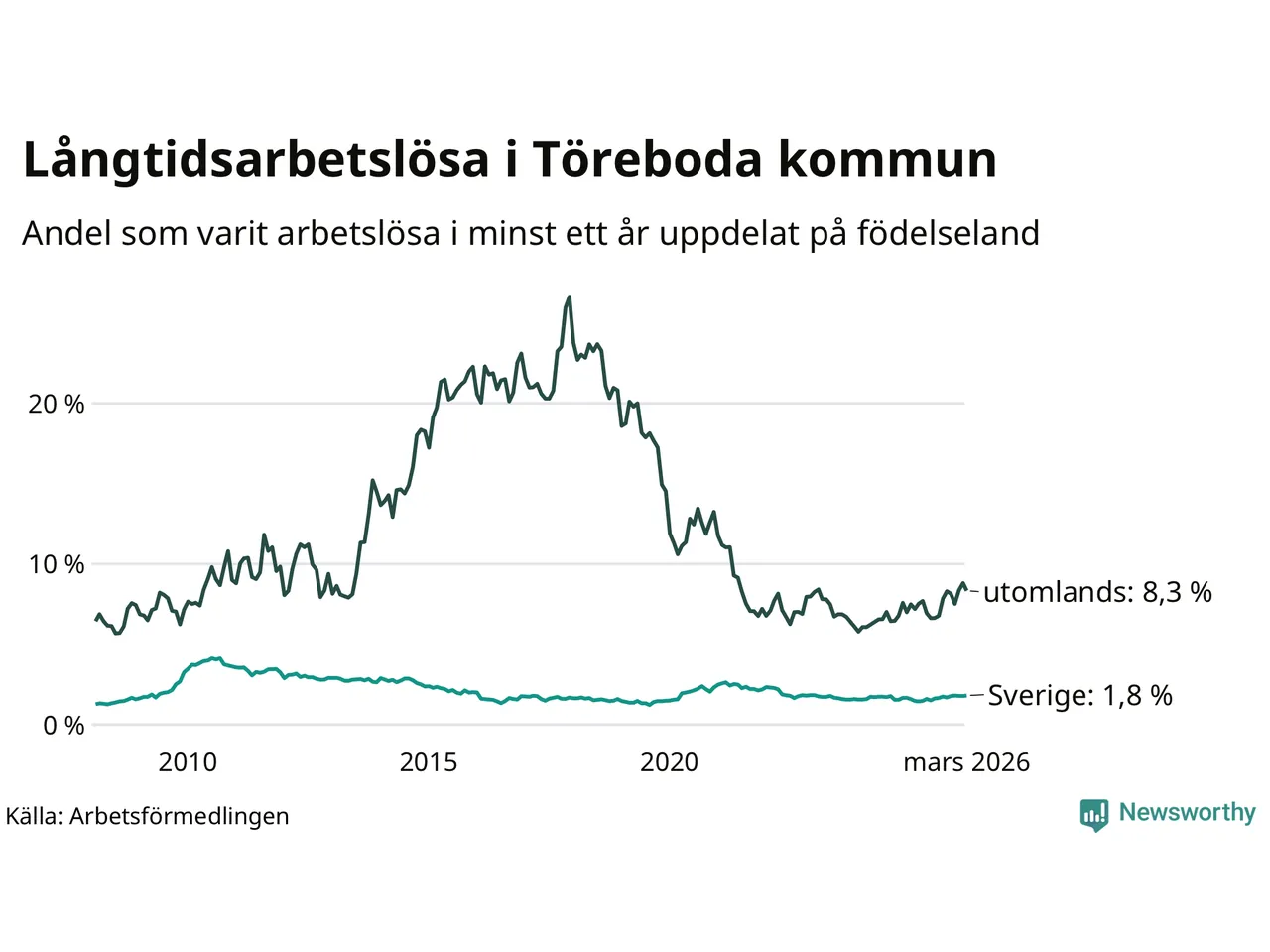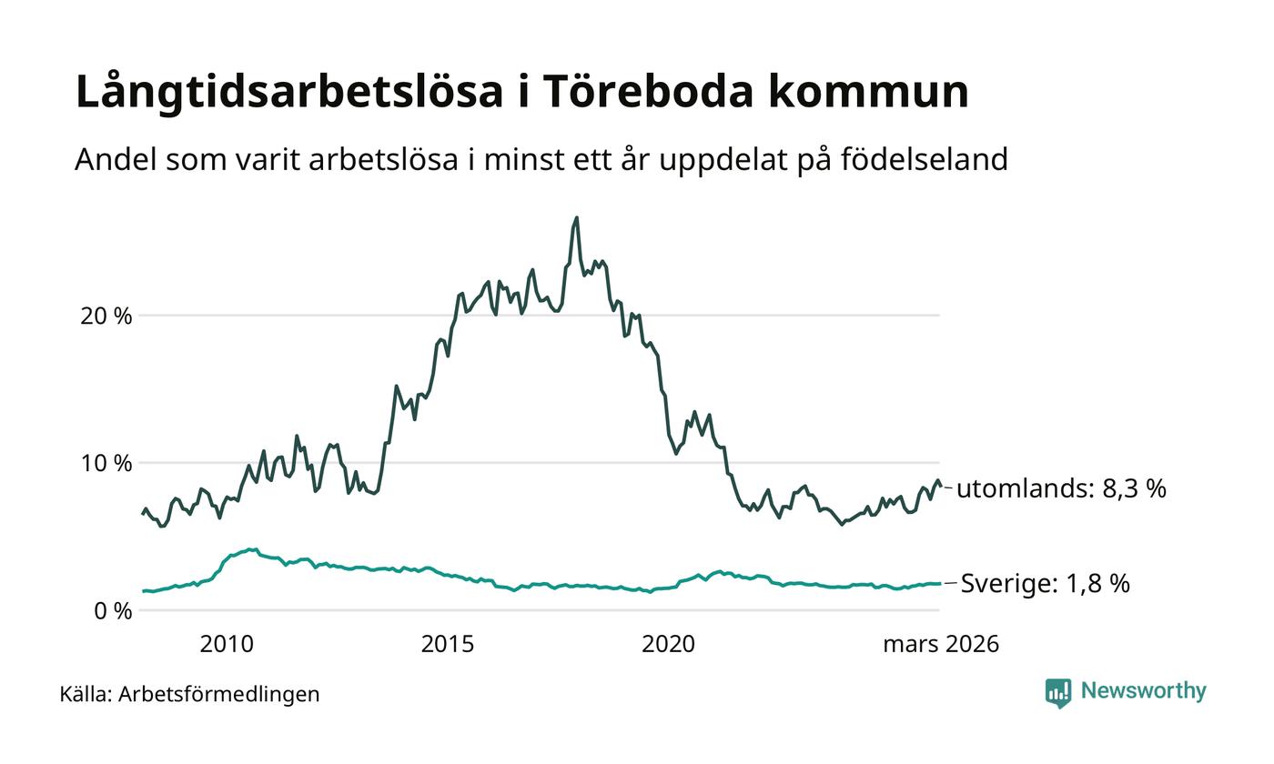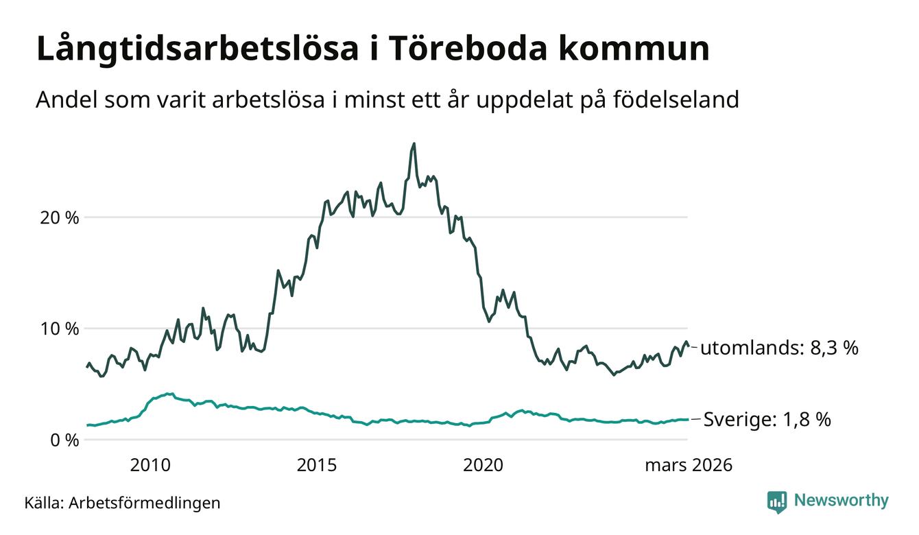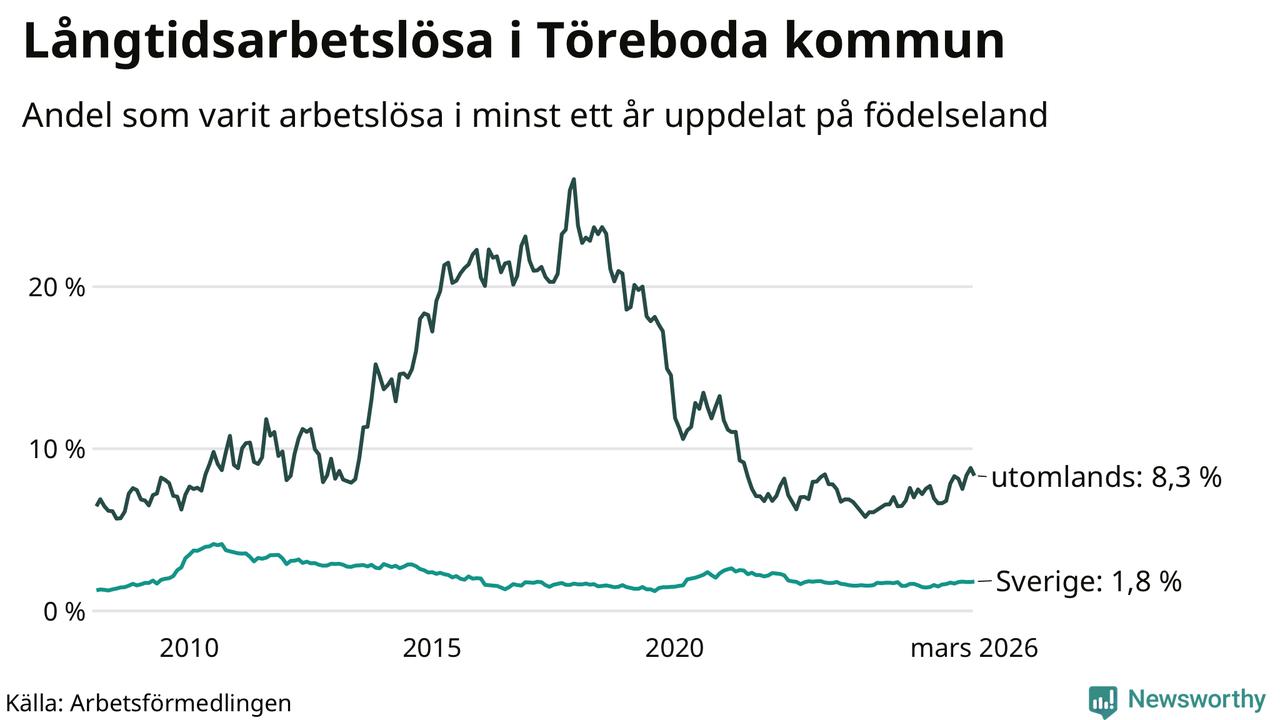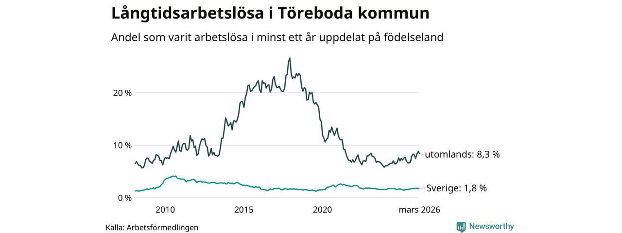 62 av de långtidsarbetslösa i Töreboda är födda i Sverige, medan 55 är födda utomlands. Det innebär att långtidsarbetslösheten bland Sverigefödda är 1,8 procent, medan den är fem gånger så hög – 8,3 procent – bland födda utomlands. Även i riket som helhet är arbetslösheten högre bland utrikesfödda.