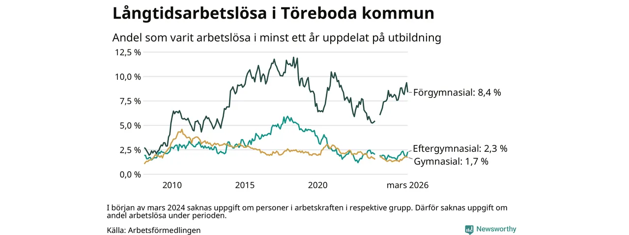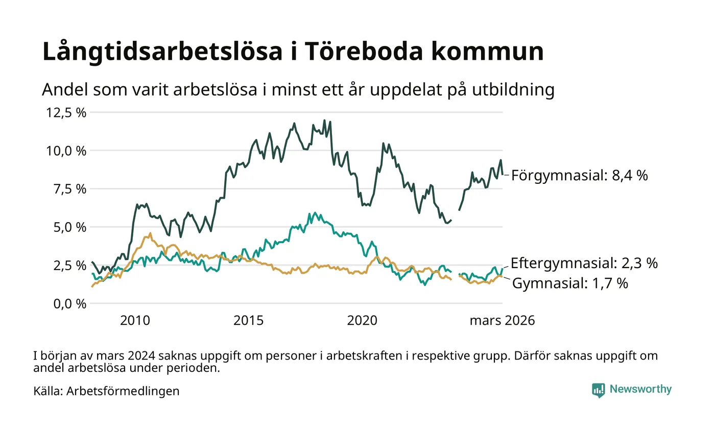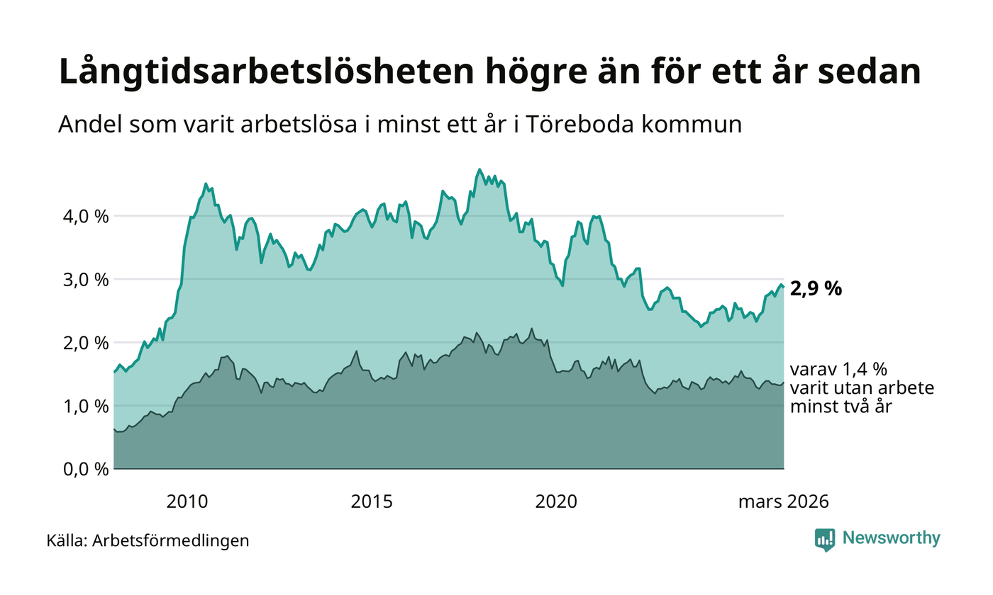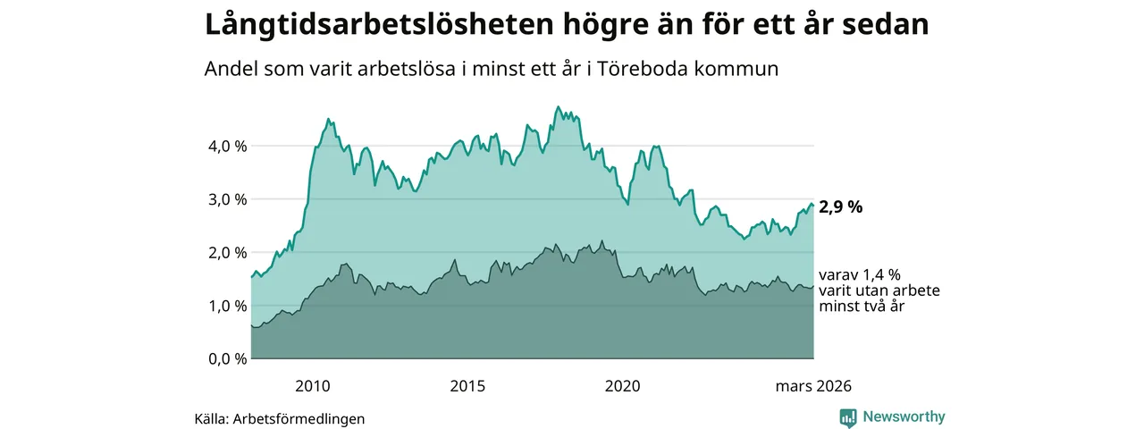 Andelen som varit utan arbete i minst ett år i Töreboda i mars var högre än för ett år sedan. Men jämfört med i februari har antalet långtidsarbetslösa minskat.