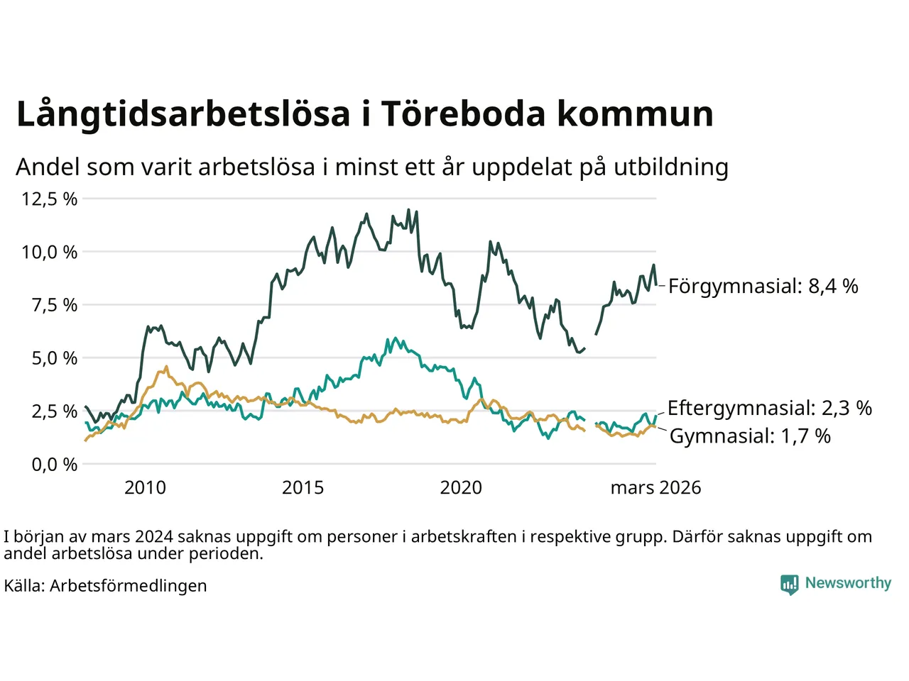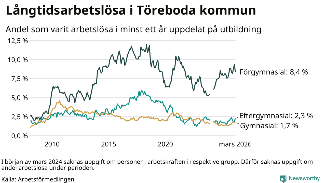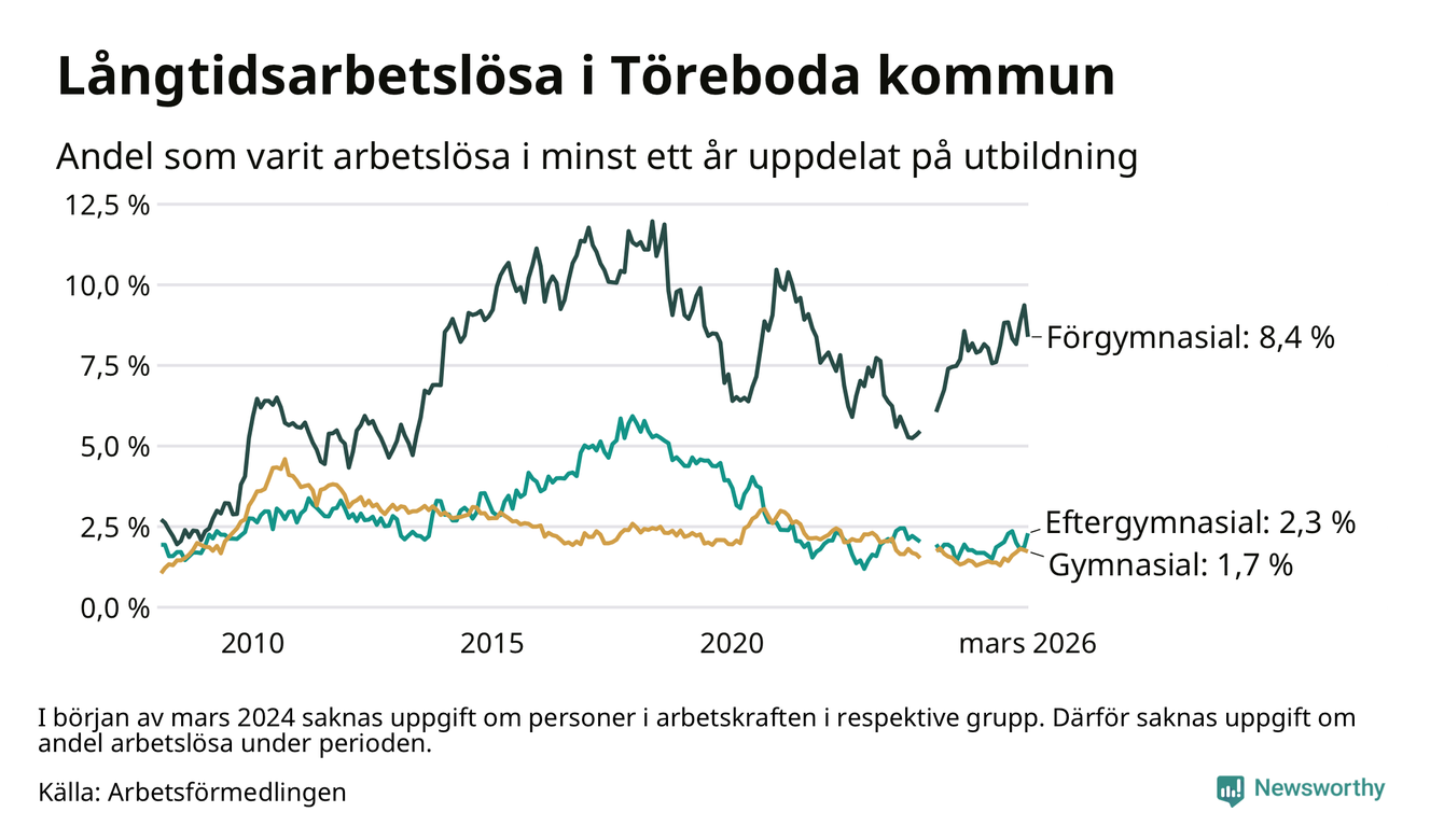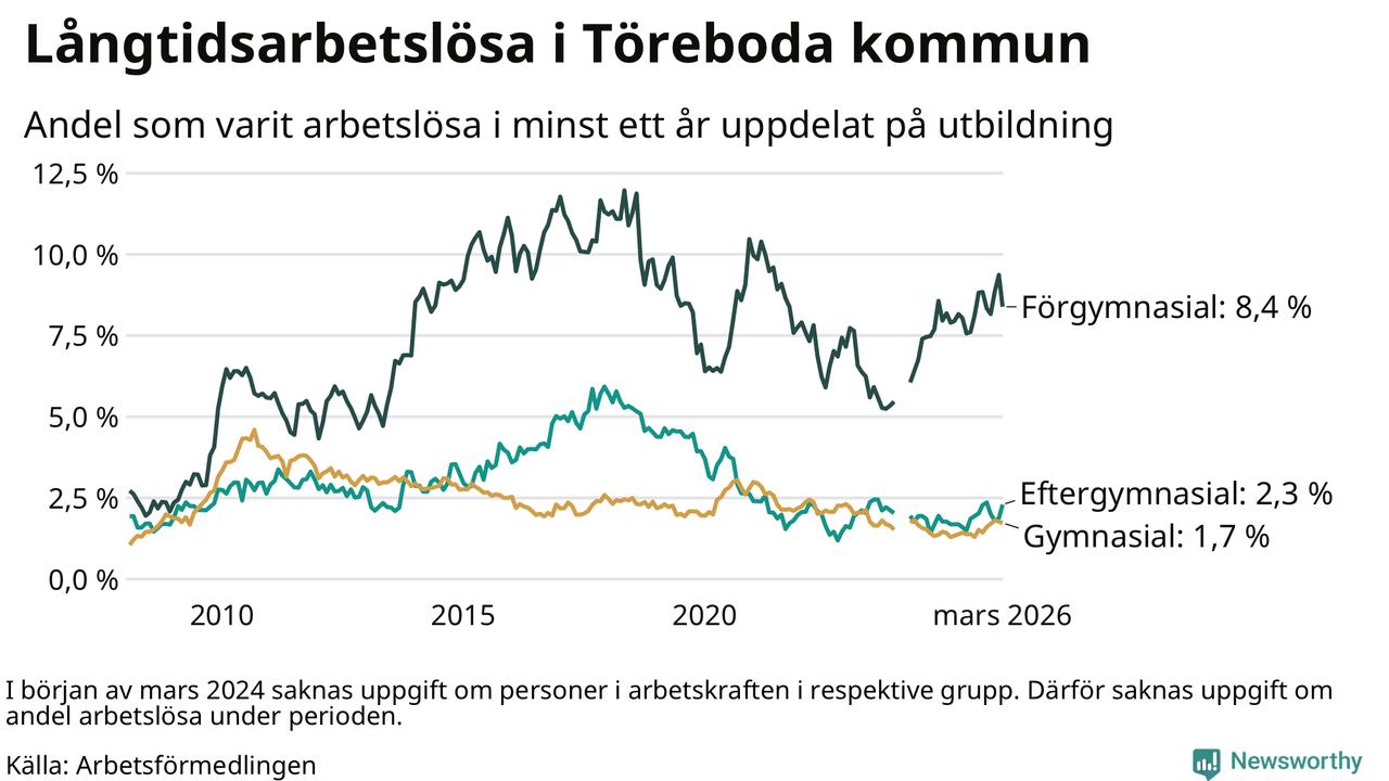 Andelen som varit utan arbete i minst ett år i Töreboda i mars var högre än för ett år sedan. Men jämfört med i februari har antalet långtidsarbetslösa minskat.
