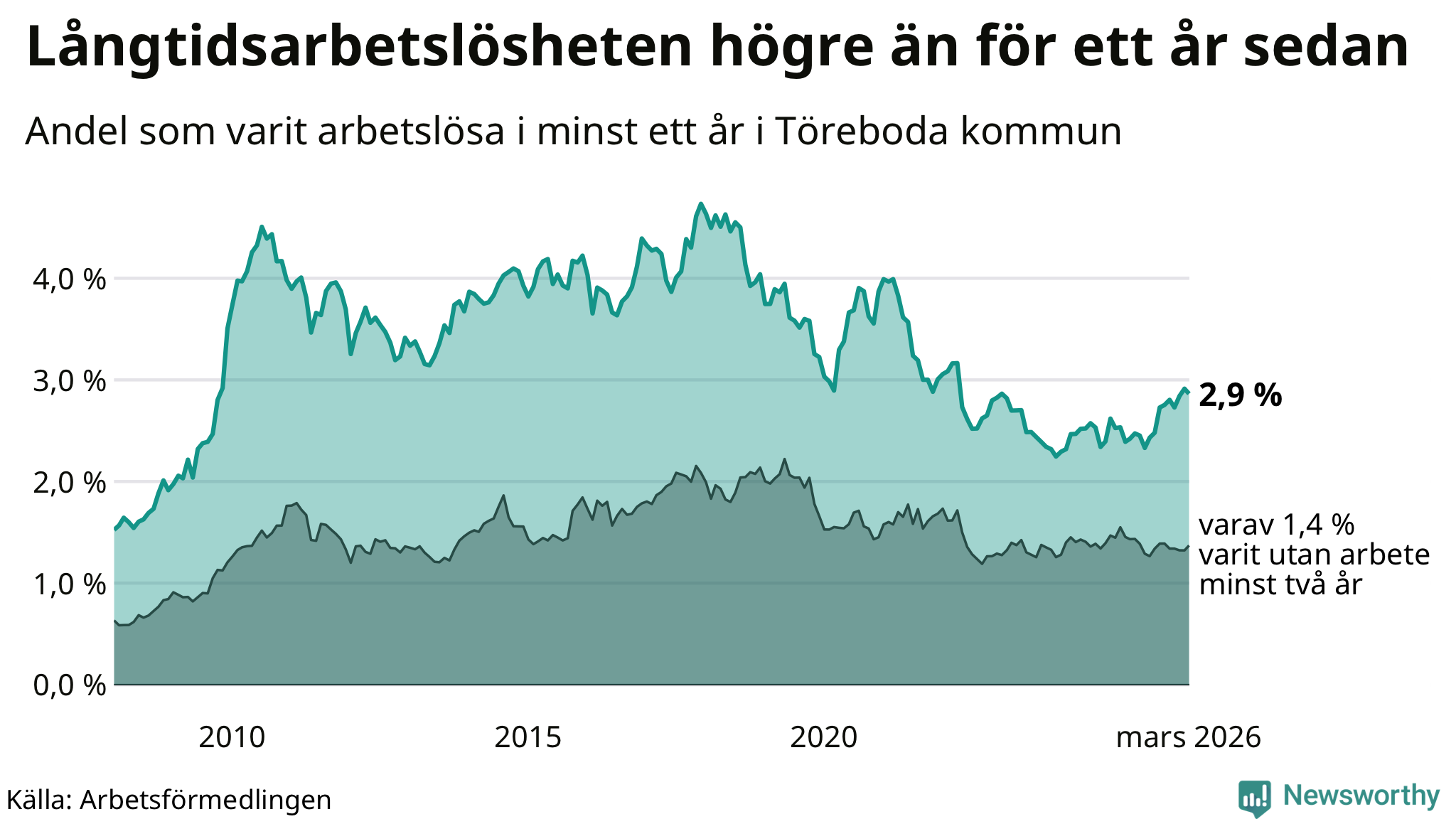 | Andel arbetslösa i minst två år | 1,4 % | 1,3 % | 1,6 % |