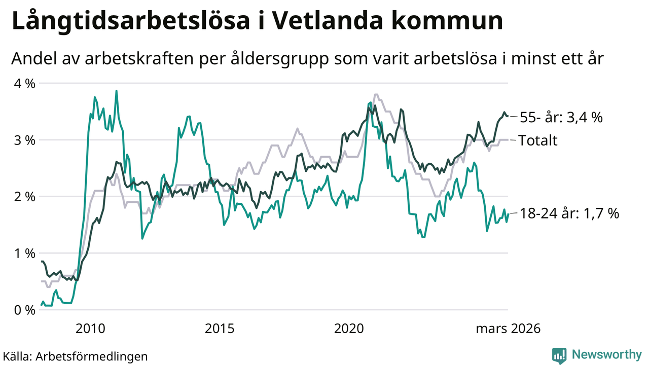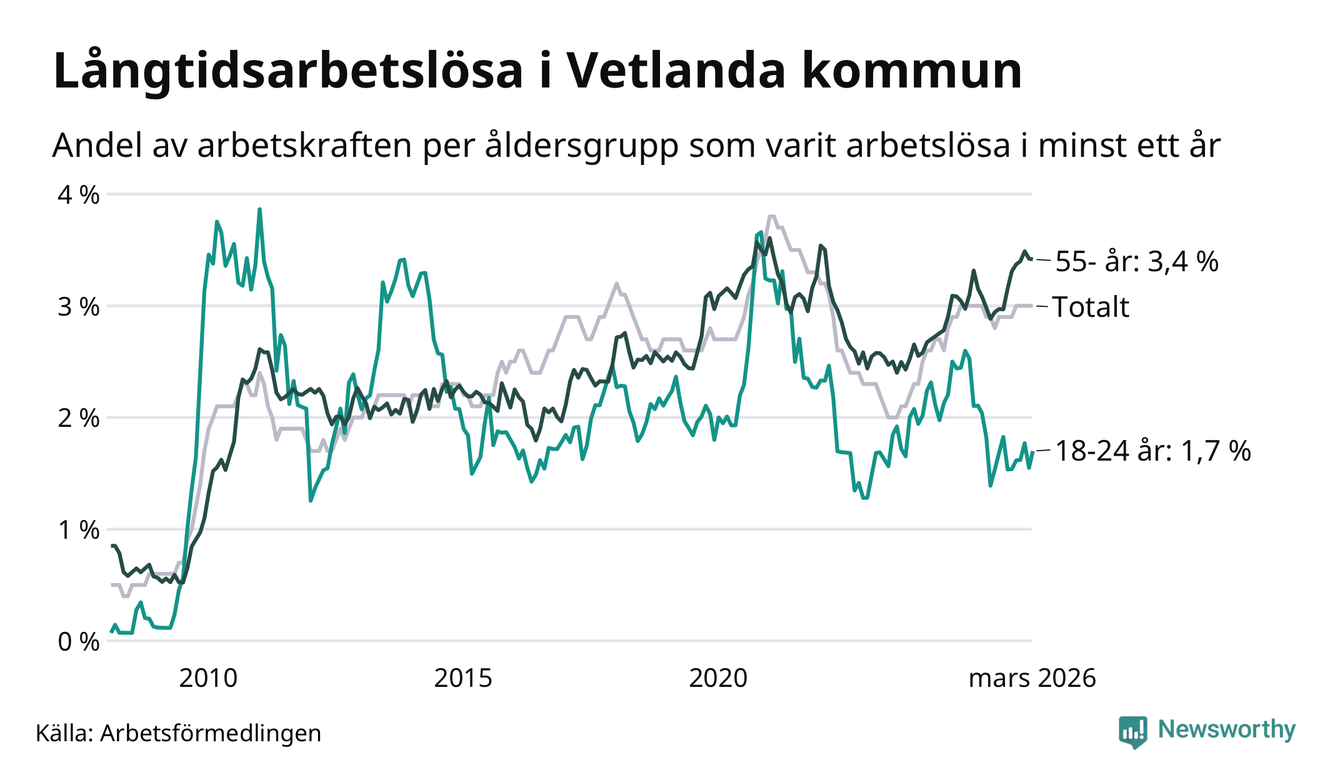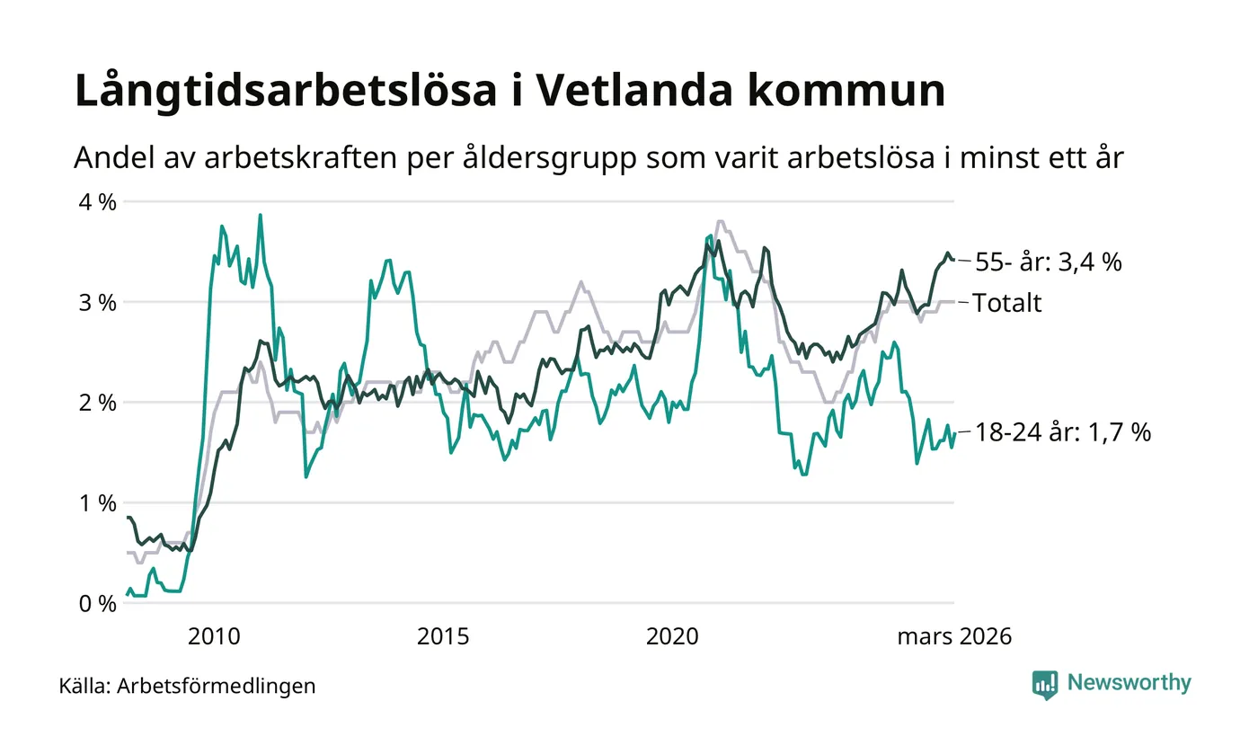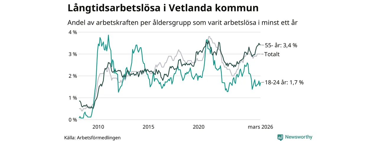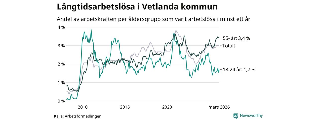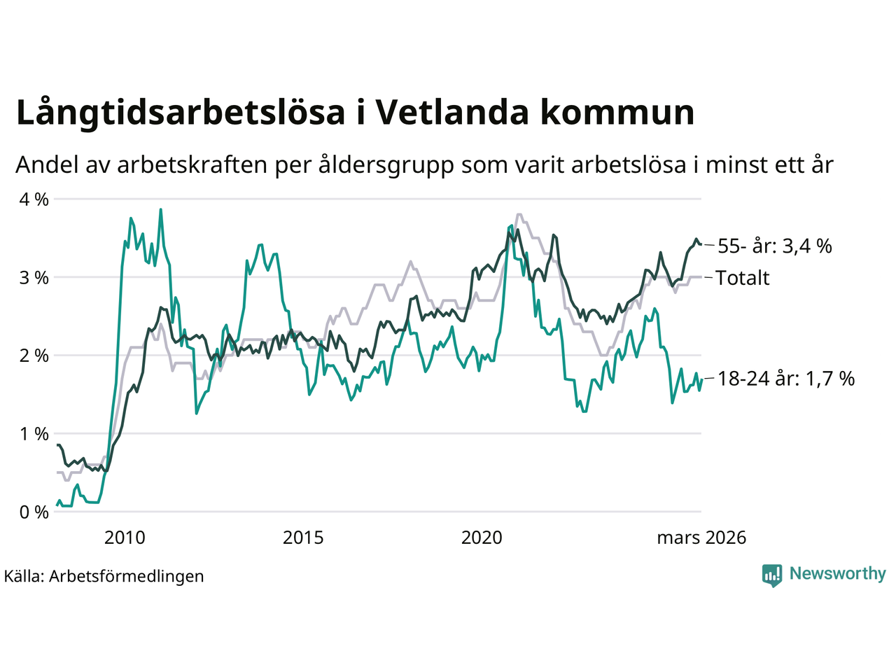 Av de 387 personerna som varit arbetslösa i mer än ett år i Vetlanda kommun är 109 personer mellan 55 och 661 år och 23 är mellan 18 och 24 år. För den äldre gruppen är andelen arbetslösa 3,4 procent medan den i den yngre gruppen är 1,7 procent. Även i riket som helhet är långtidsarbetslösheten högre i gruppen äldre.