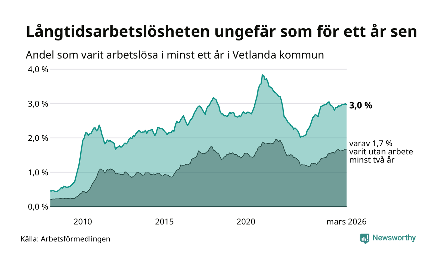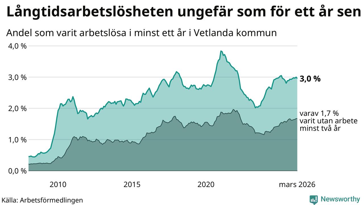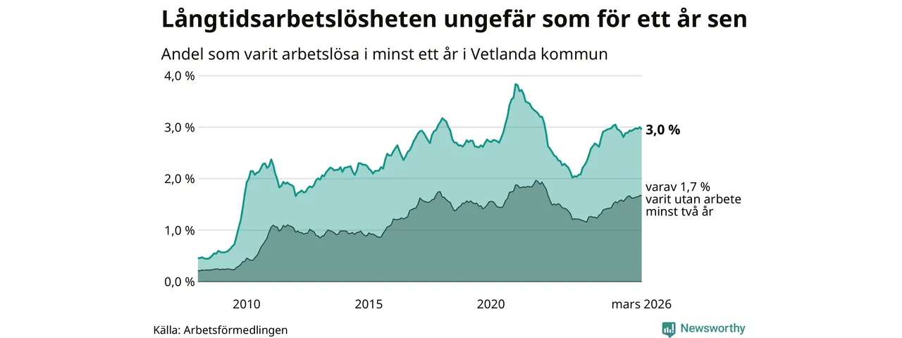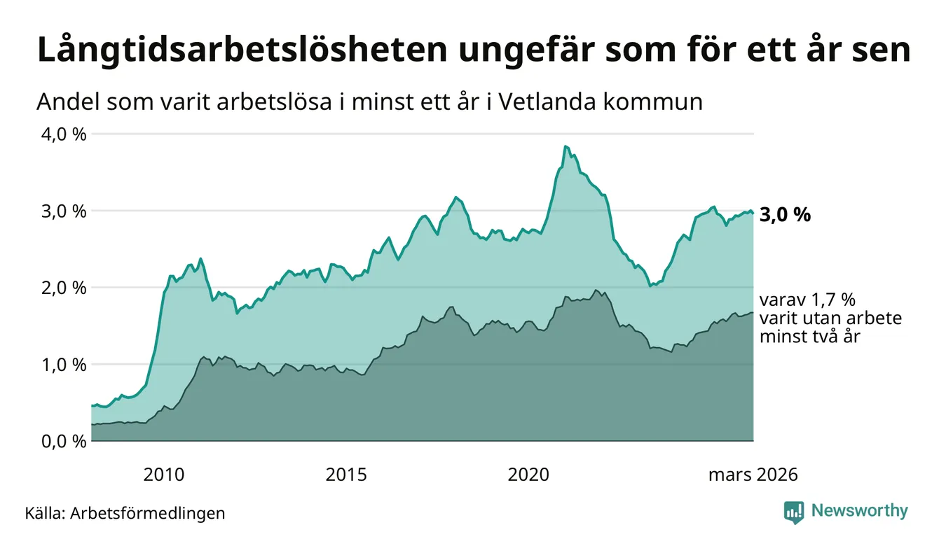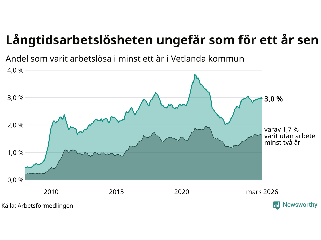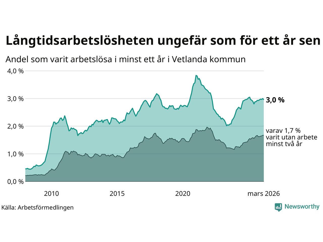 I mars hade 387 Vetlandabor varit arbetslösa i minst ett år, vilket är sex färre än månaden innan. Det är den första månaden sedan oktober 2025 som antalet arbetslösa minskar. 387 personer motsvarar 3,0 procent av arbetskraften i kommunen – andelen långtidsarbetslösa är ungefär på samma nivå som för ett år sedan.