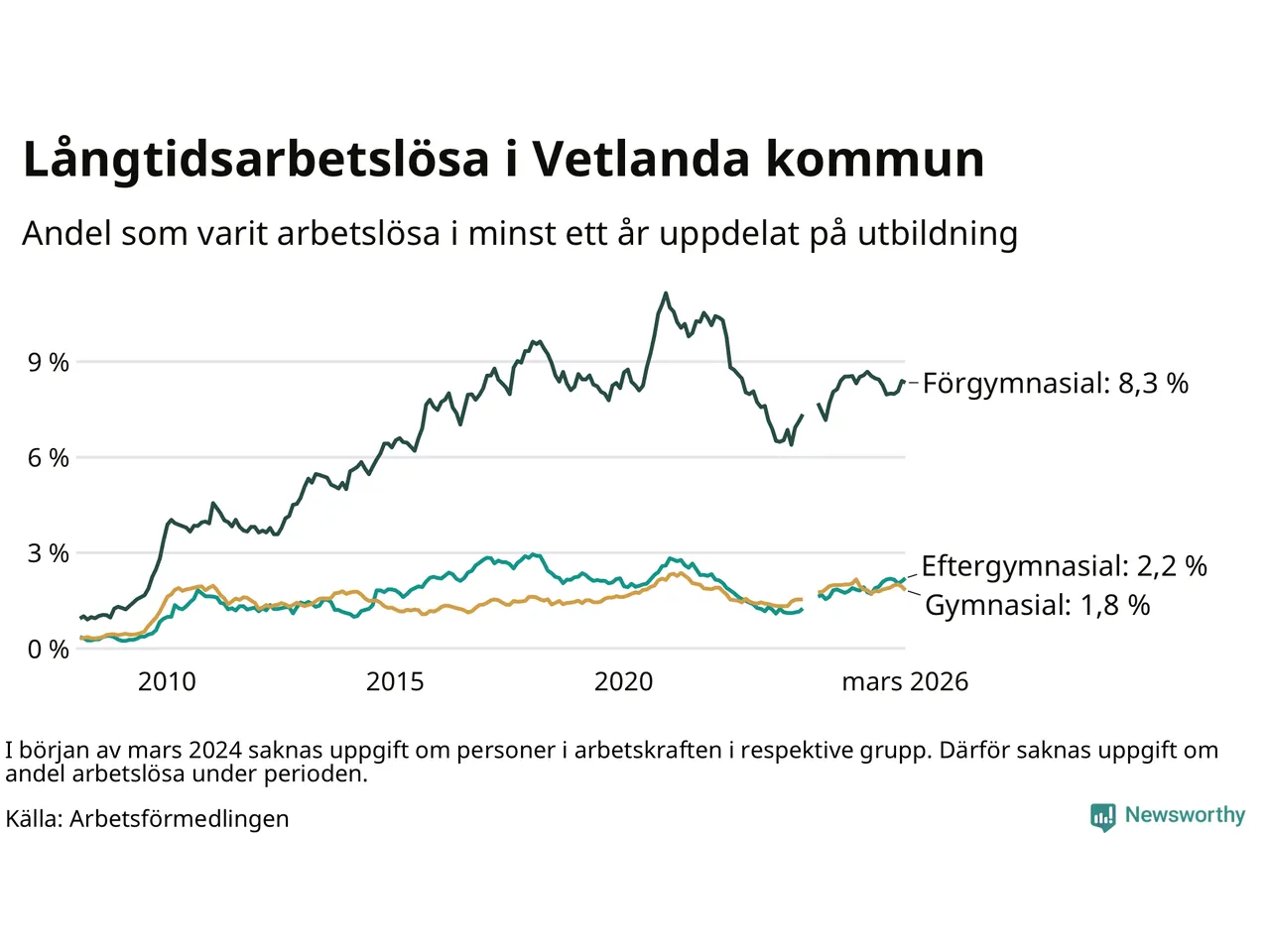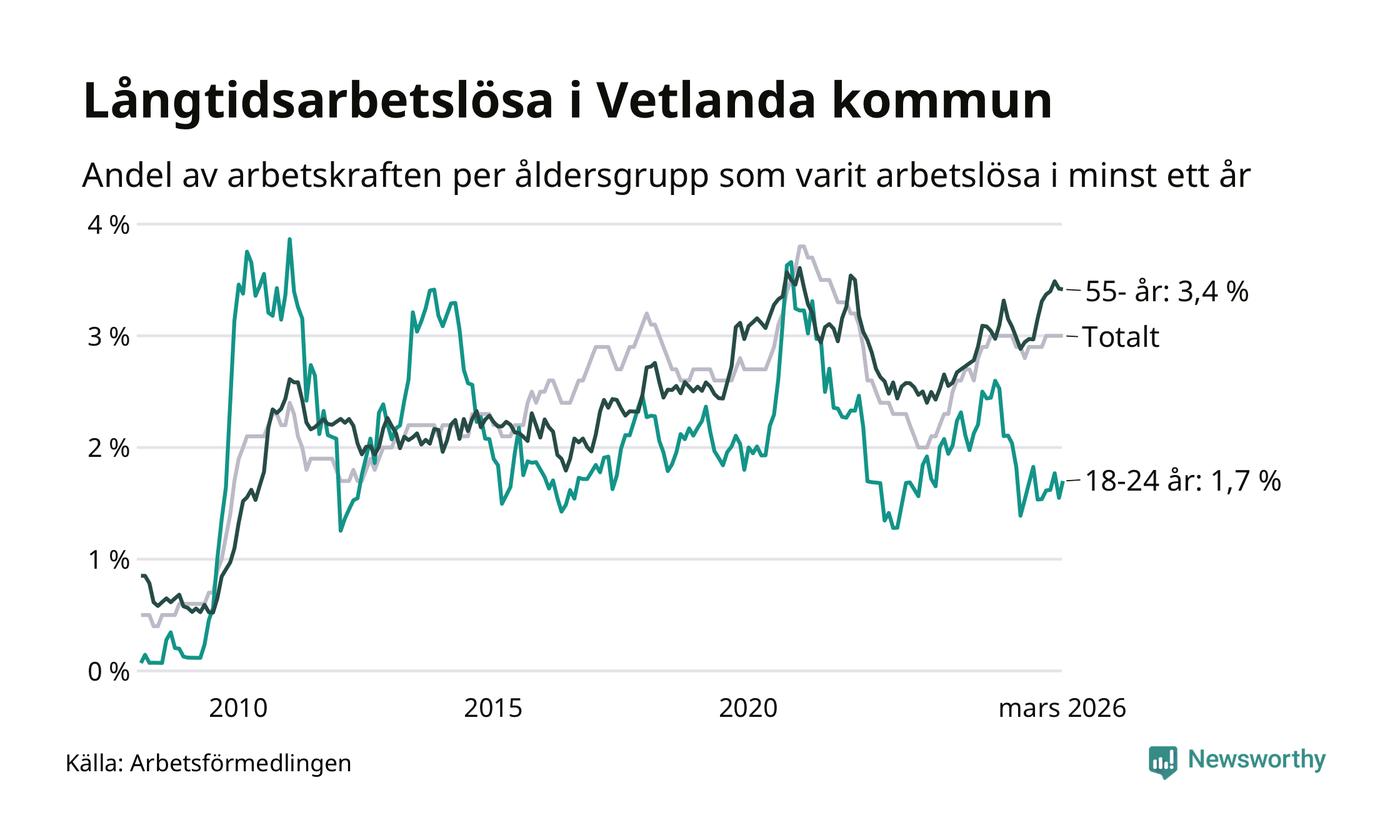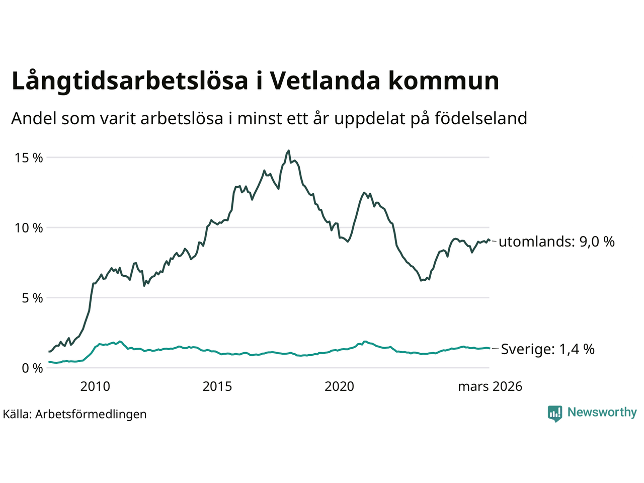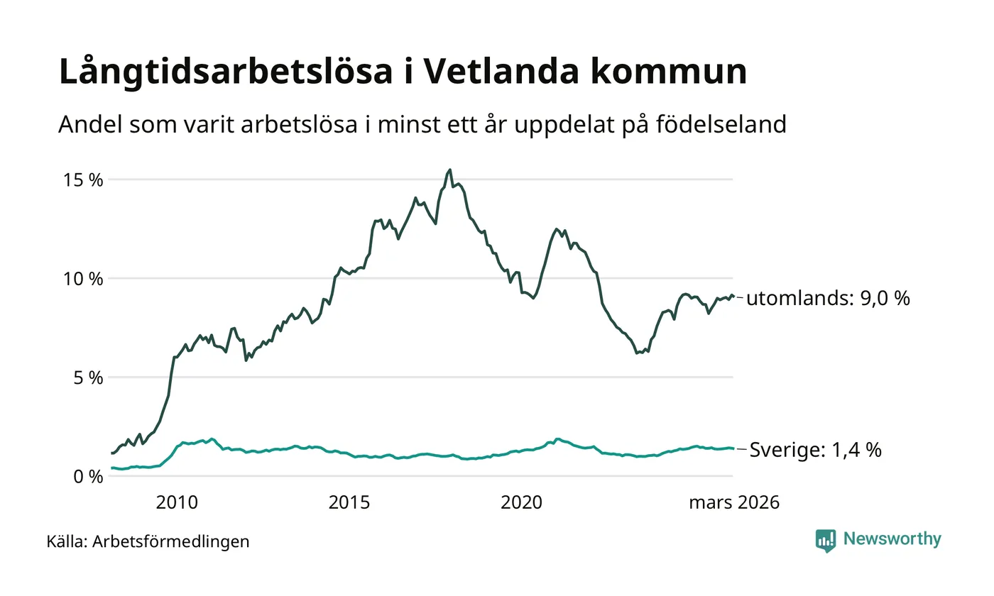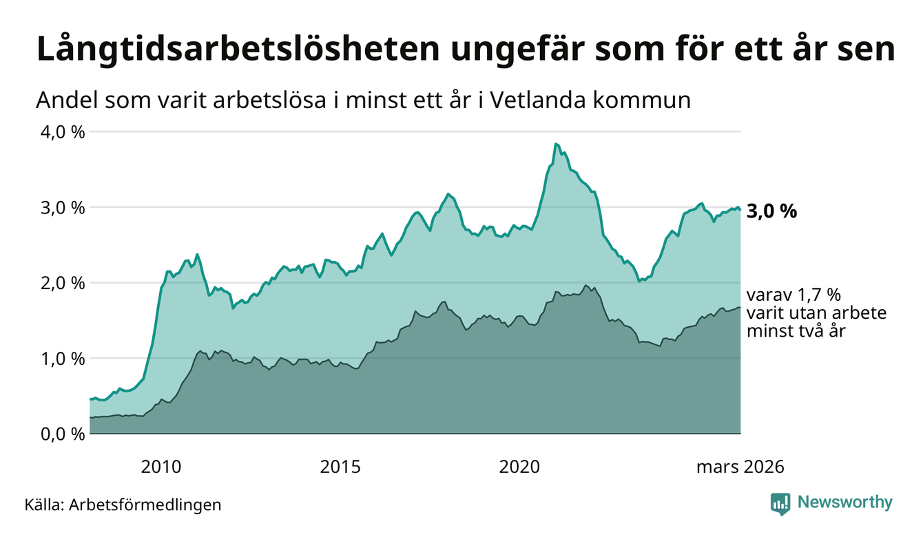 I mars hade 387 Vetlandabor varit arbetslösa i minst ett år, vilket är sex färre än månaden innan. Det är den första månaden sedan oktober 2025 som antalet arbetslösa minskar. 387 personer motsvarar 3,0 procent av arbetskraften i kommunen – andelen långtidsarbetslösa är ungefär på samma nivå som för ett år sedan.