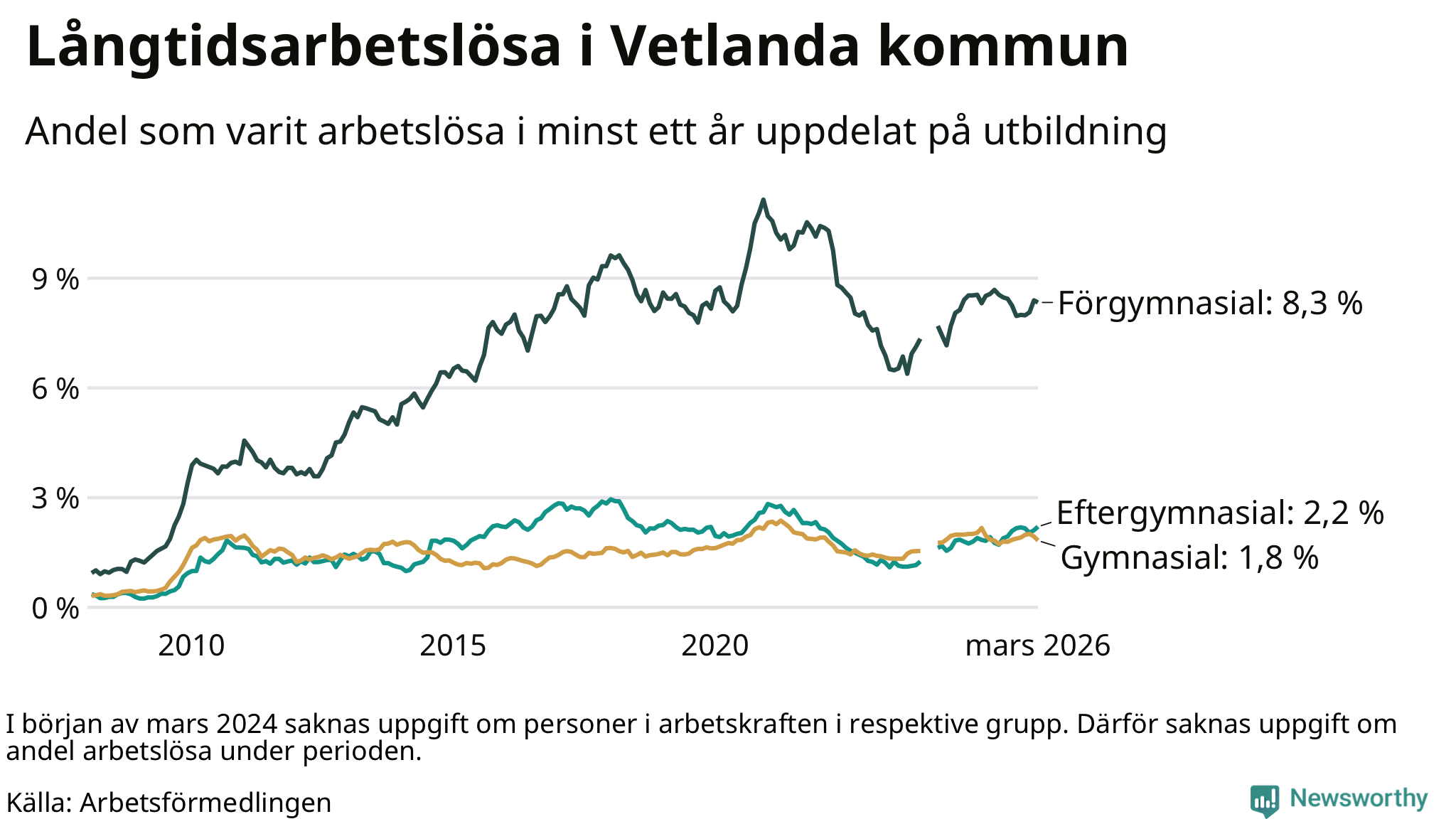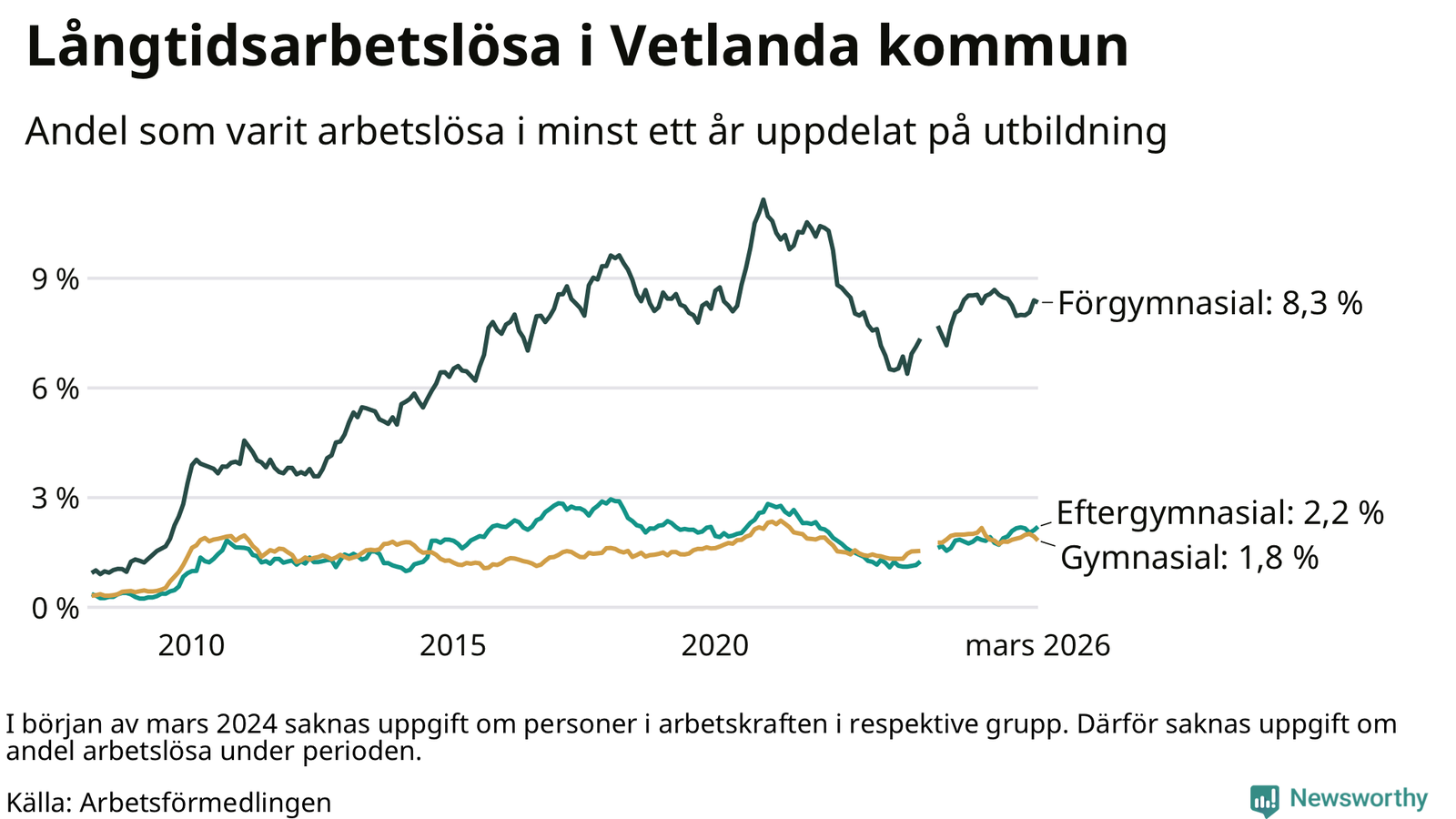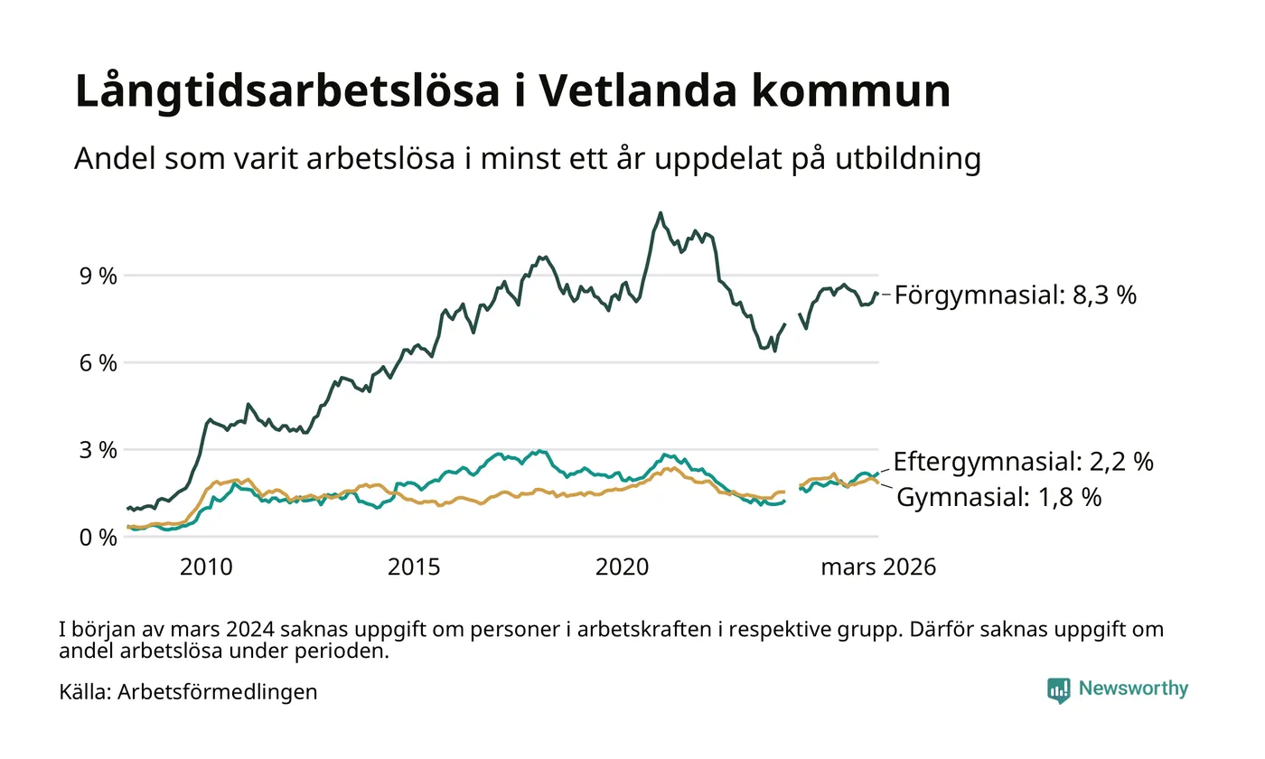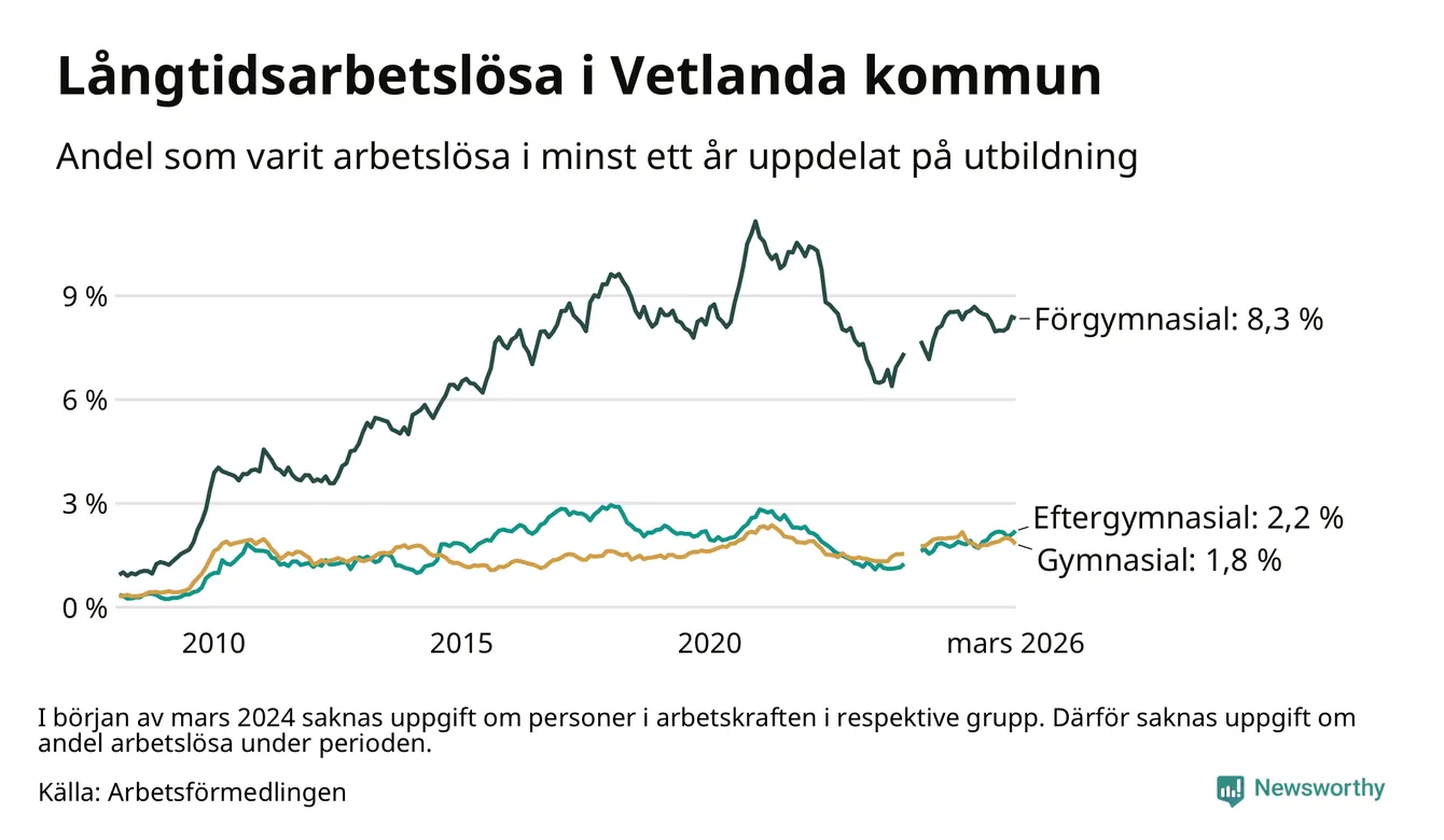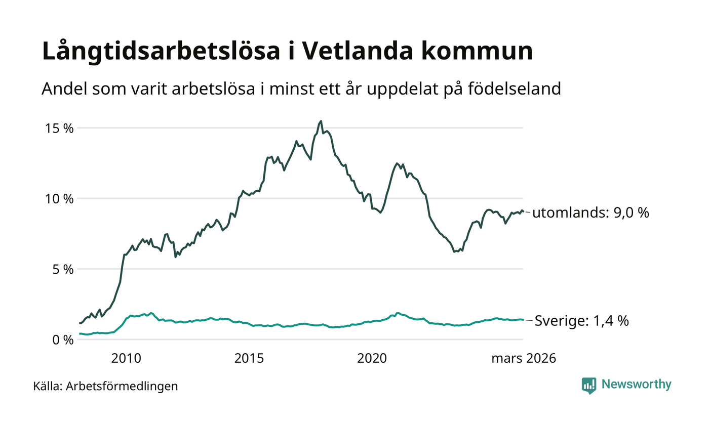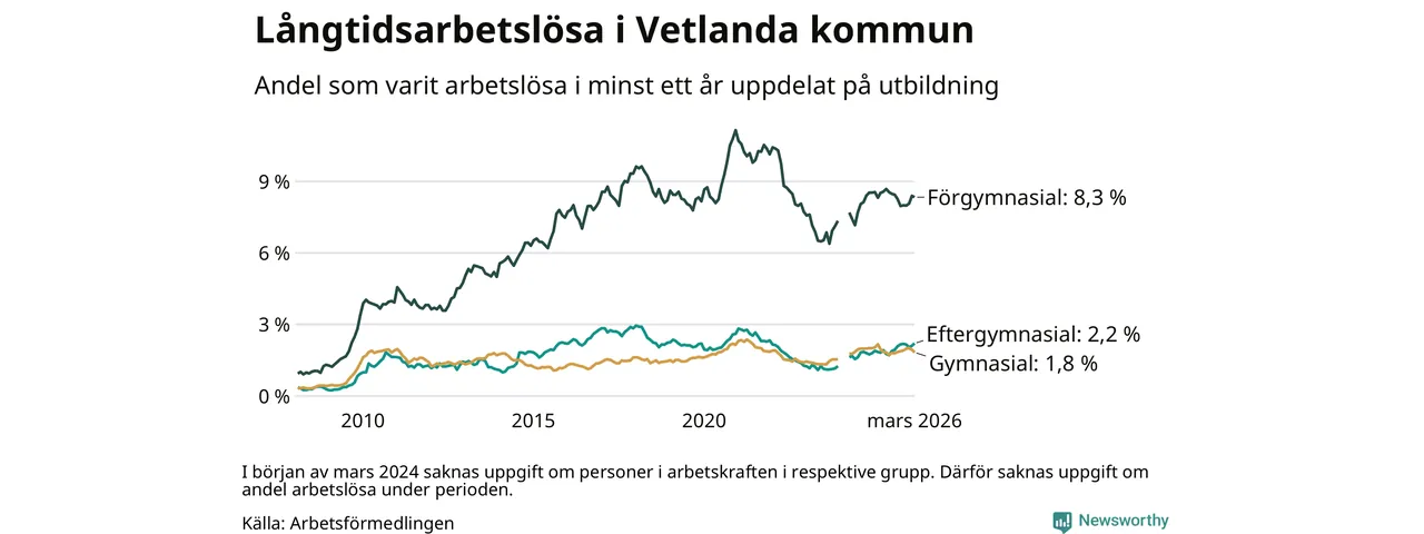 I mars hade 387 Vetlandabor varit arbetslösa i minst ett år, vilket är sex färre än månaden innan. Det är den första månaden sedan oktober 2025 som antalet arbetslösa minskar. 387 personer motsvarar 3,0 procent av arbetskraften i kommunen – andelen långtidsarbetslösa är ungefär på samma nivå som för ett år sedan.