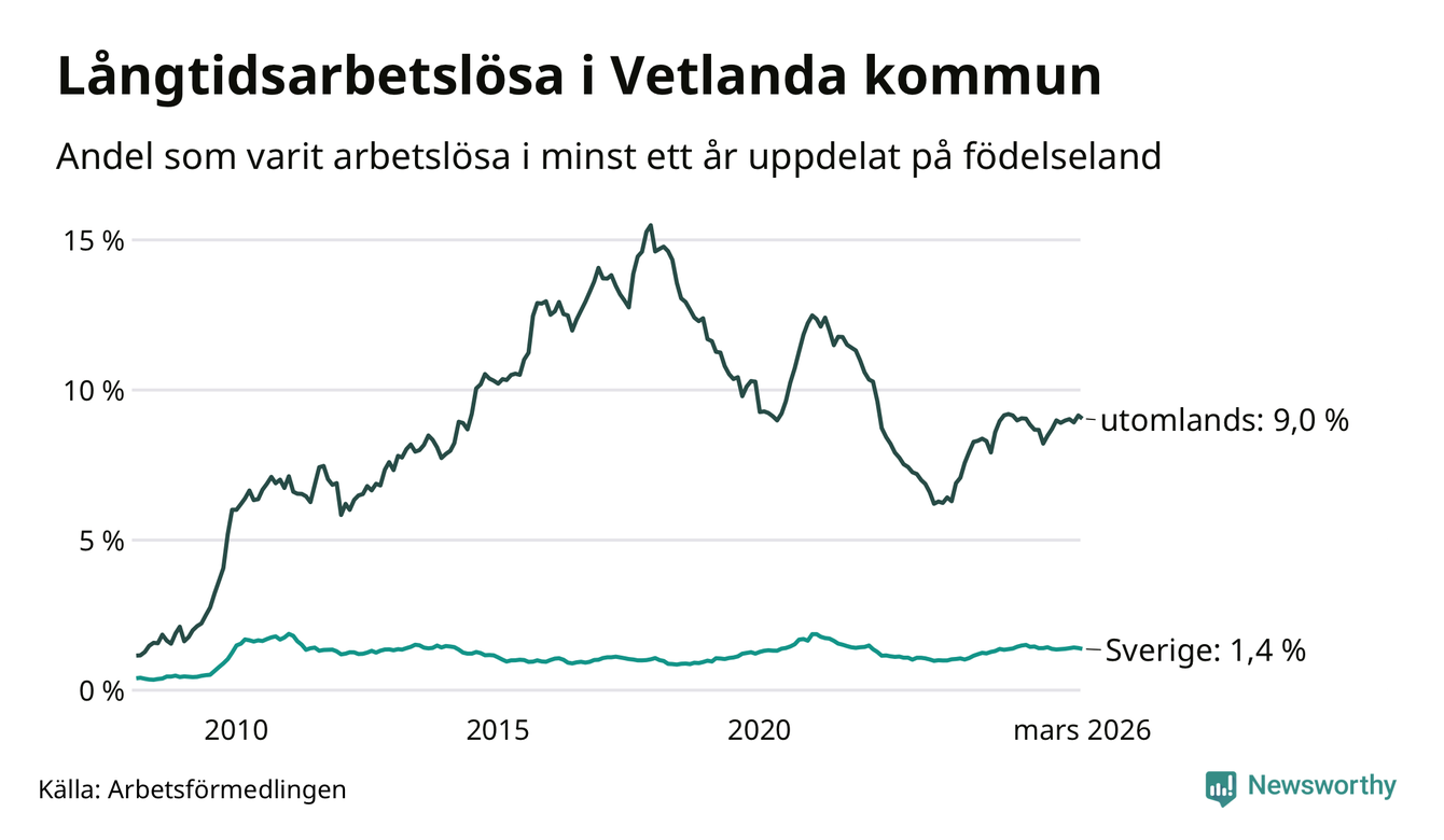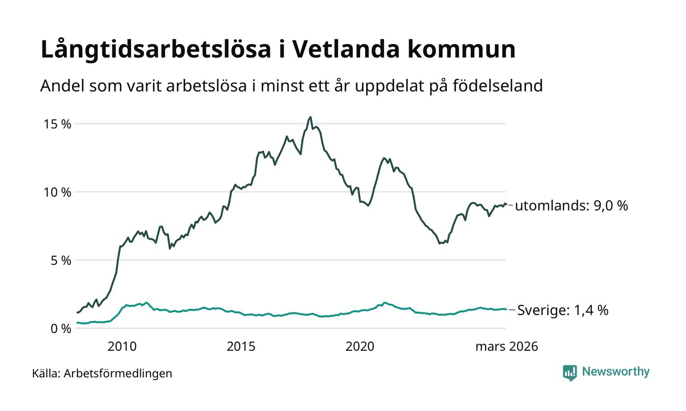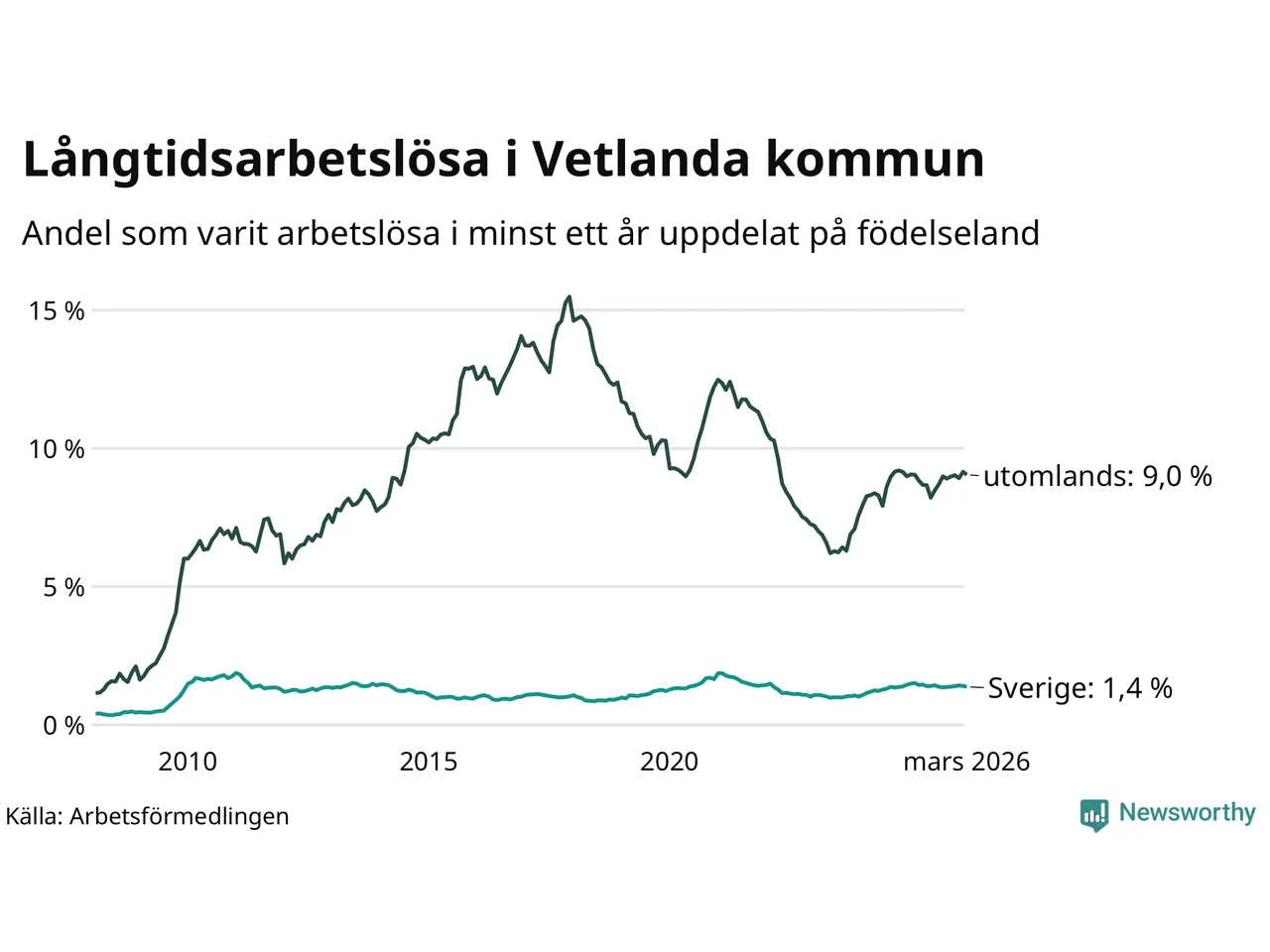 143 av de långtidsarbetslösa i Vetlanda är födda i Sverige, medan 244 är födda utomlands. Det innebär att långtidsarbetslösheten bland Sverigefödda är 1,4 procent, medan den är sex gånger så hög – 9,0 procent – bland födda utomlands. Även i riket som helhet är arbetslösheten högre bland utrikesfödda.