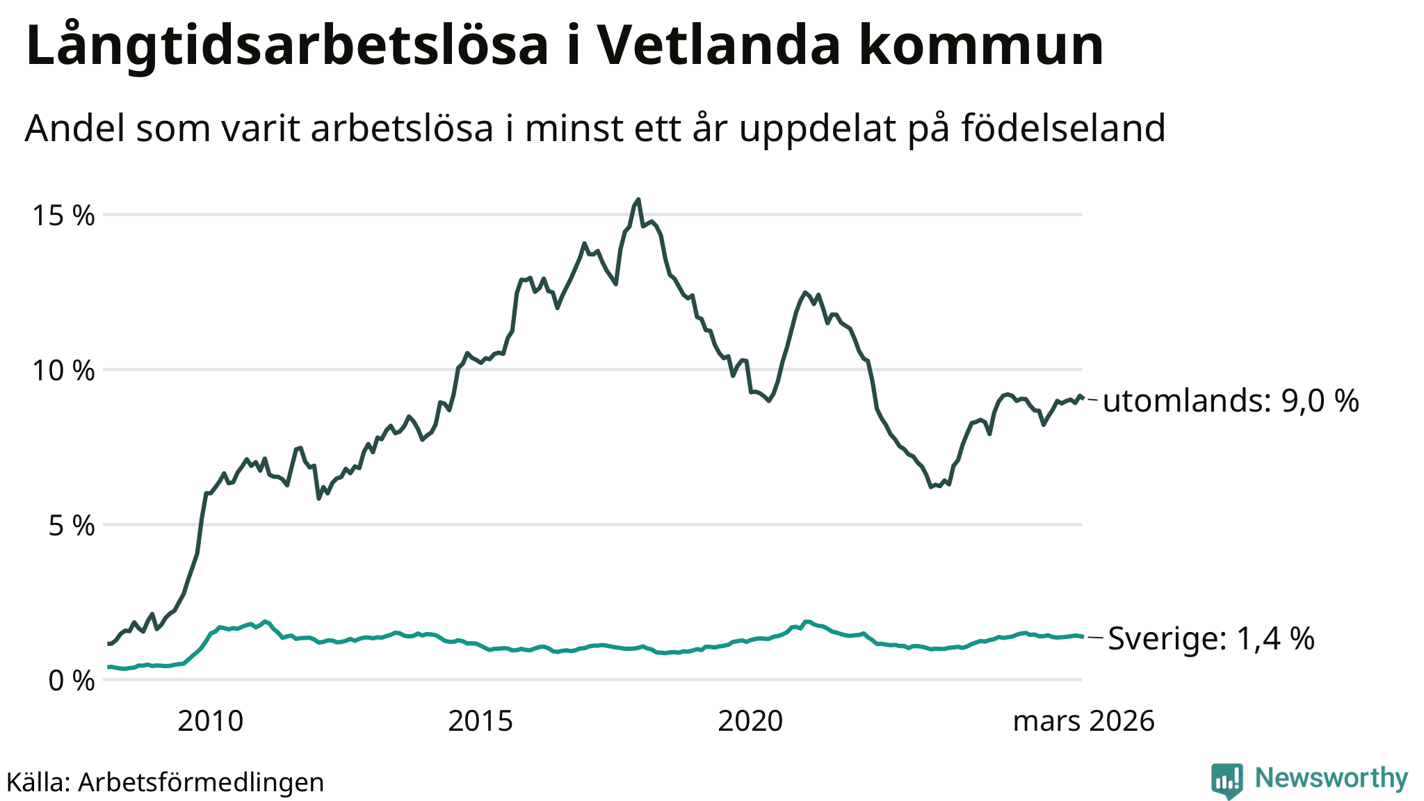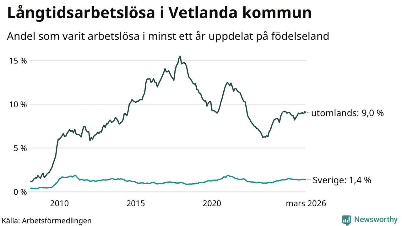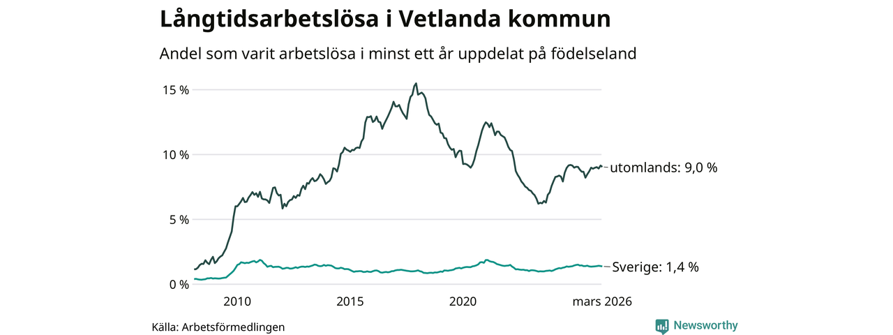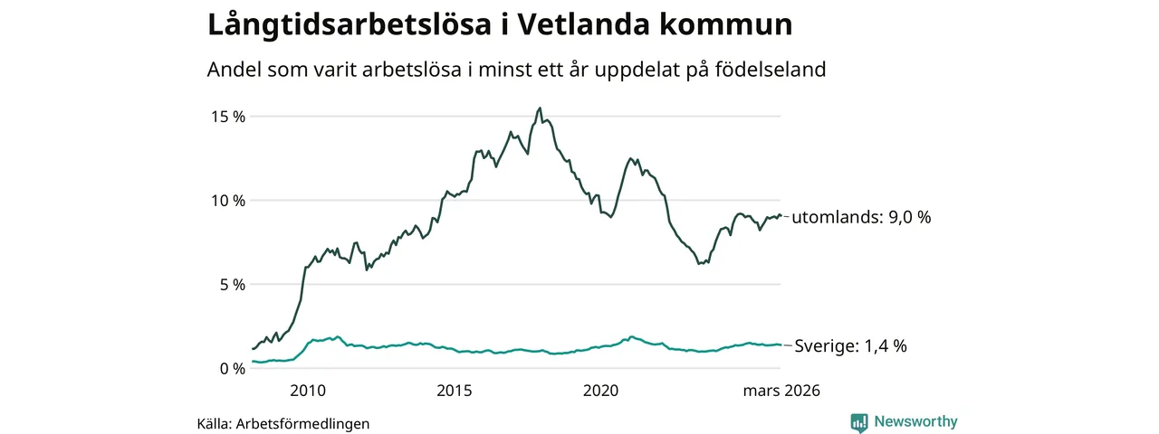 143 av de långtidsarbetslösa i Vetlanda är födda i Sverige, medan 244 är födda utomlands. Det innebär att långtidsarbetslösheten bland Sverigefödda är 1,4 procent, medan den är sex gånger så hög – 9,0 procent – bland födda utomlands. Även i riket som helhet är arbetslösheten högre bland utrikesfödda.