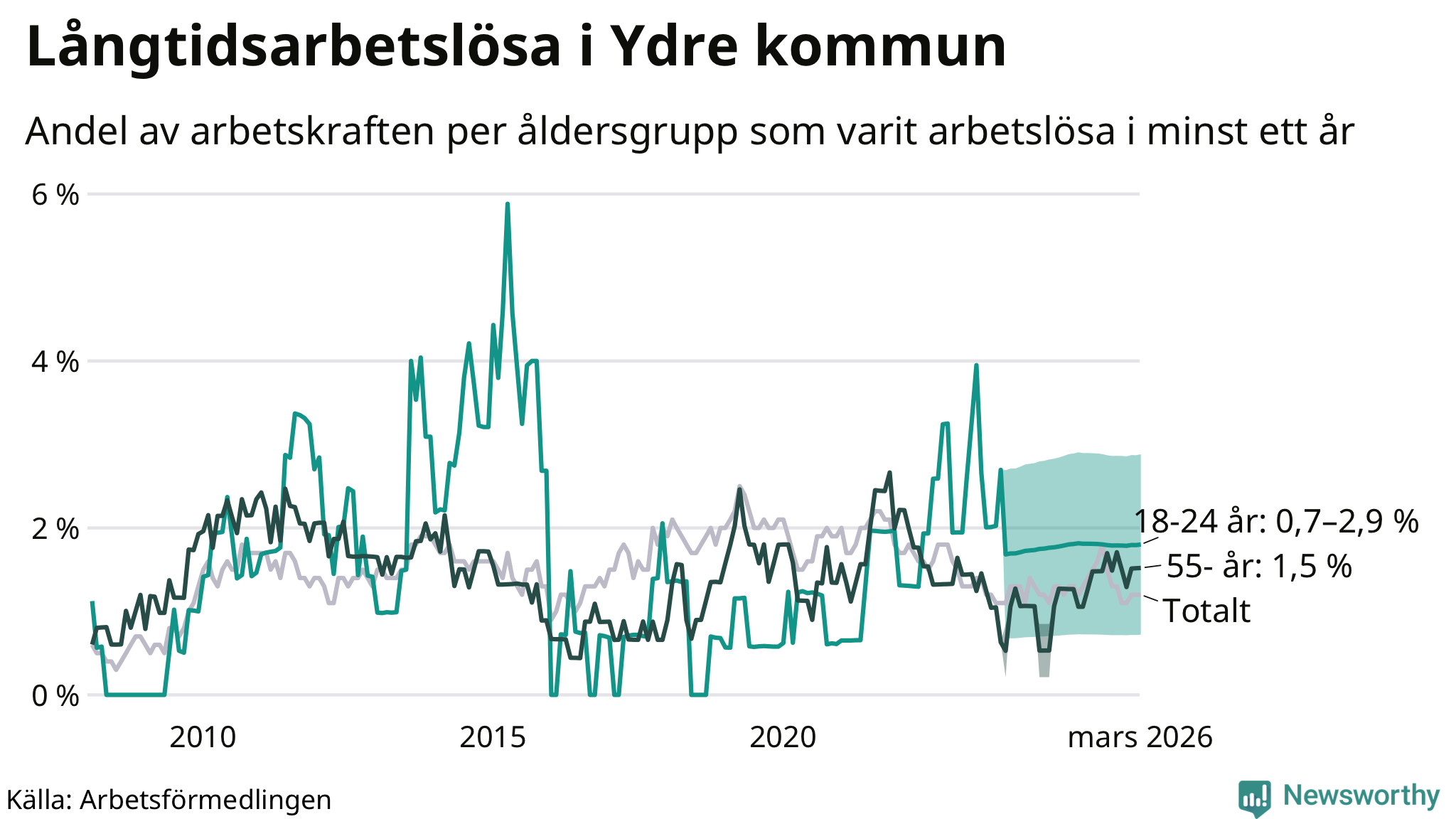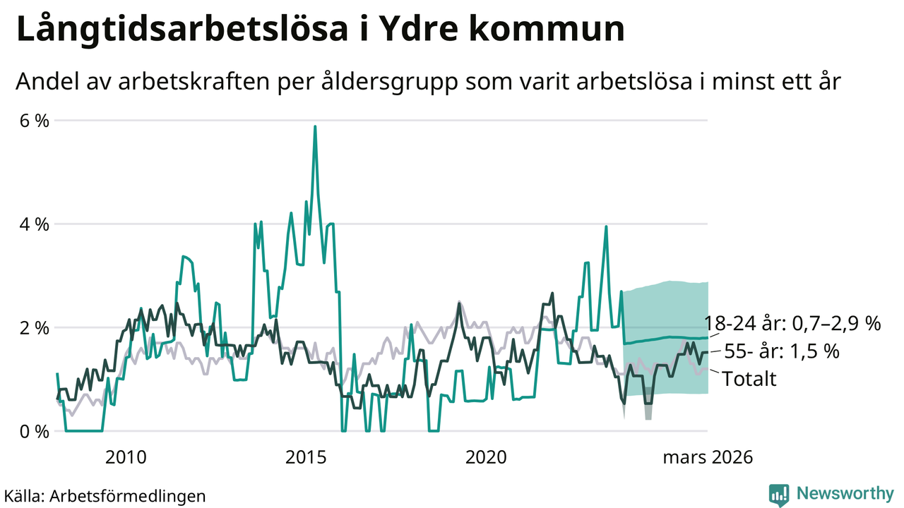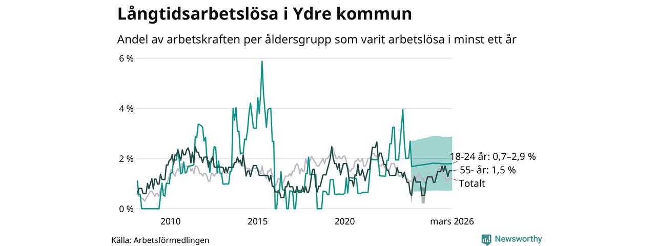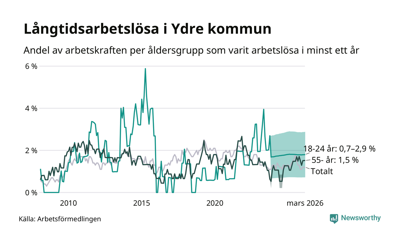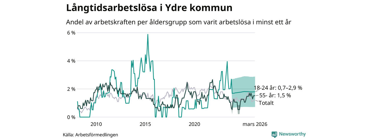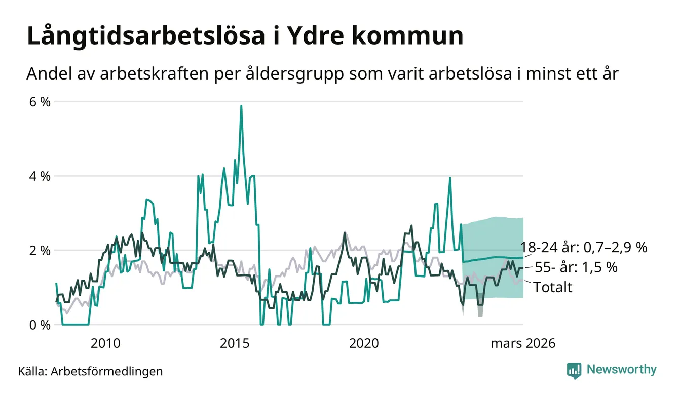 Av de 19 personerna som varit arbetslösa i mer än ett år i Ydre kommun är sju personer mellan 55 och 661 år och mellan en och fyra är mellan 18 och 24 år. För den äldre gruppen är andelen arbetslösa 1,5 procent medan den i den yngre gruppen är mellan 0,7 och 2,9 procent. Även i riket som helhet är långtidsarbetslösheten högre i gruppen äldre.