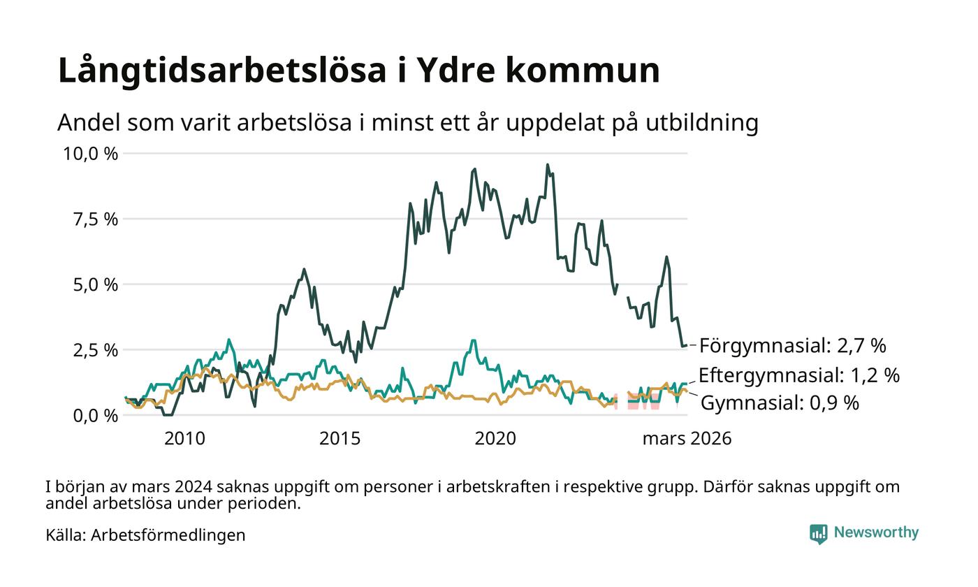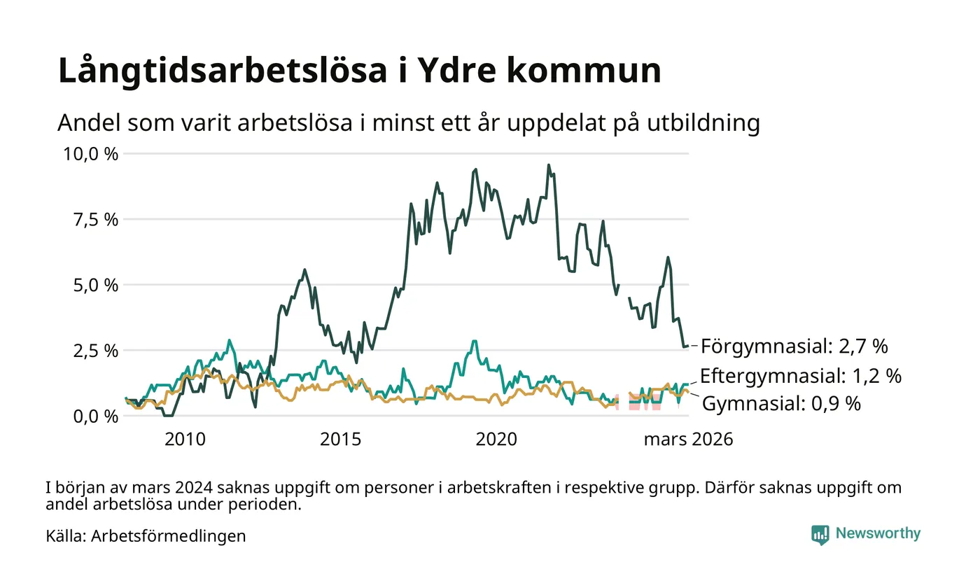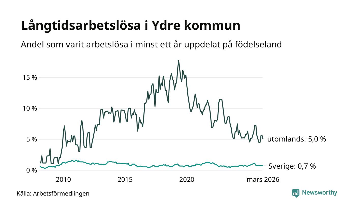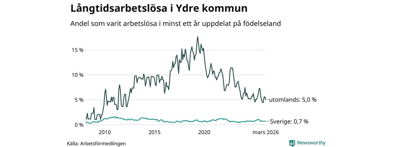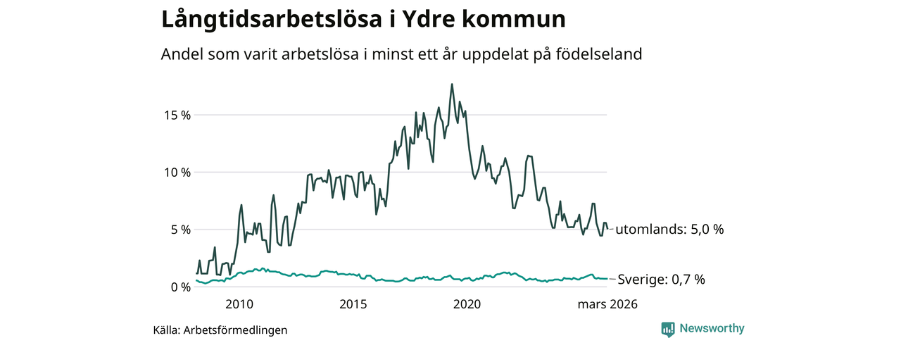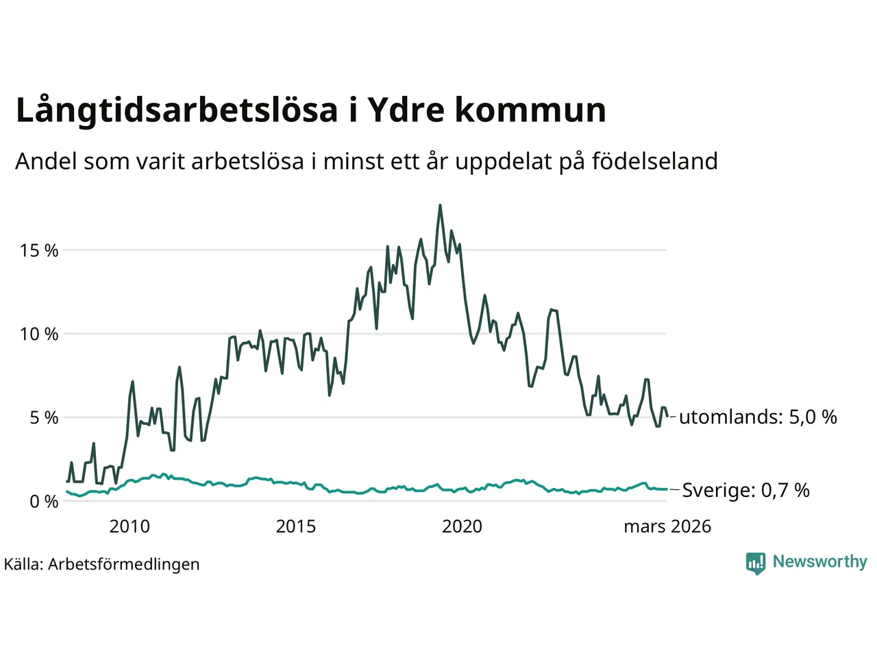 Andelen långtidsarbetslösa i Ydre är den lägsta i Östergötlands län. I Norrköping finns länets högsta långtidsarbetslöshet, 4,5 procent. I Östergötland som helhet hade 7 695 personer (3,2 procent) varit arbetslösa i minst ett år i mars. Det är 42 personer färre än månaden innan.