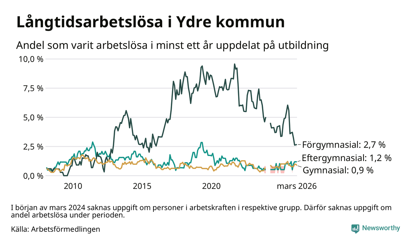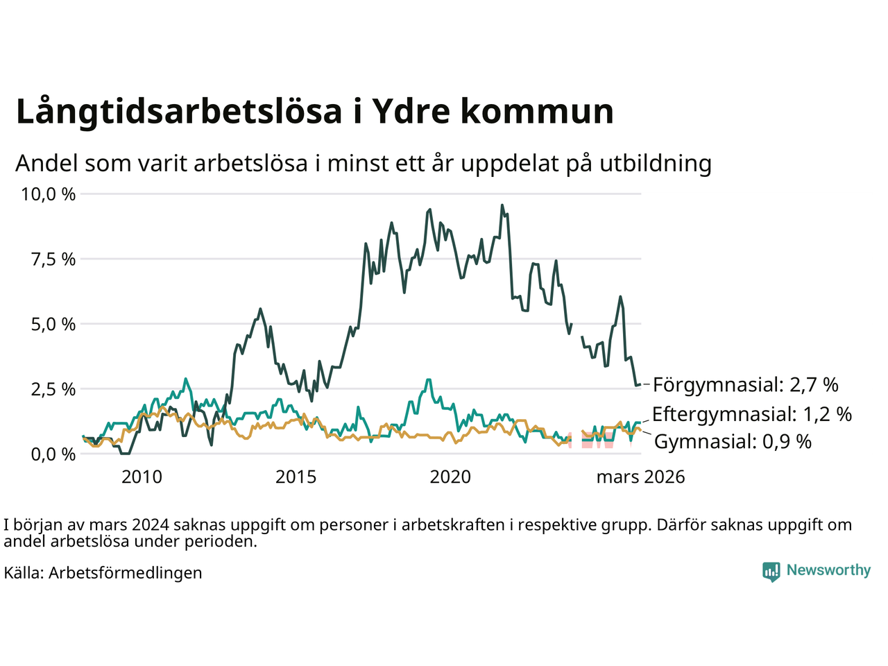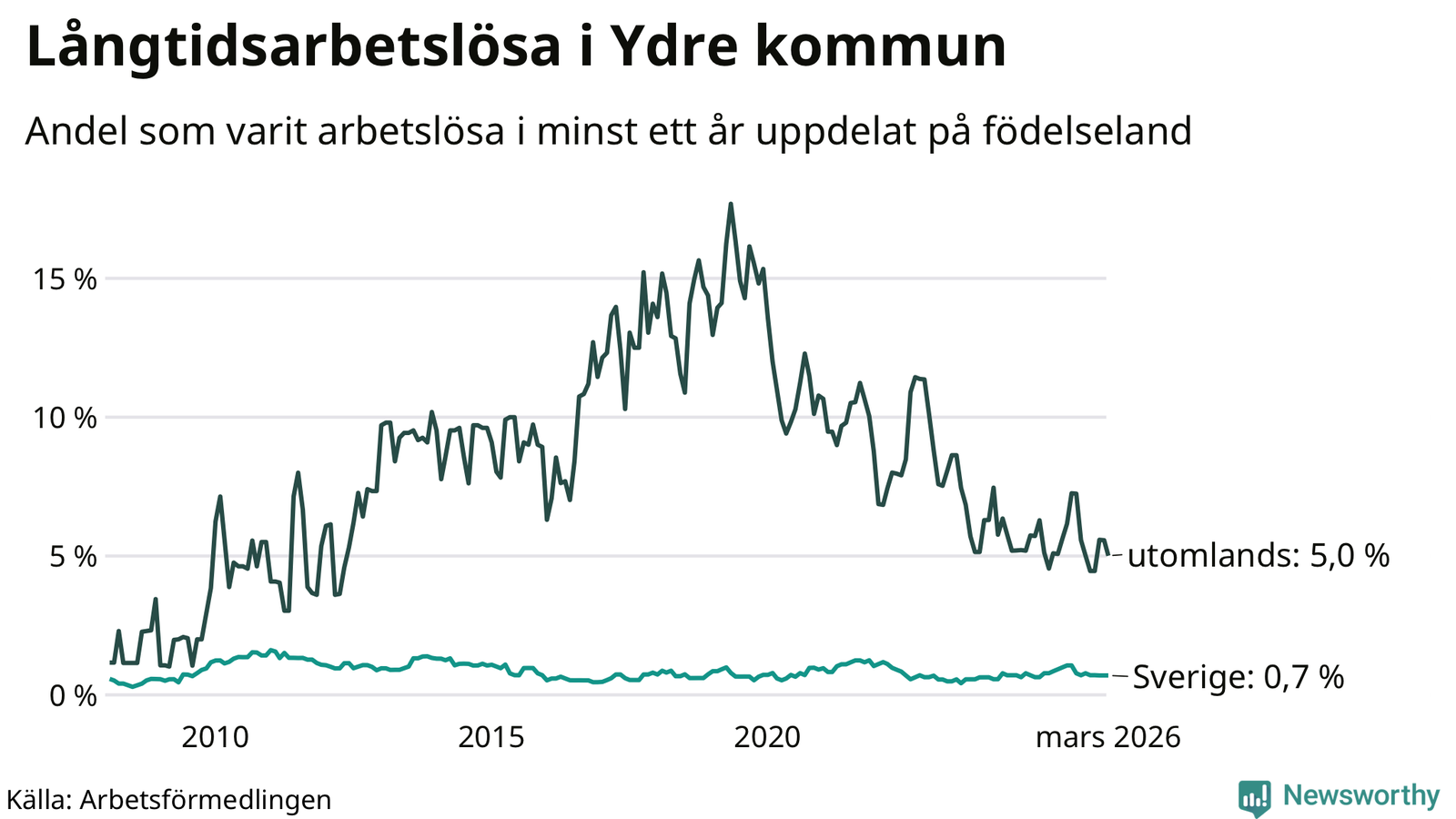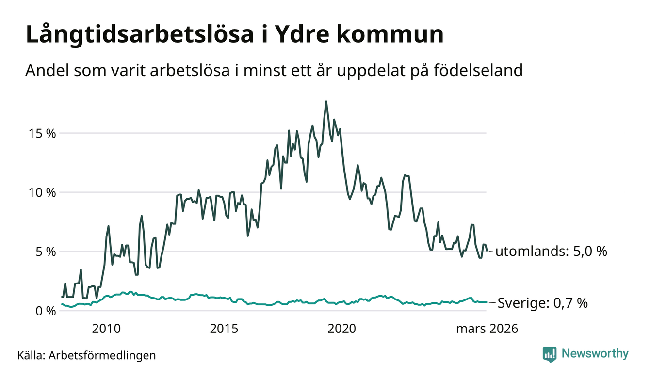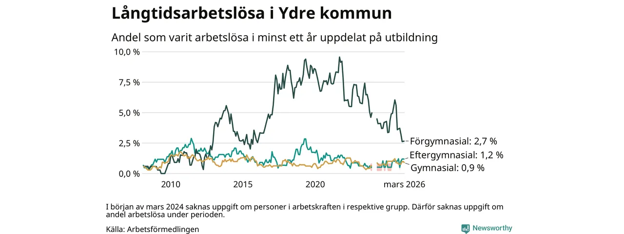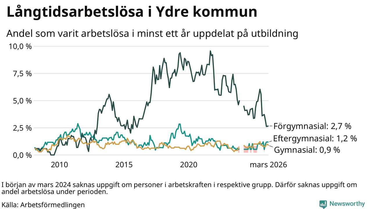 Andelen långtidsarbetslösa i Ydre är den lägsta i Östergötlands län. I Norrköping finns länets högsta långtidsarbetslöshet, 4,5 procent. I Östergötland som helhet hade 7 695 personer (3,2 procent) varit arbetslösa i minst ett år i mars. Det är 42 personer färre än månaden innan.