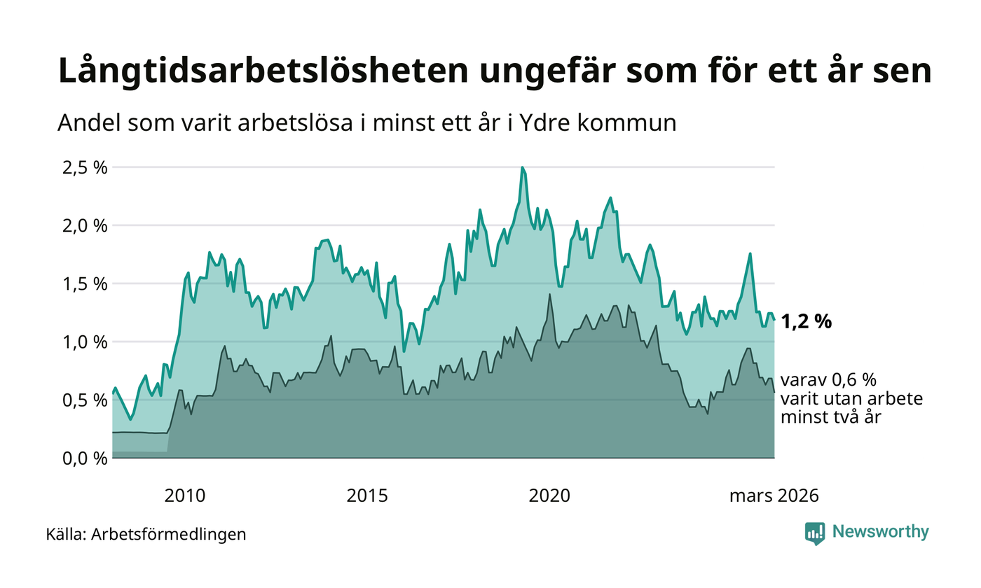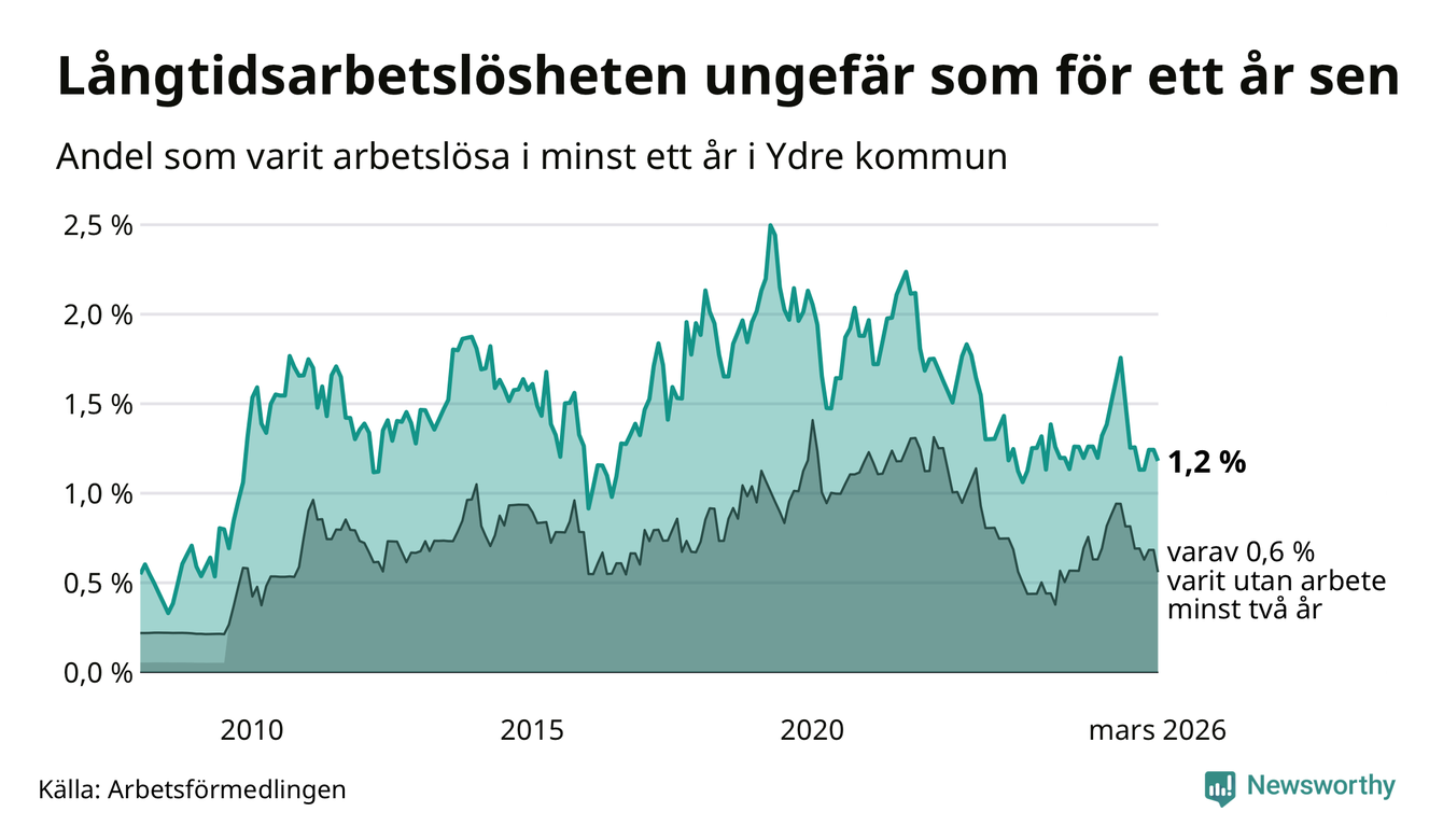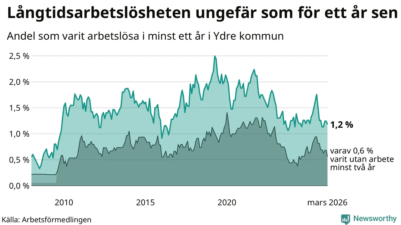 Andelen som varit utan arbete i minst ett år i Ydre var ungefär lika stor i mars jämfört med samma månad för ett år sedan. Det visar Arbetsfömedlingens senaste månadsstatistik.
