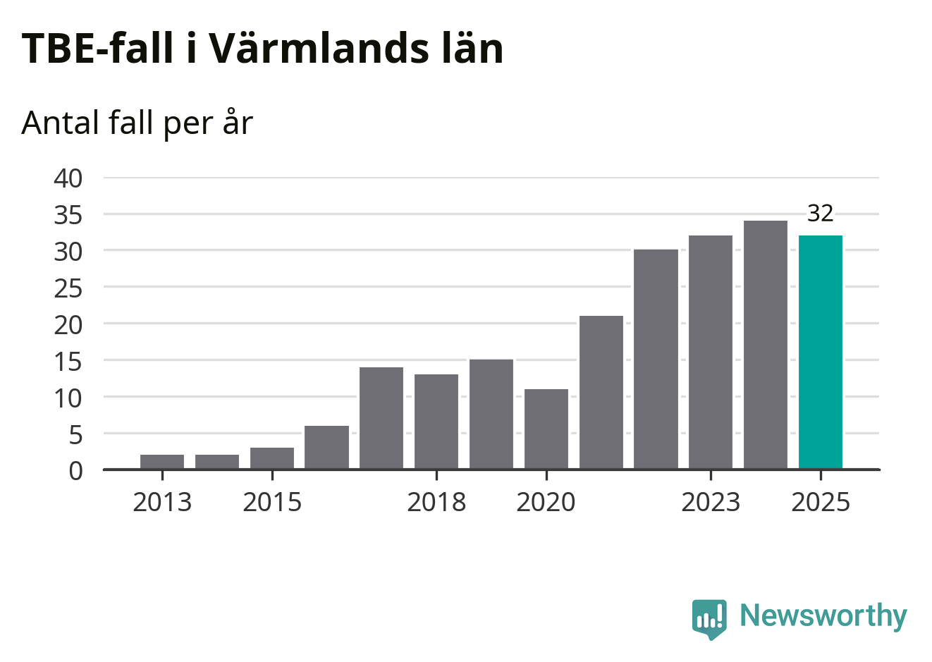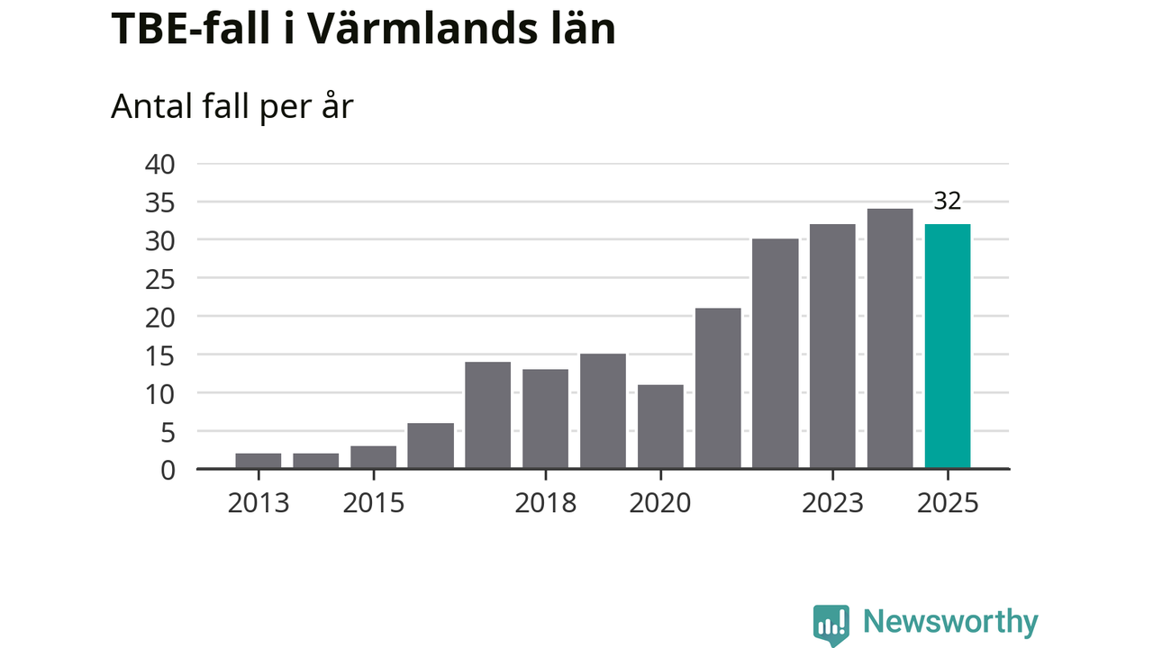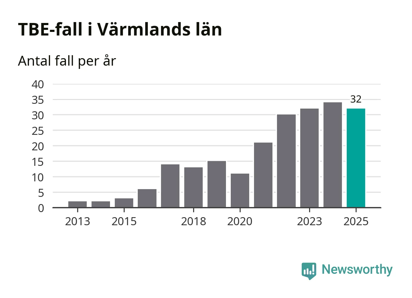 Den långsiktiga trenden är däremot tydlig. TBE-fallen blir allt fler i Sverige. Sett över tid har antalet anmälda fall i landet som helhet ökat med drygt sex procent per år sedan 2013. Totalt motsvarar det en ökning på 141 procent om vi jämför 2013 med 2025 års siffror.
