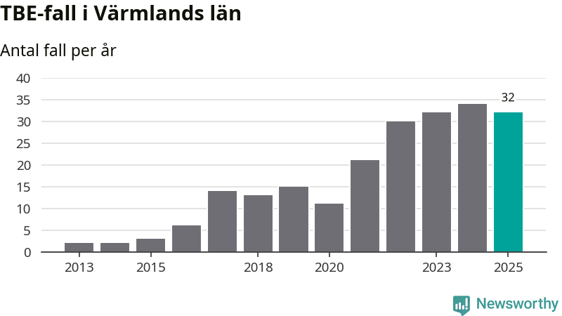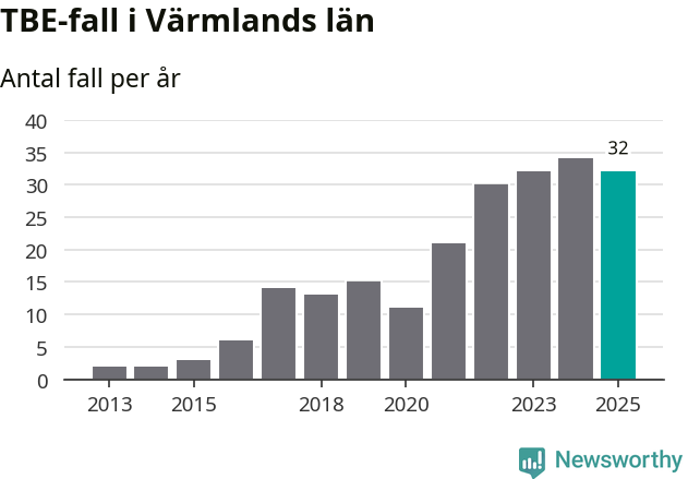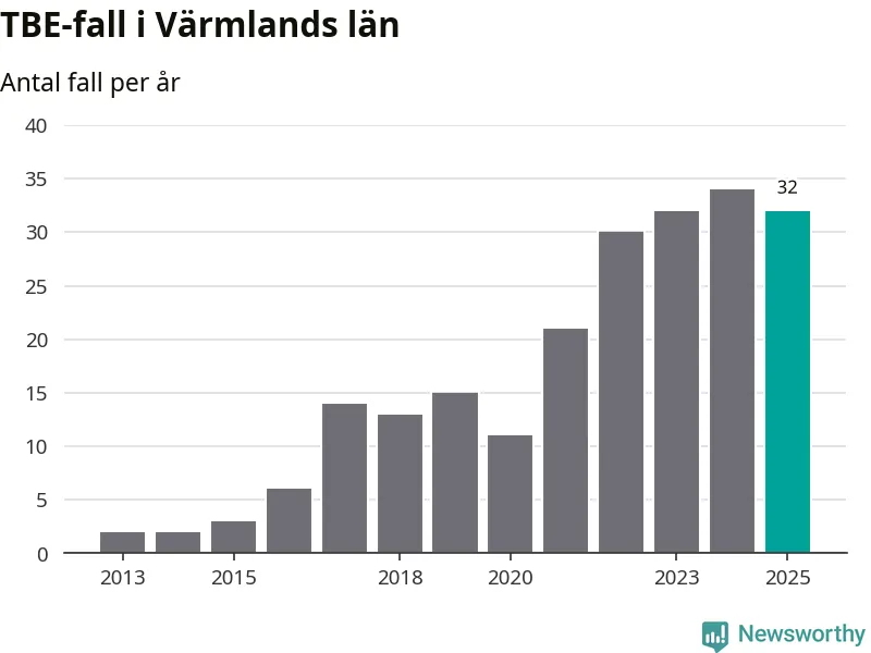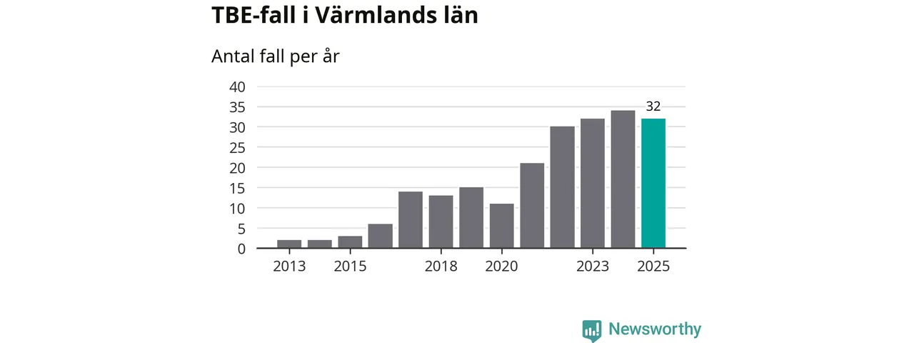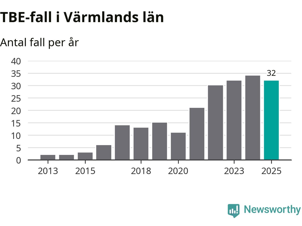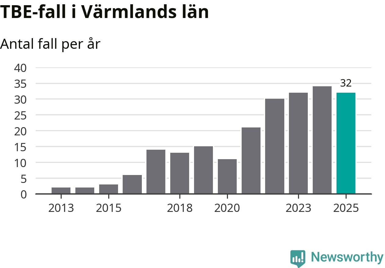 Den långsiktiga trenden är däremot tydlig. TBE-fallen blir allt fler i Sverige. Sett över tid har antalet anmälda fall i landet som helhet ökat med drygt sex procent per år sedan 2013. Totalt motsvarar det en ökning på 141 procent om vi jämför 2013 med 2025 års siffror.